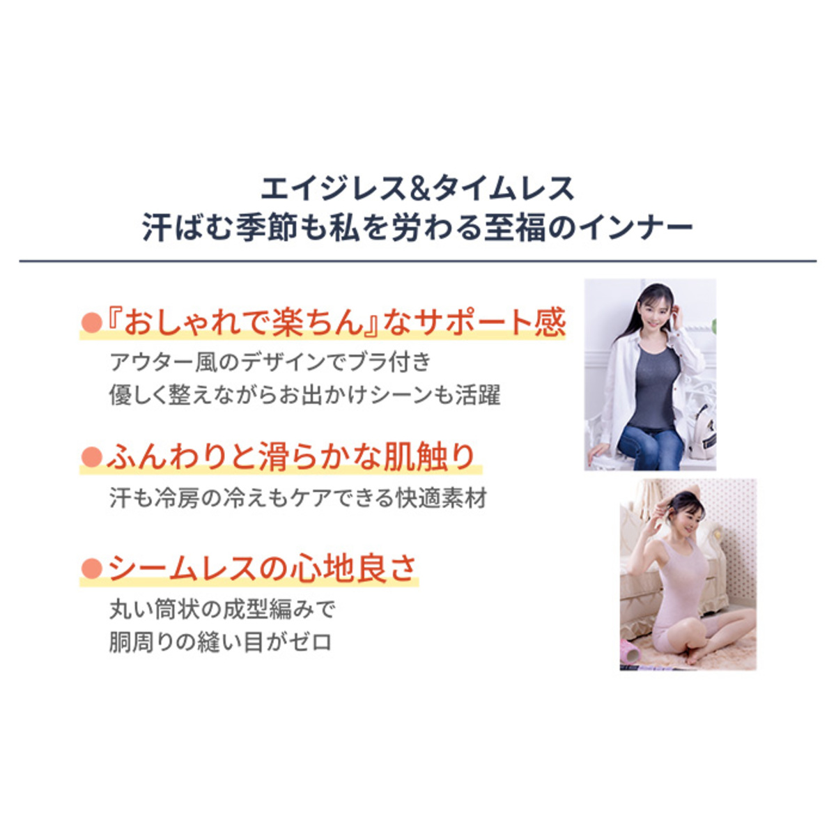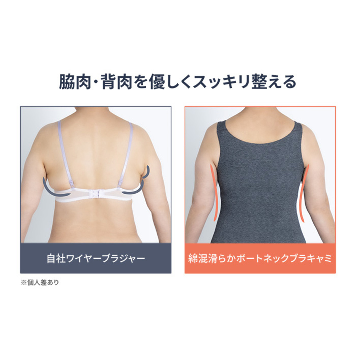 ノンワイヤーブラとソフトシェイパー、そしてアウター感覚のデザインのキャミソール、3役が1枚に詰まったアイテム。ボートネックは見えてもお洒落で、タンクトップ感覚でシャツやカットソーを羽織ればお出掛けスタイルに。立体成型の特性を活かし、ワイヤーやボーン、ホックなどの金具類を一切使用していません