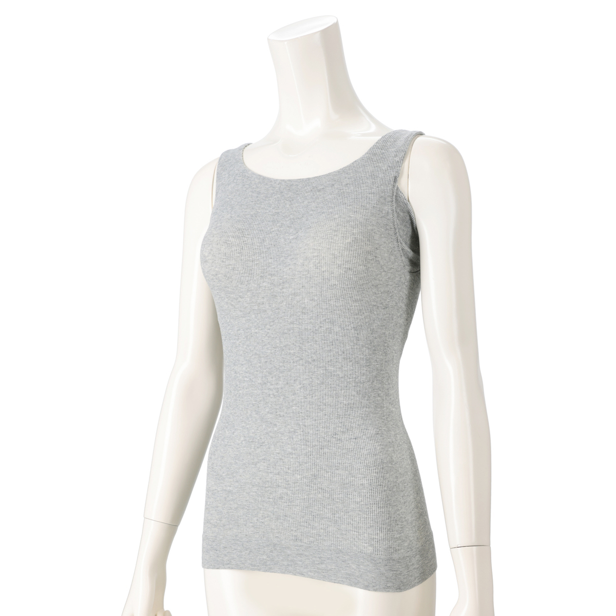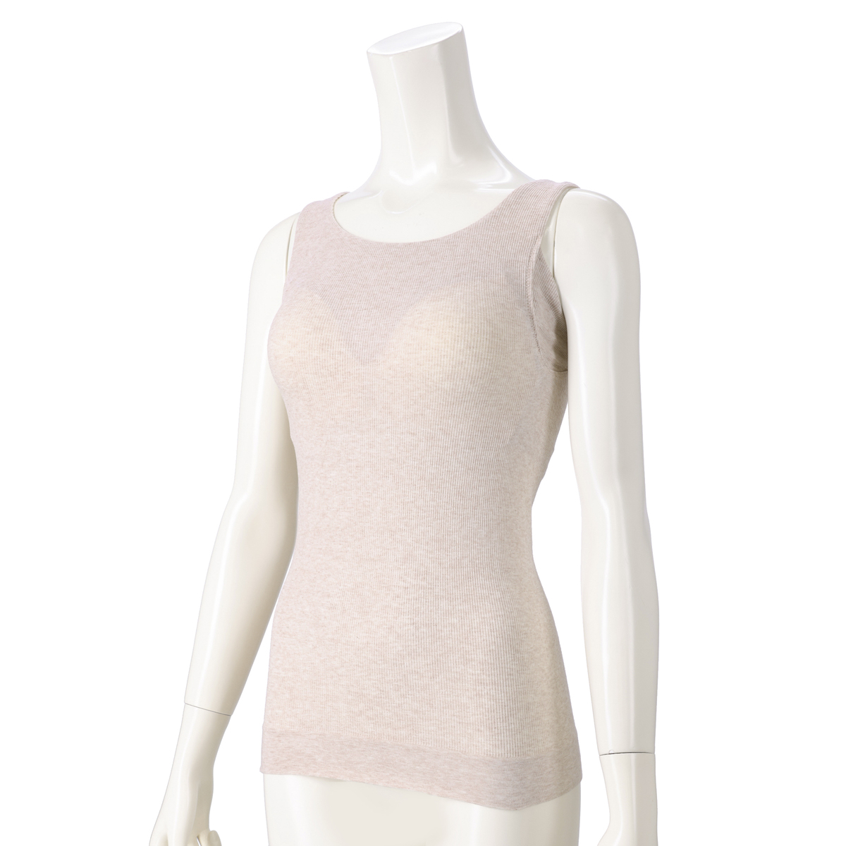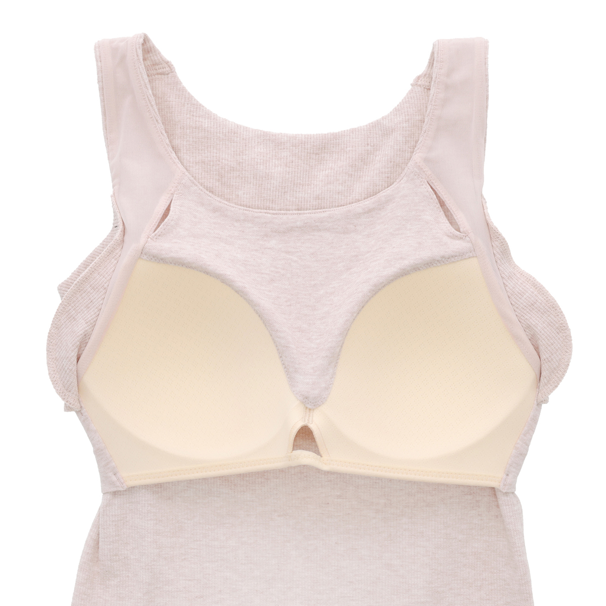 身頃の肌側(内側)の編地にモールドカップのブラを内蔵させた一体型。表の編地と2重のパワーでバストから背中までぐるっとサポート。背筋もスッキリで、下辺(アンダー)を身頃に縫い付けないフラシ仕上げなので、身体の動きにフィットしやすく快適です