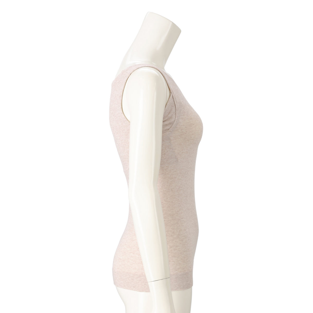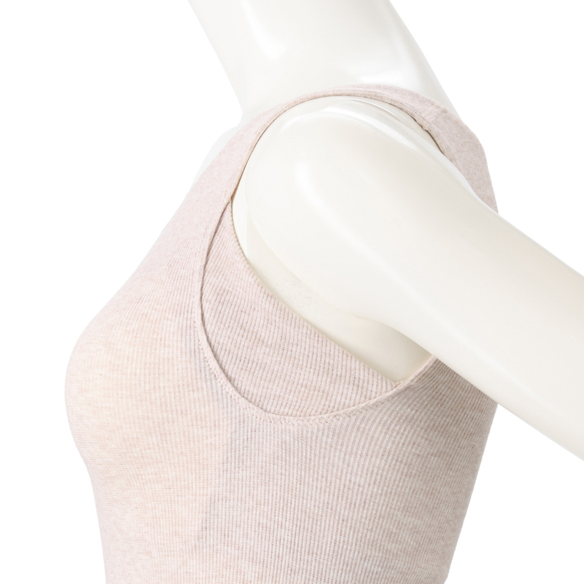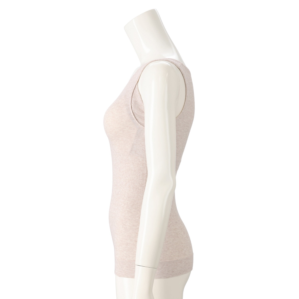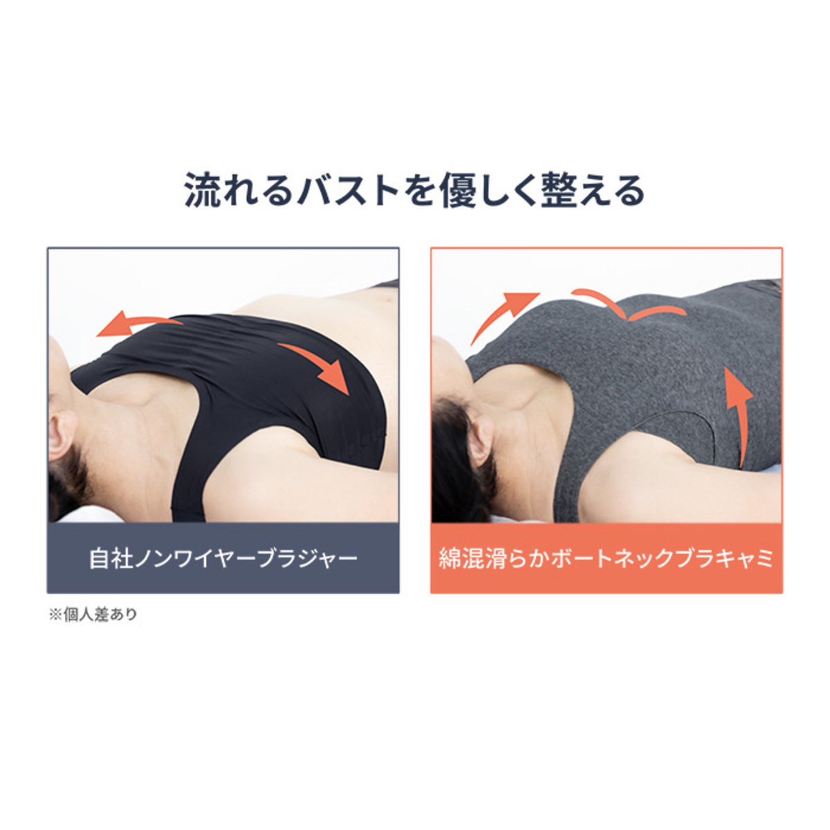 身頃の肌側(内側)の編地にモールドカップのブラを内蔵させた一体型。表の編地と2重のパワーでバストから背中までぐるっとサポート。背筋もスッキリで、下辺(アンダー)を身頃に縫い付けないフラシ仕上げなので、身体の動きにフィットしやすく快適です