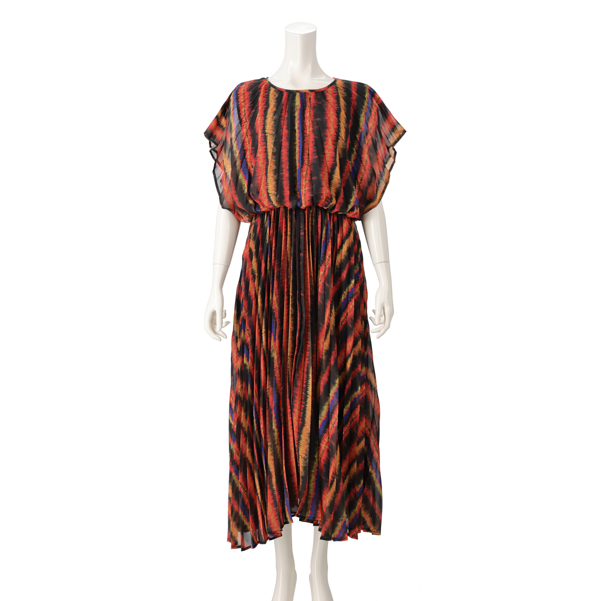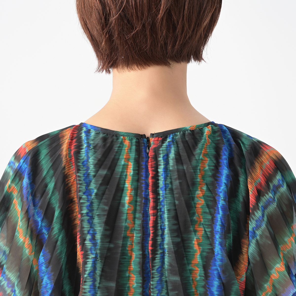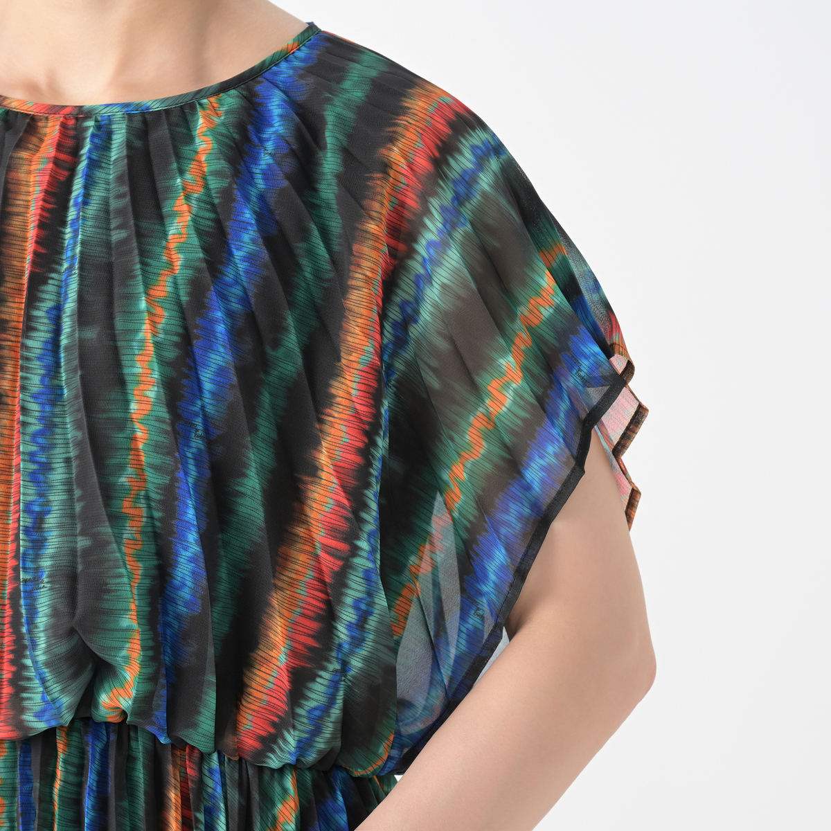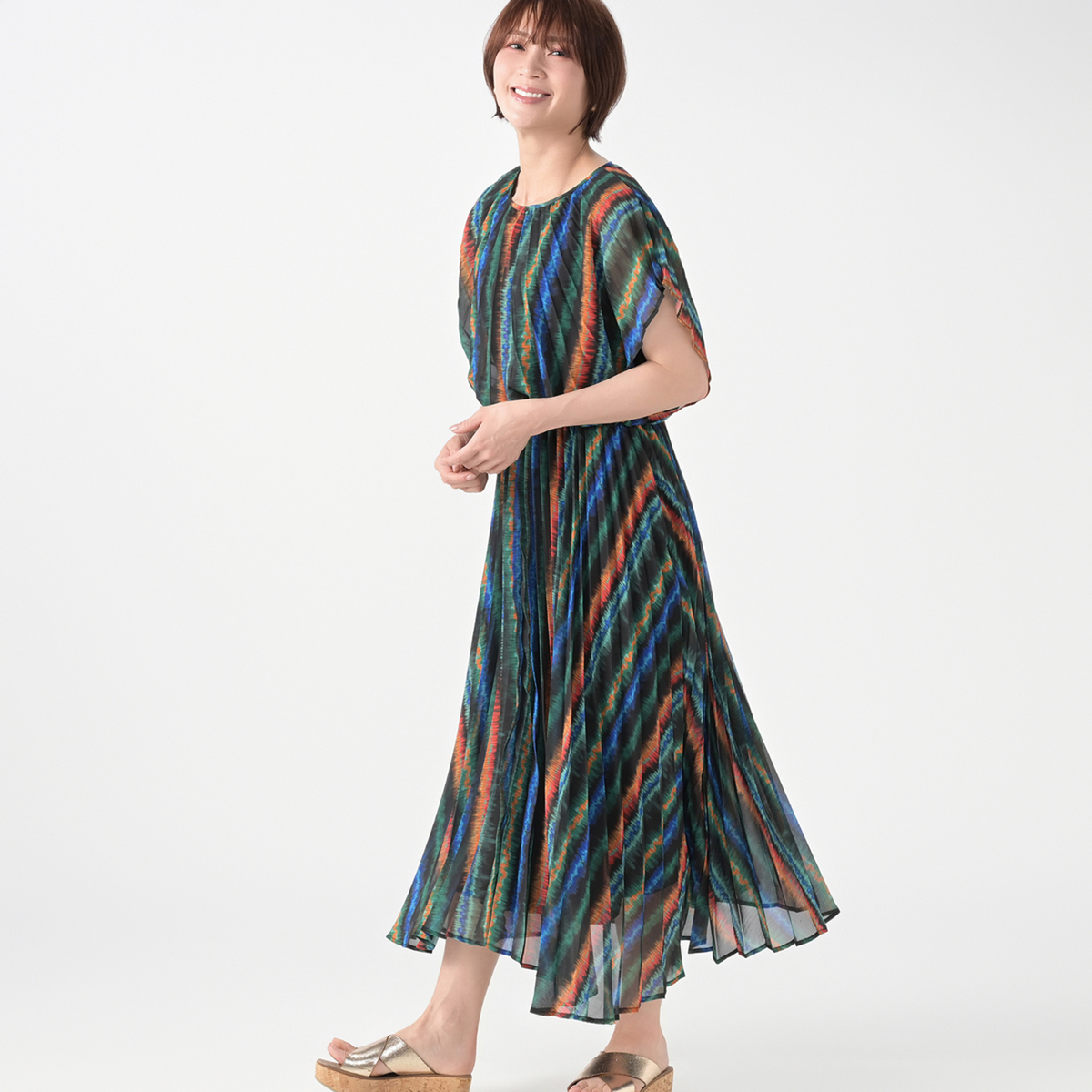 デザイナーが描いたタイダイ風ストライプを、軽やかでシアーなシフォンにインクジェットプリント。上半身、スカート部分にはアコーディオンプリーツを。すっきりとしたシルエットに見せてくれます