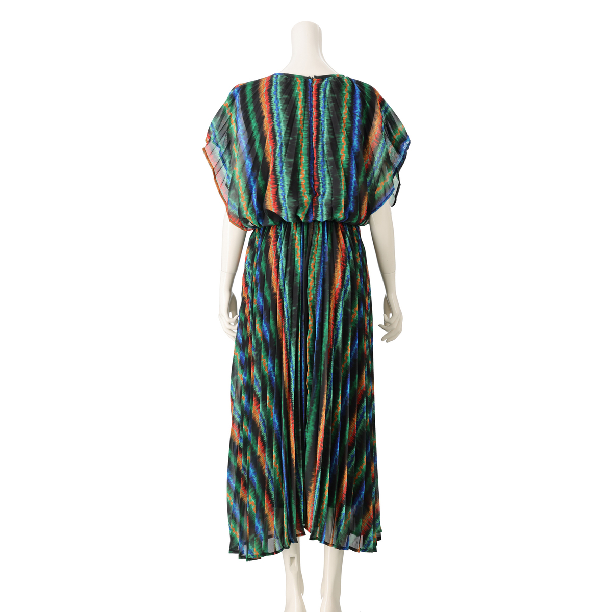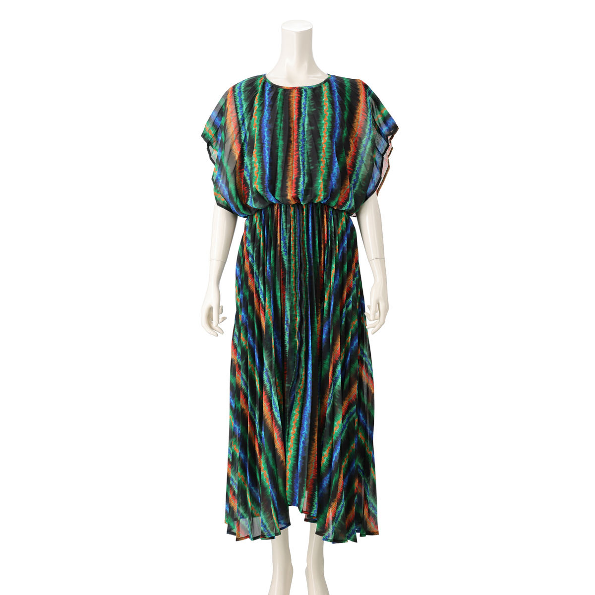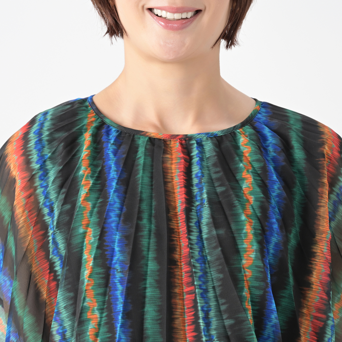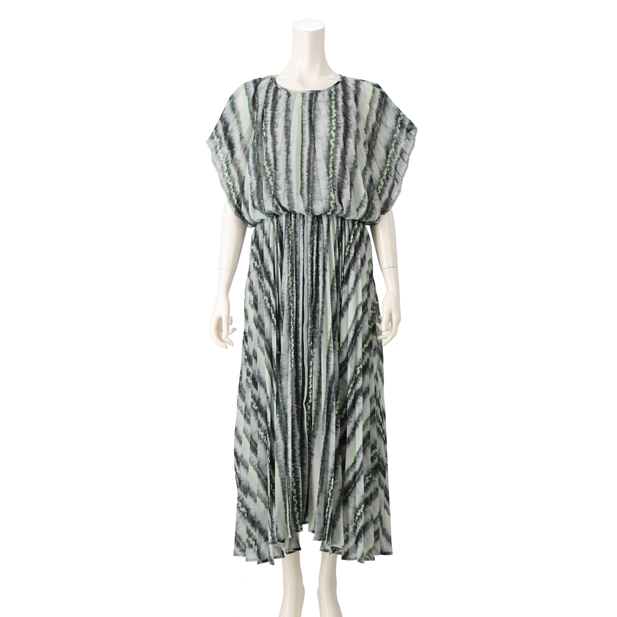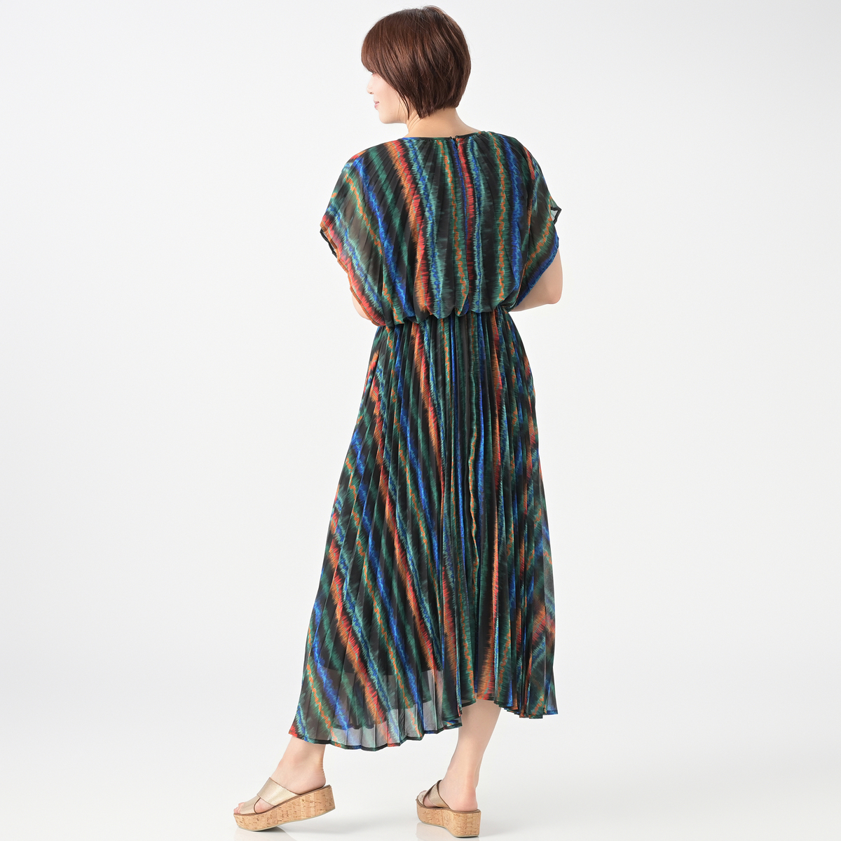 デザイナーが描いたタイダイ風ストライプを、軽やかでシアーなシフォンにインクジェットプリント。上半身、スカート部分にはアコーディオンプリーツを。すっきりとしたシルエットに見せてくれます