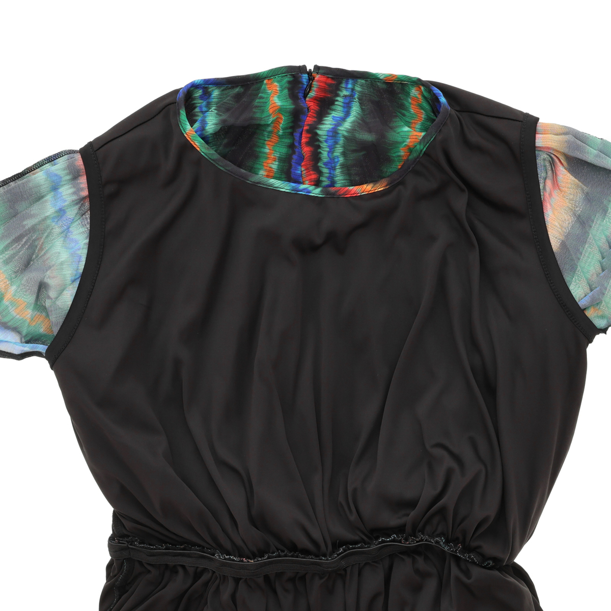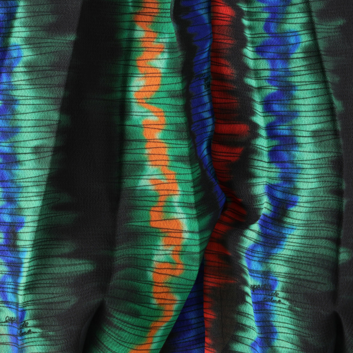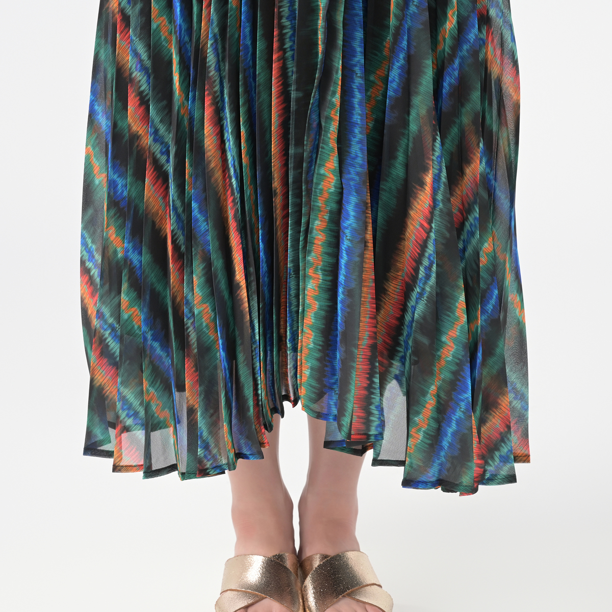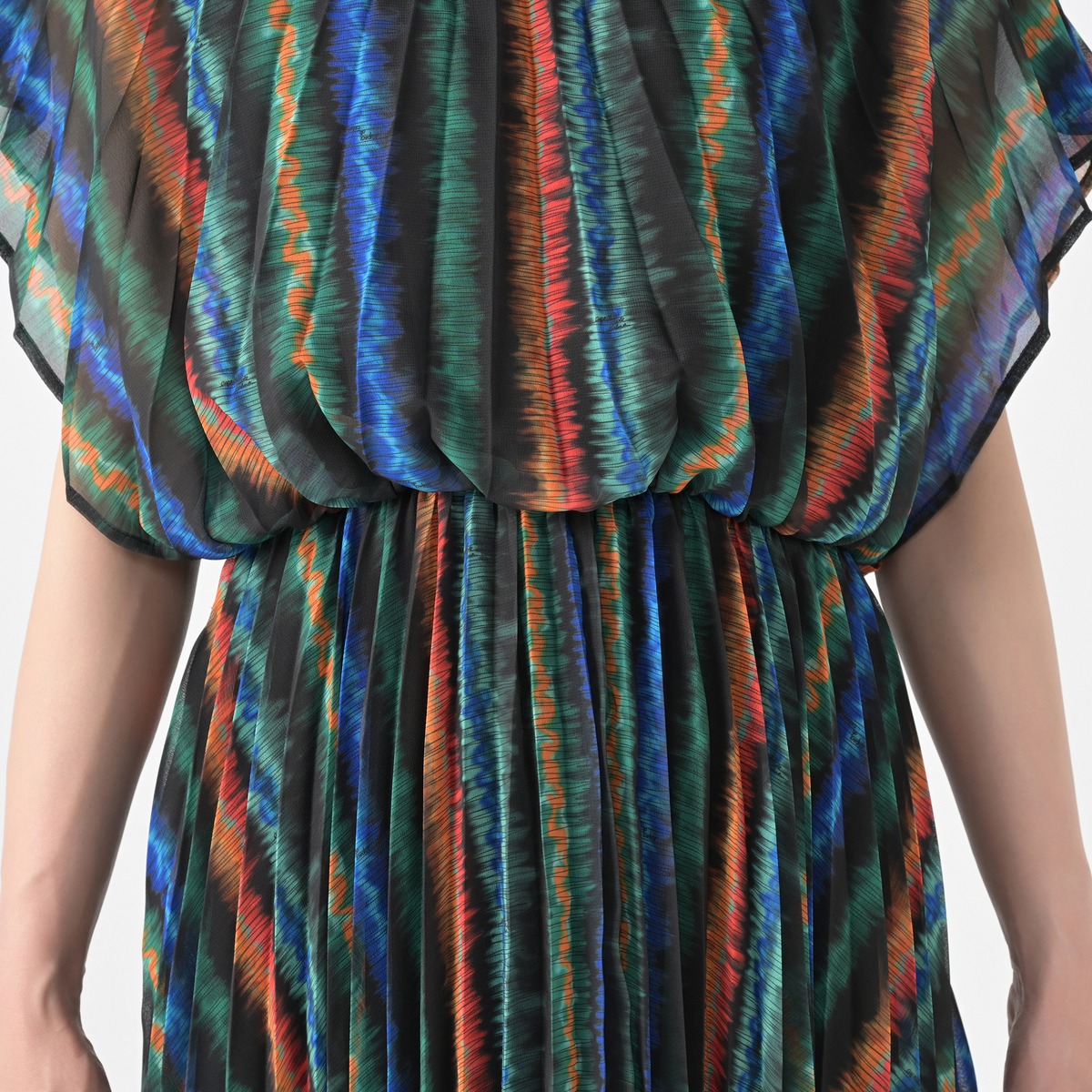 デザイナーが描いたタイダイ風ストライプを、軽やかでシアーなシフォンにインクジェットプリント。上半身、スカート部分にはアコーディオンプリーツを。すっきりとしたシルエットに見せてくれます