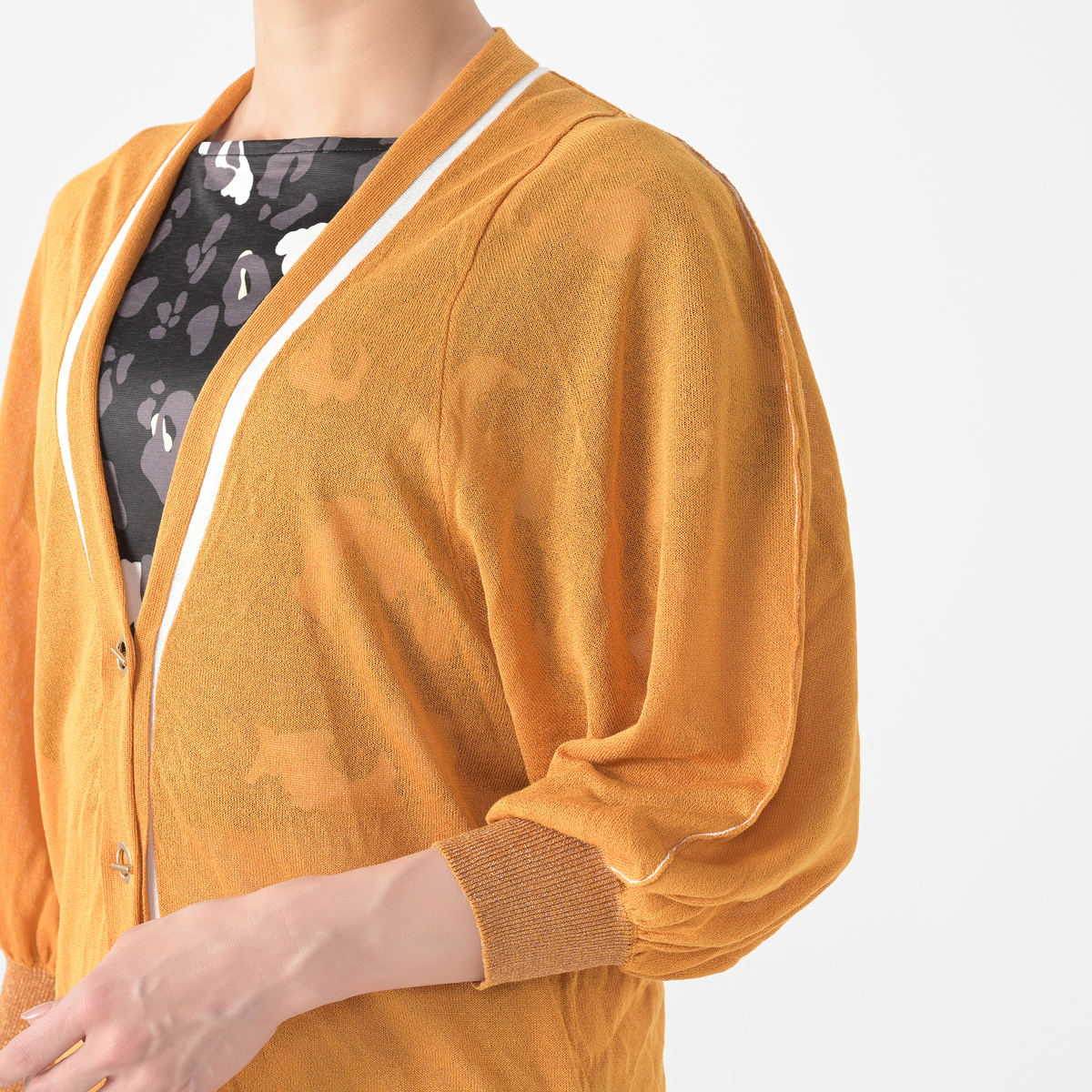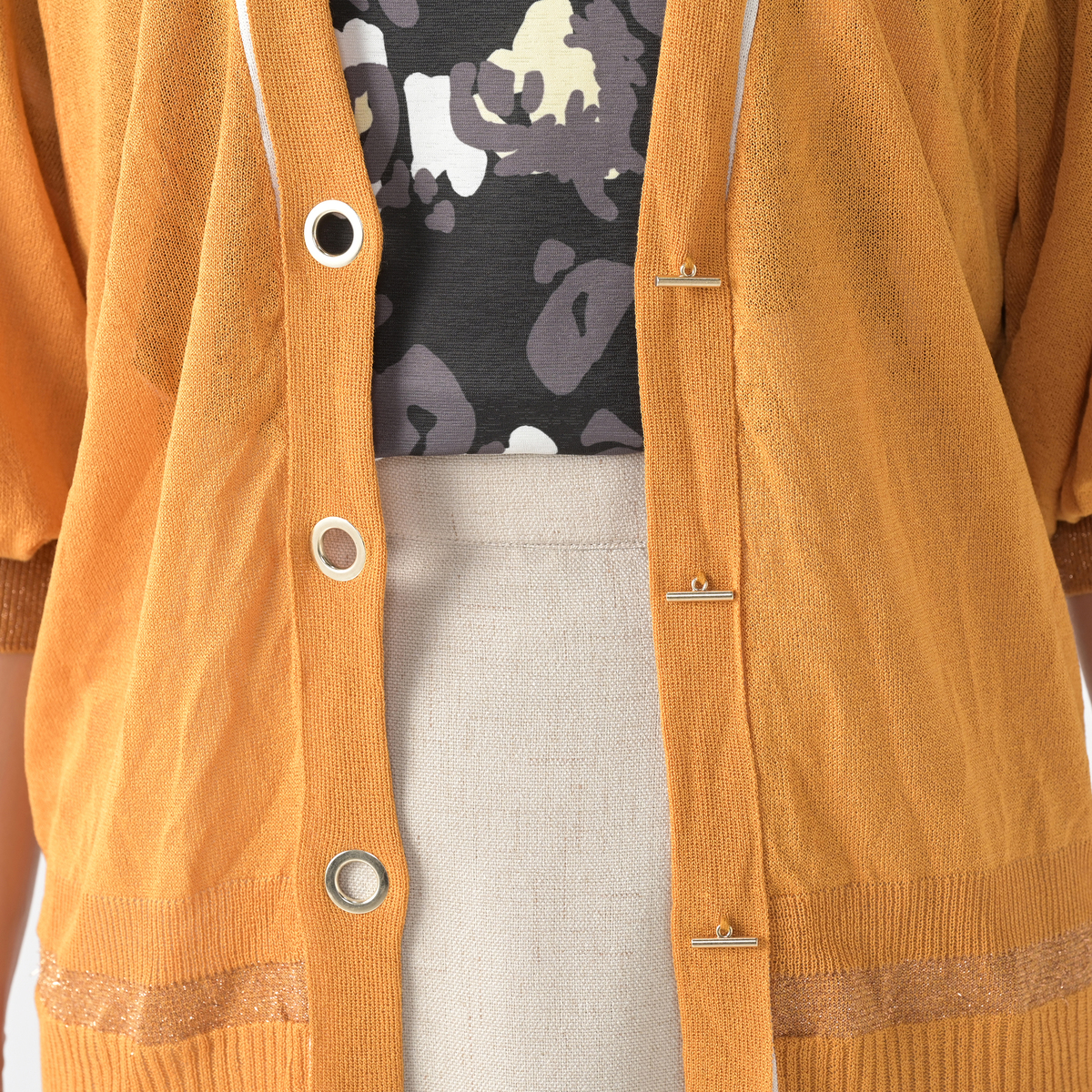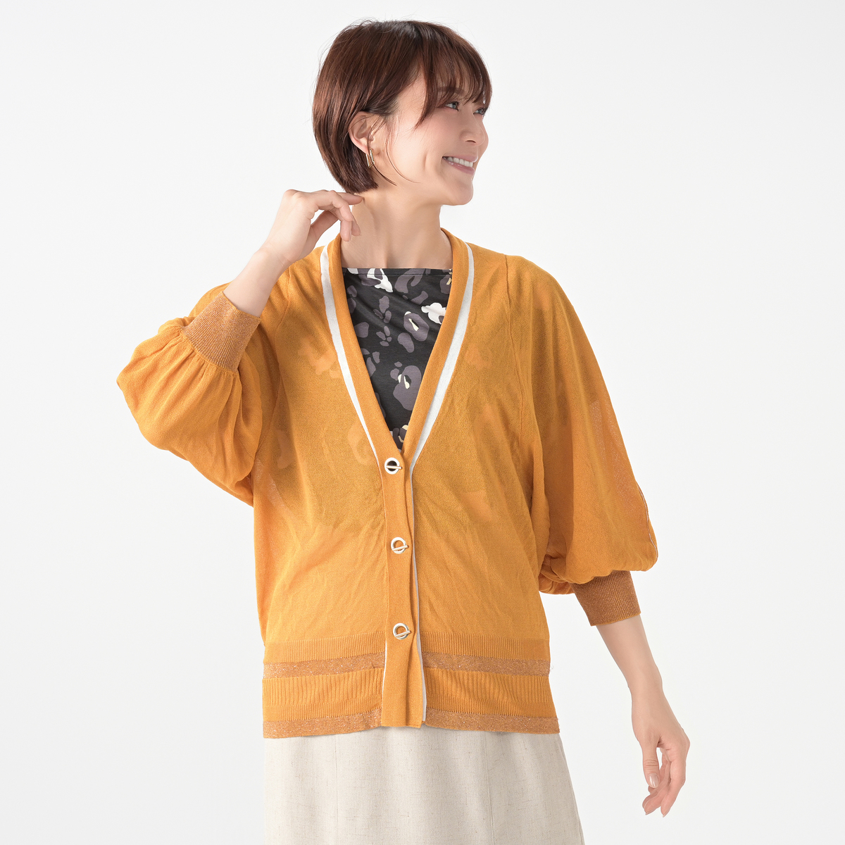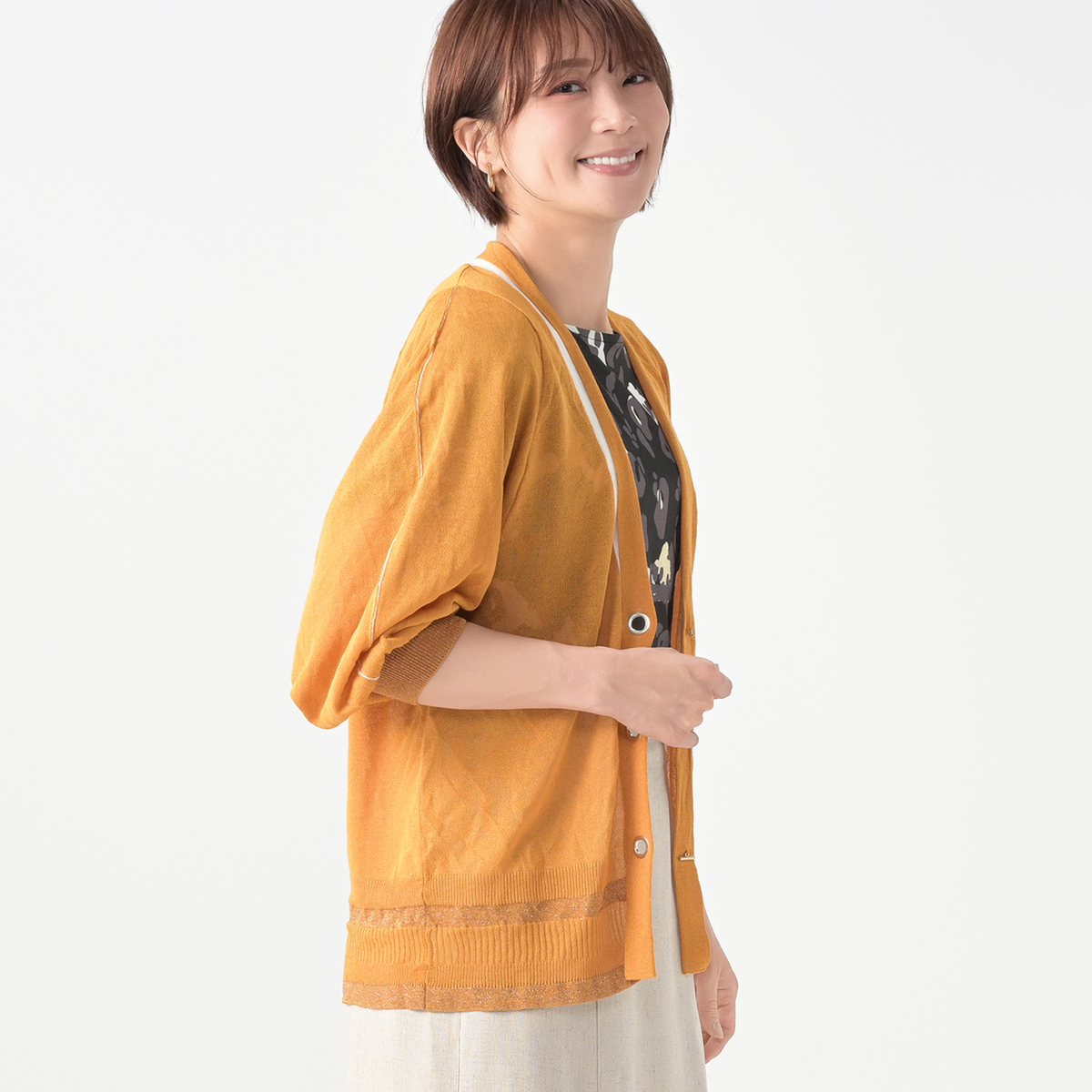 前ボタン側の留め具、裾や手首周りのの上品なラメ使い、襟周りのチラ見せ配色など、私にとって気分が上がるカーディガンです。サラサラ素材で真夏に羽織っても、また晩夏から初秋にも使えます。来年も必ず活躍してくれると思います。これからも穂高サンに付いて行きます!