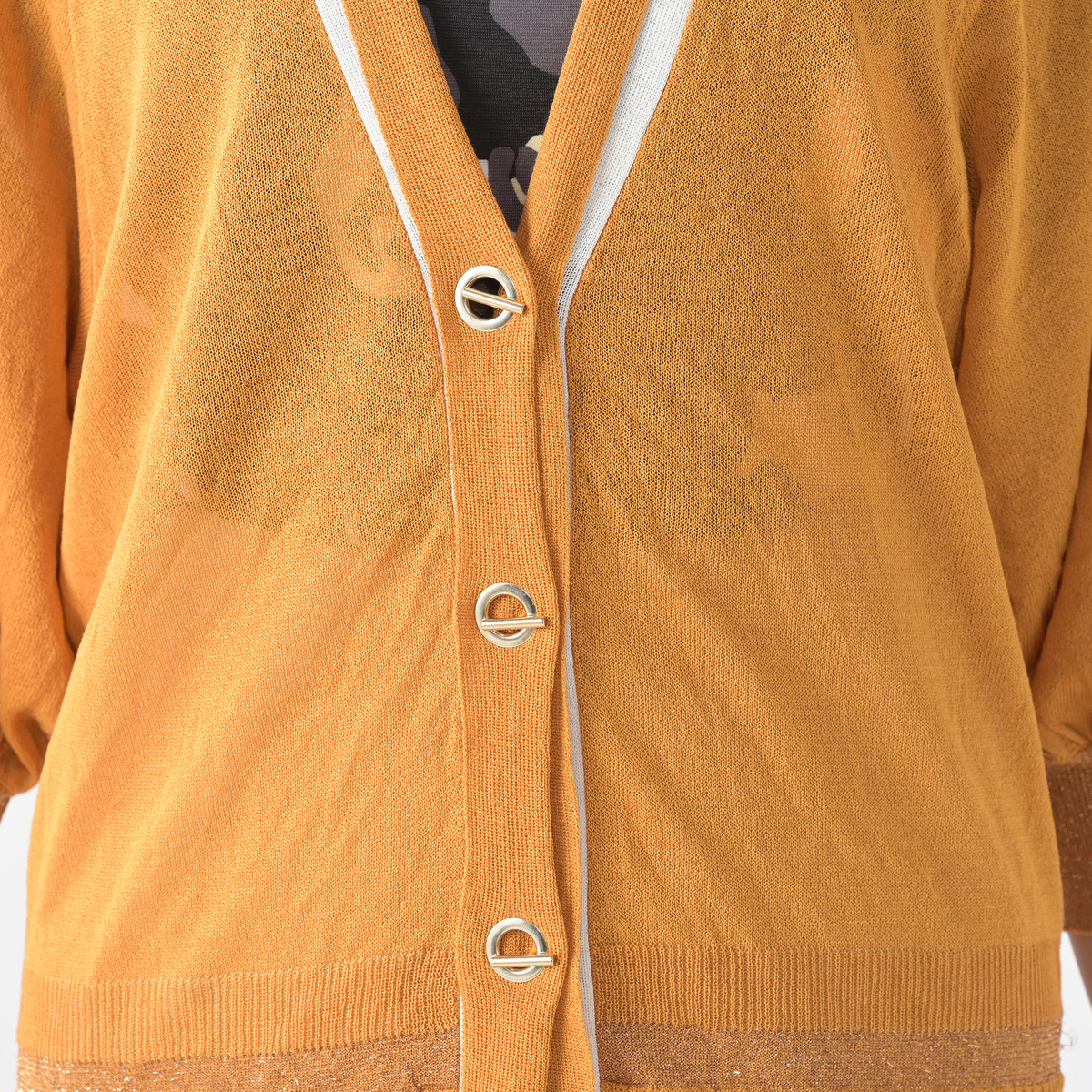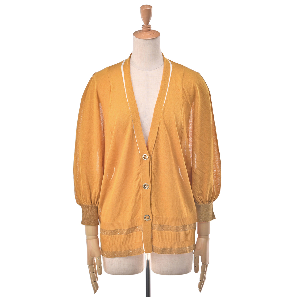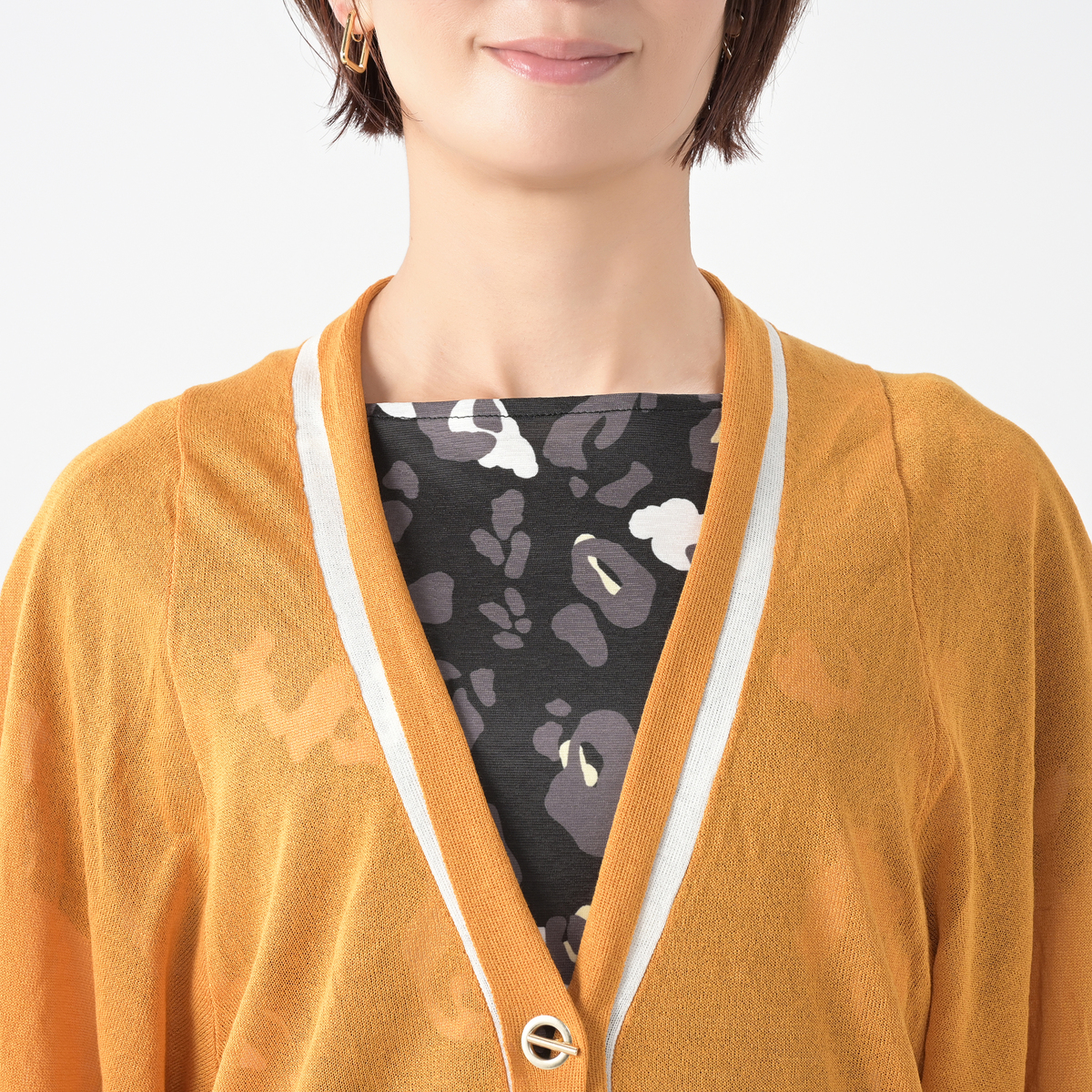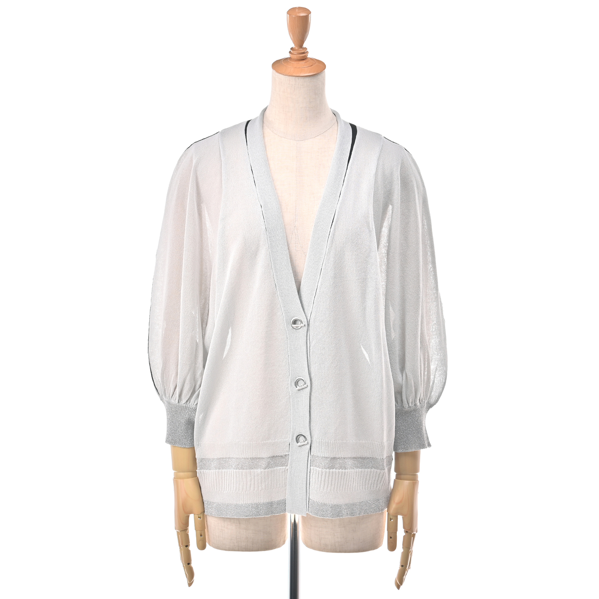 前ボタン側の留め具、裾や手首周りのの上品なラメ使い、襟周りのチラ見せ配色など、私にとって気分が上がるカーディガンです。サラサラ素材で真夏に羽織っても、また晩夏から初秋にも使えます。来年も必ず活躍してくれると思います。これからも穂高サンに付いて行きます!