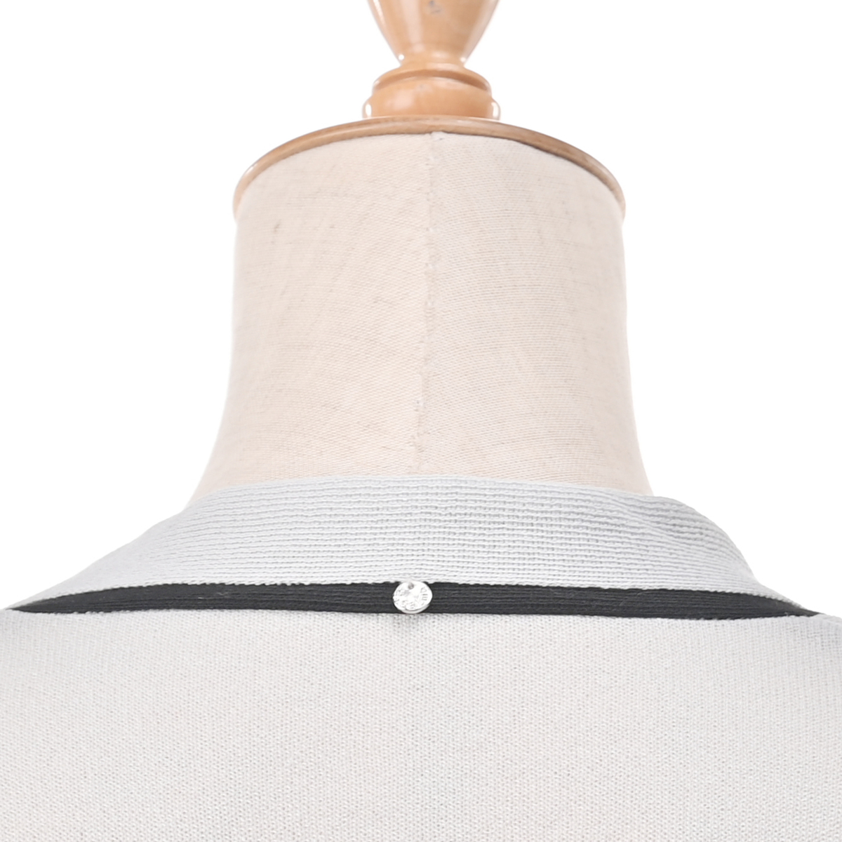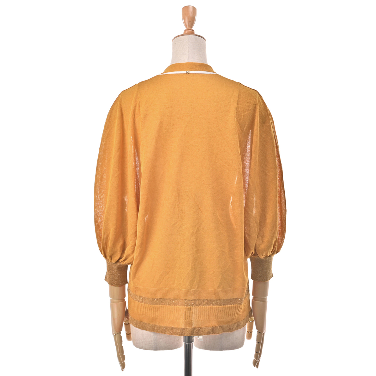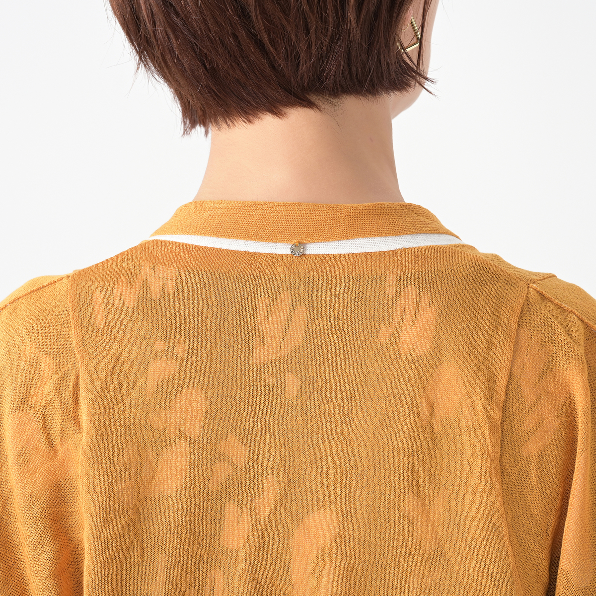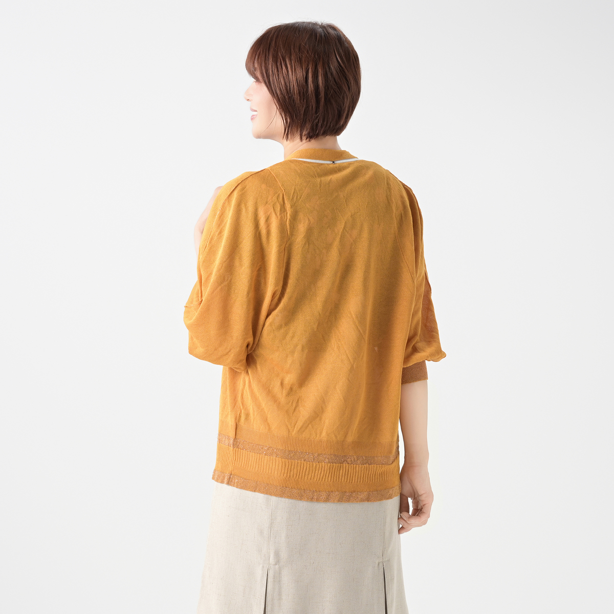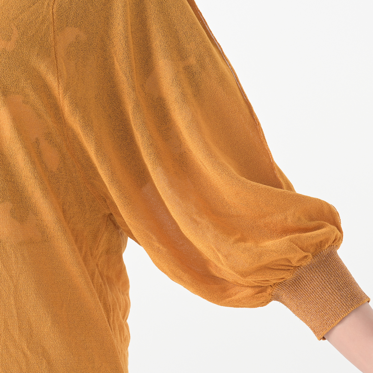 7分袖丈にたっぷりのギャザーを寄せたバルーンスリーブ。袖口はラメ糸を引き揃えて、華やかさをプラスしました。シャープなVネックはバイカラーに編み立てた総針編みテープで縁取り。フロントはTバーとハトメリングで開閉できます