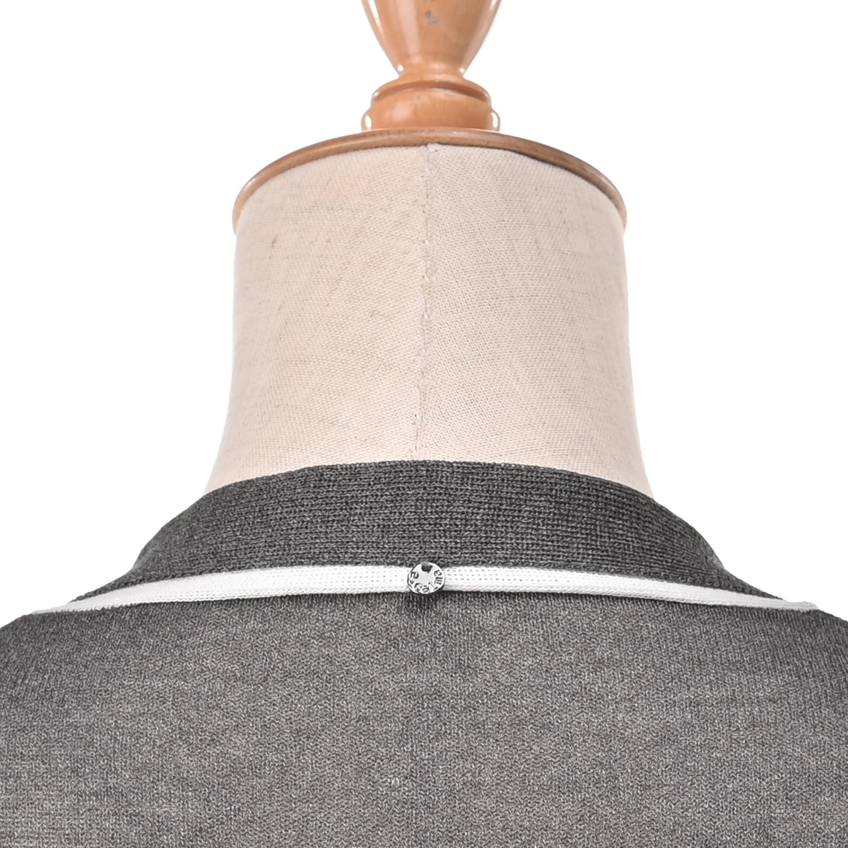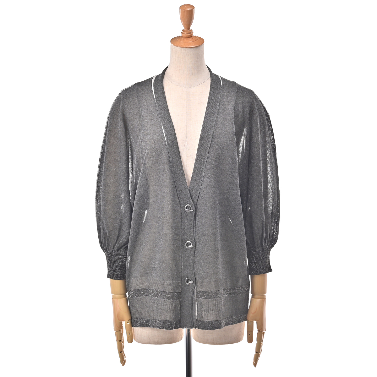 普段Mサイズですが、こちらはSサイズのグレー購入。肩幅狭めで袖がボリュームあるデザインなので私はSサイズでスッキリ着れて良かったです。袖口と裾のラメが効いていてさり気なく見える袖山と身頃中心部のブラックのラインも良いです。Tバーなのでボタンホールも型ぐずれしないし、デザイン的にもアクセントになり気に入りました。
