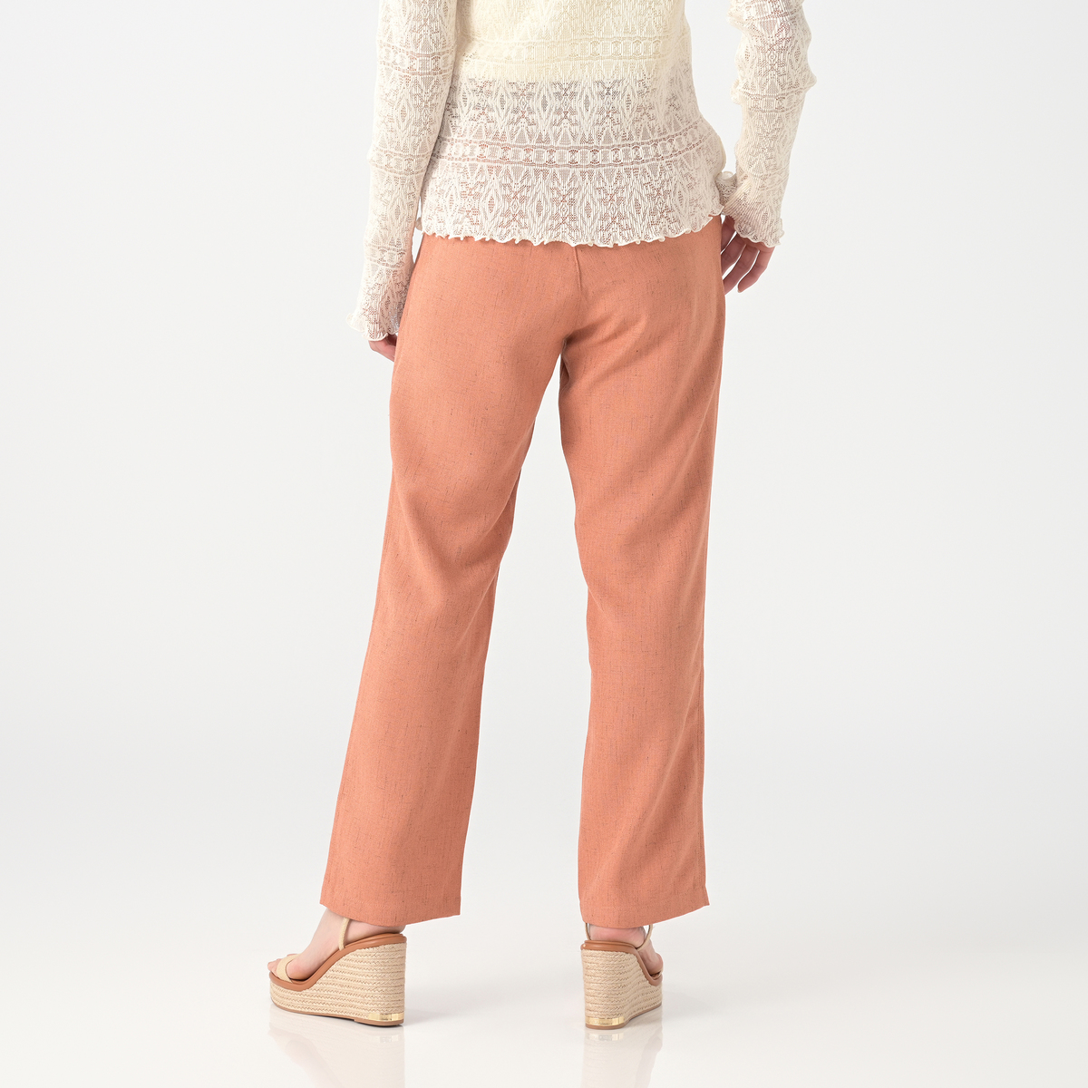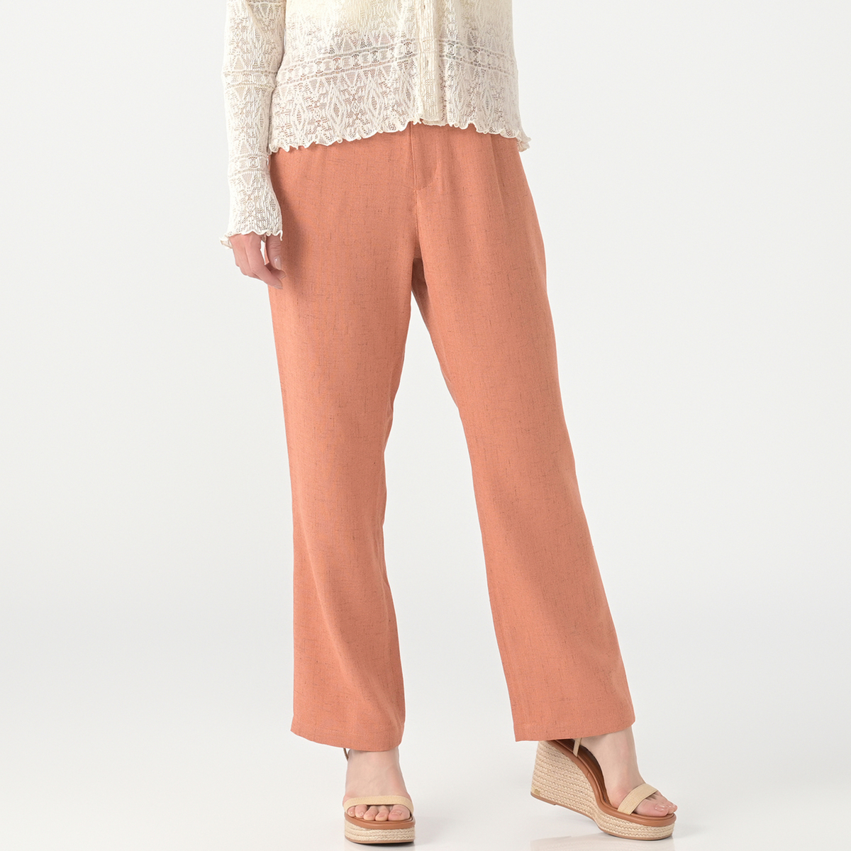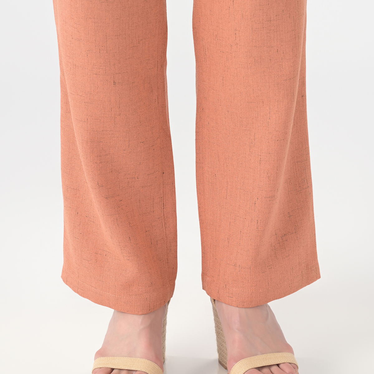 シャリ味がありドライタッチの清涼感ある麻見えする平織りは、麻見え特有の上品で涼しげな透け感をもちつつ硬くハリがあり、仕立て映えする生地です。股下は65cmと70cmの長さからお選びいただけます