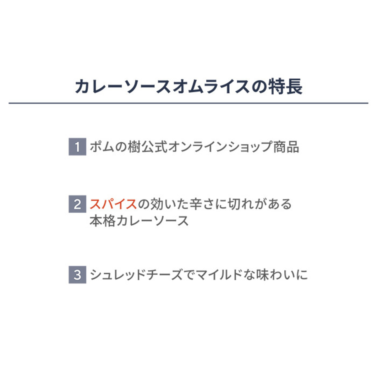 オムライス専門店として試作を重ねてこだわり抜いた、冷凍食品とは思えない卵のふわふわ食感を目指しました。お店の味を再現するため、主要食材(米、玉ねぎ、シーズニング、ベーコン、カレーソース、シュレッドチーズ)を使用しています*。ケチャップライスは、ポムの樹全店で使用しているオリジナルケチャップで炒めて味付けをしています