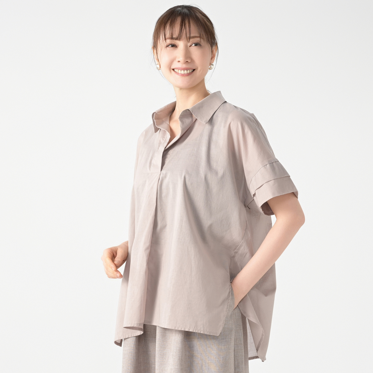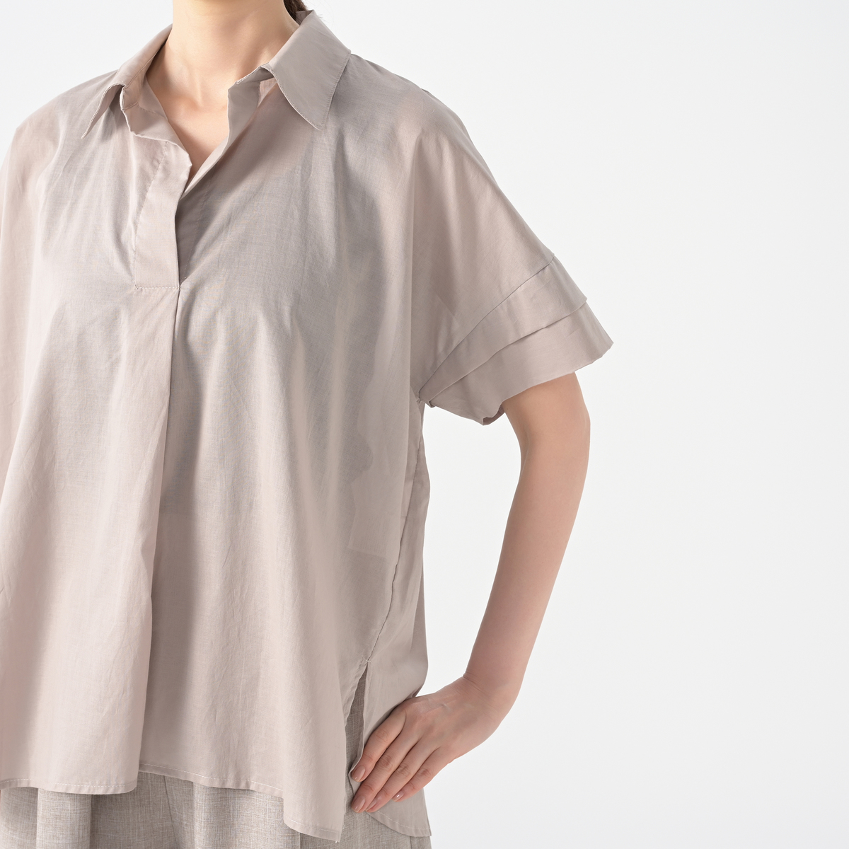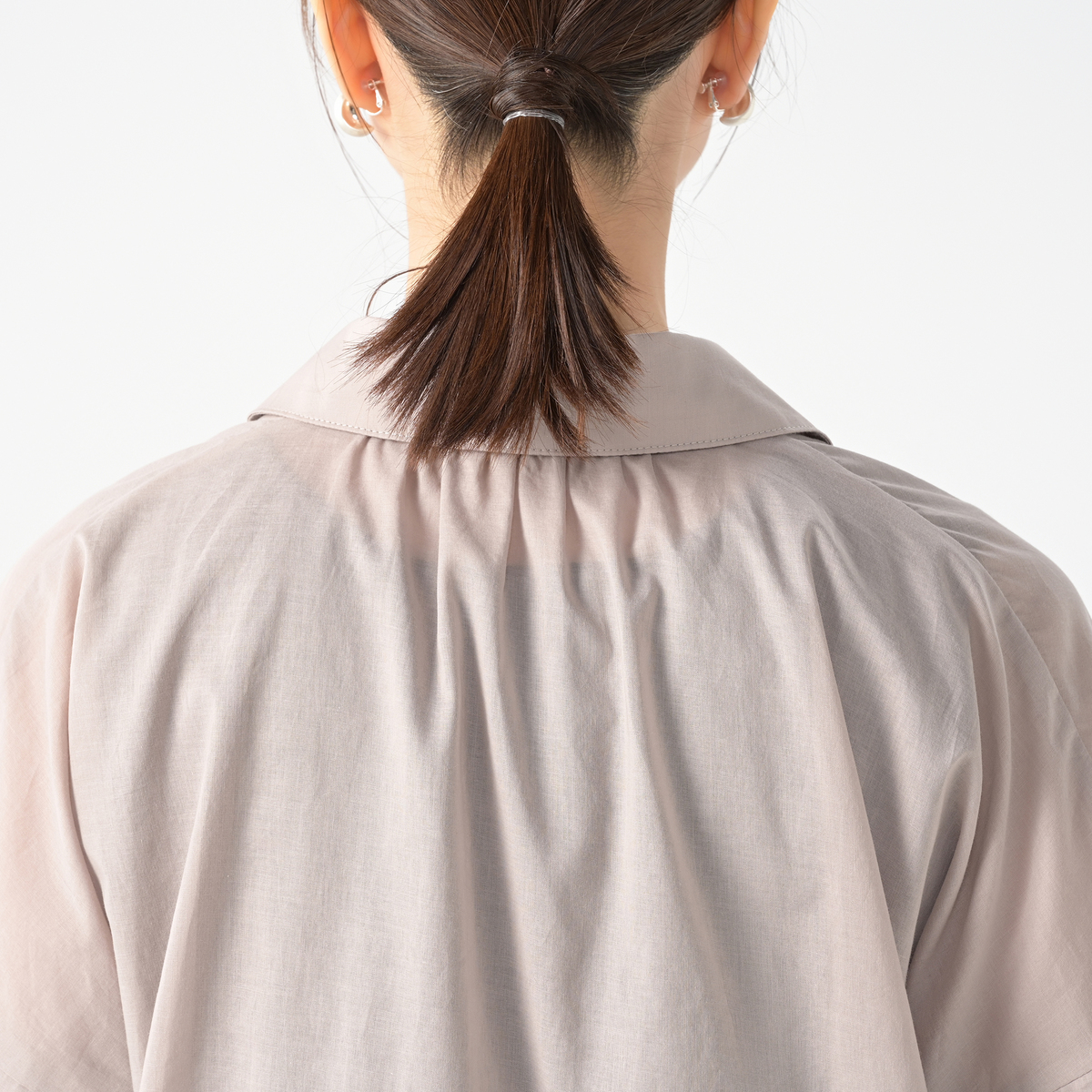 スキッパー開きのオーバーサイズに仕上げ、袖口は2枚重ねてロールアップに見えるデザイン。シアー素材で清涼感を演出し、重ね着でのレイヤーコーディネートにもおすすめです