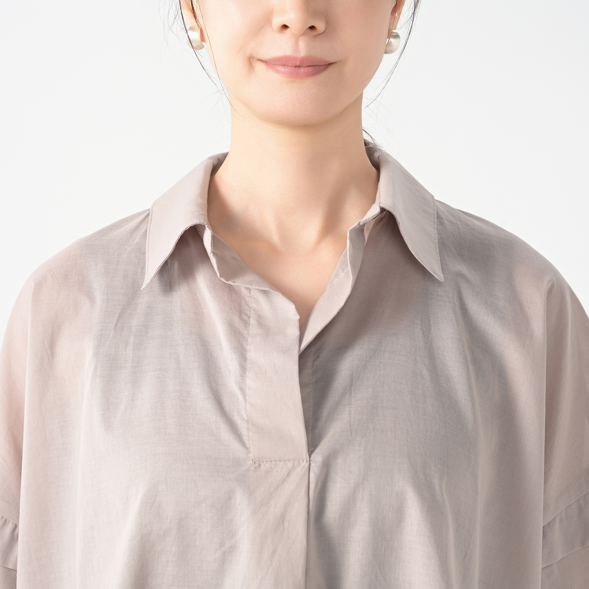 トレンドのシアーを意識した素材を使用したスキッパーシャツ。80番手の綿で仕立てたボイル素材は、ほどよいハリ感と肌触りの良い清涼感が特徴です。綿100%の天然繊維の心地よさを感じながら、軽やかに着こなせます