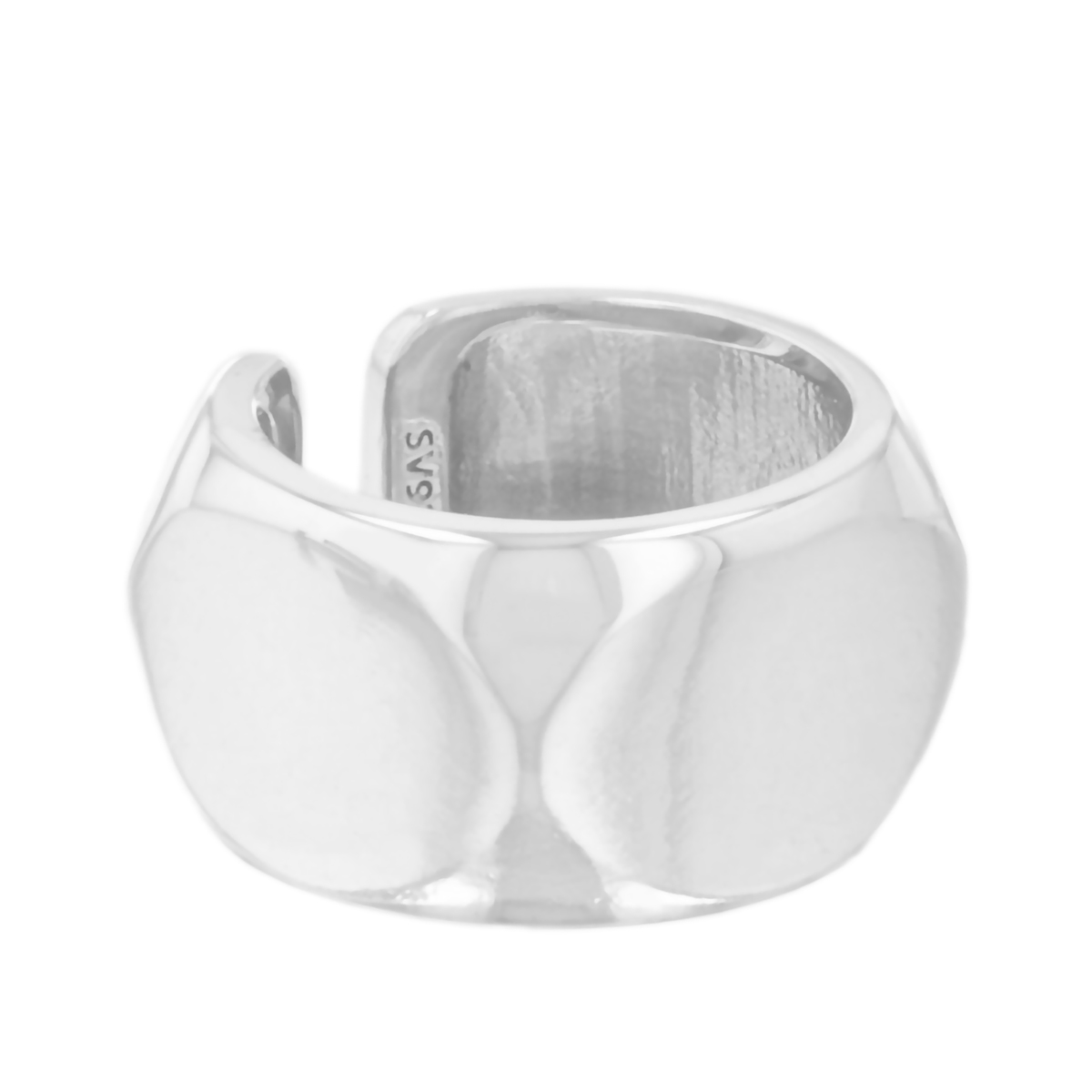 シルバー925の地金を鏡面仕上げした片耳用のイヤーカフ。耳横の上部からはめ込み、下にスライドさせるだけ。しっかりと耳たぶにフィットしてお使い頂けます