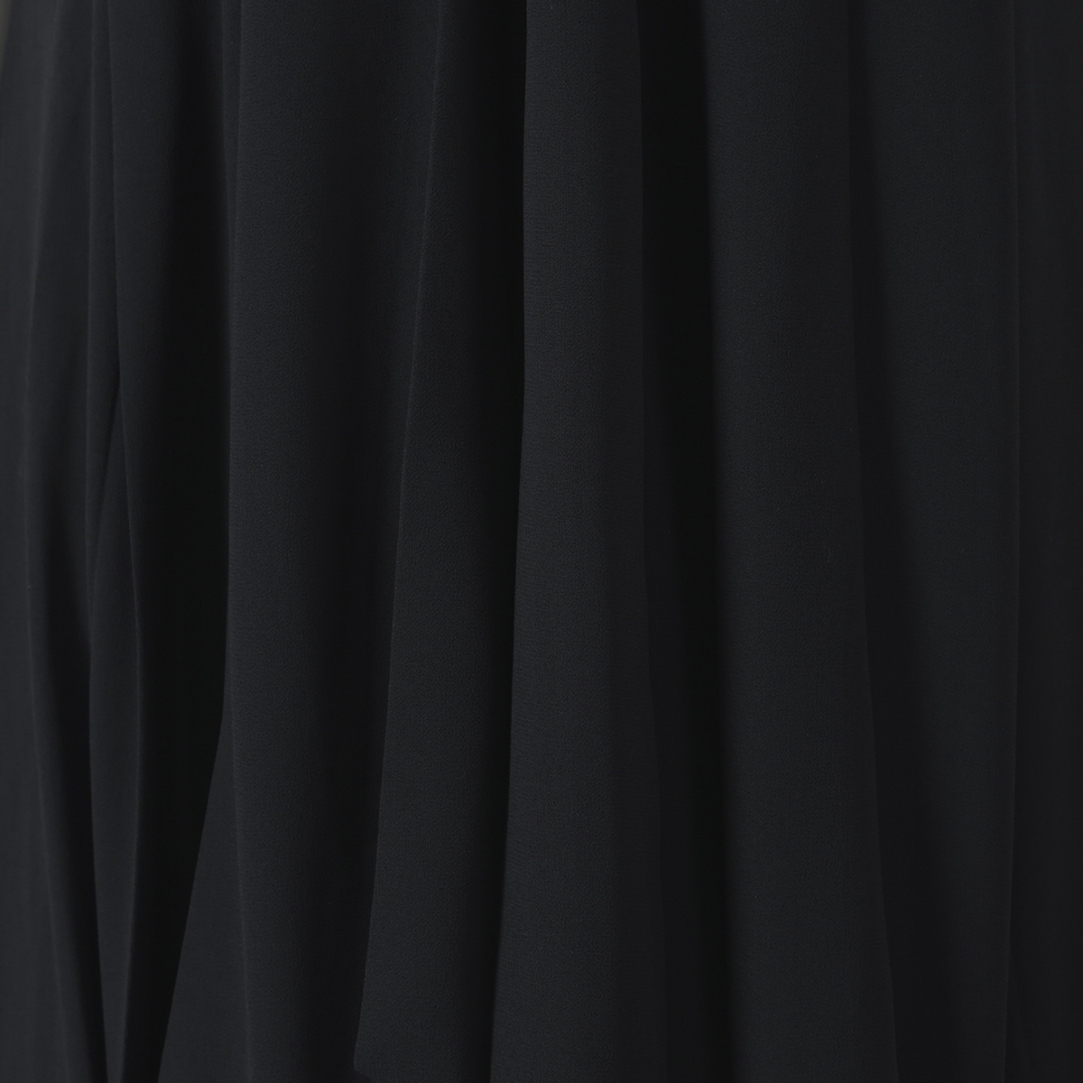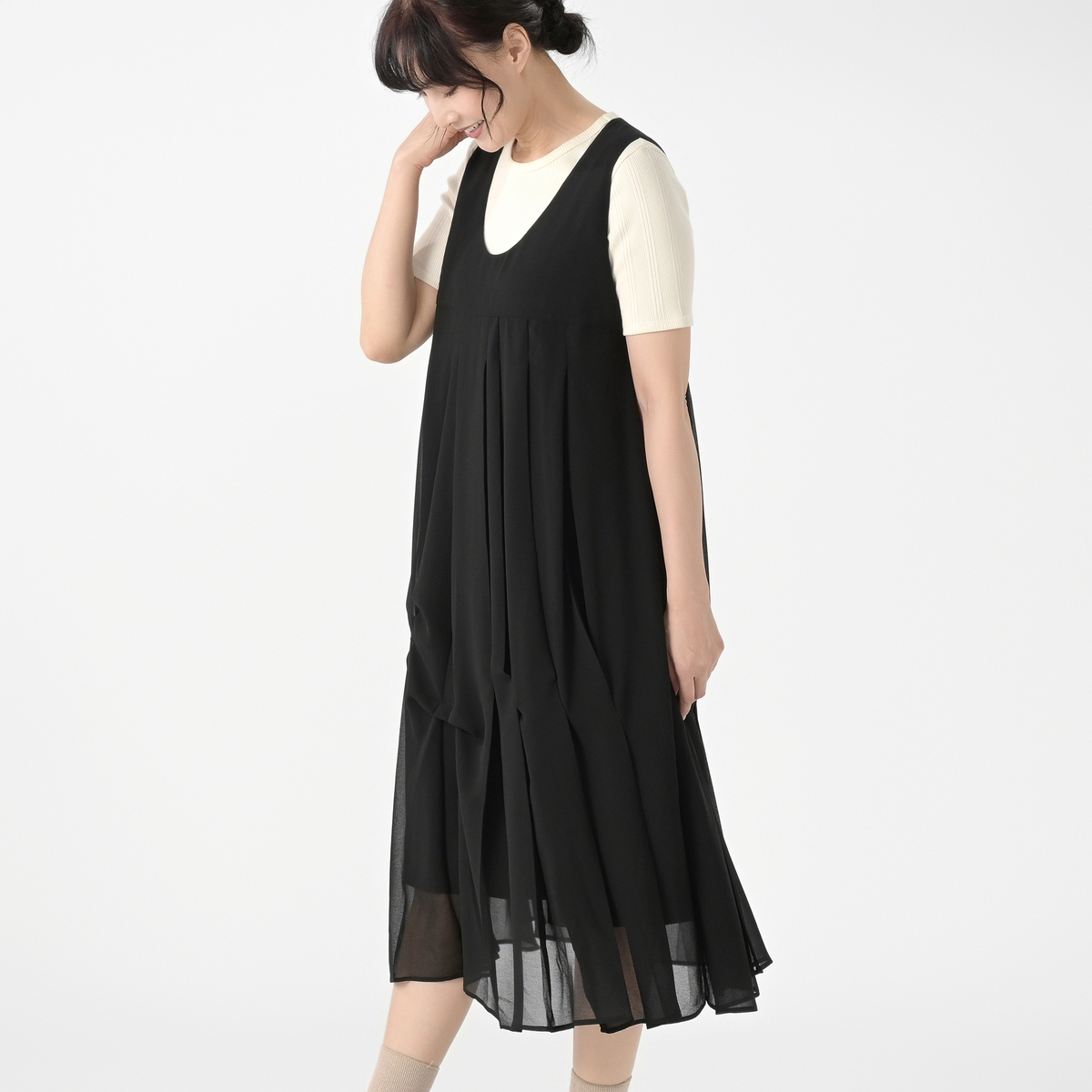 しなやかなシフォン素材にタックとタタミの工夫を加え、立体感あふれるワンピースに仕上げました。高級感があり、着る人の雰囲気を一段と引き立てます