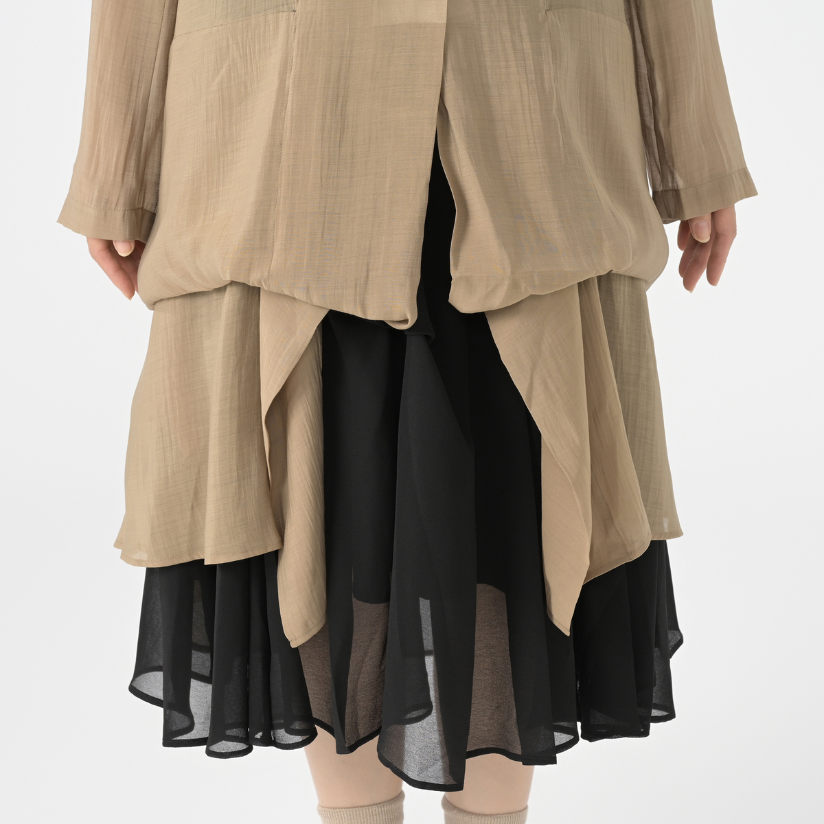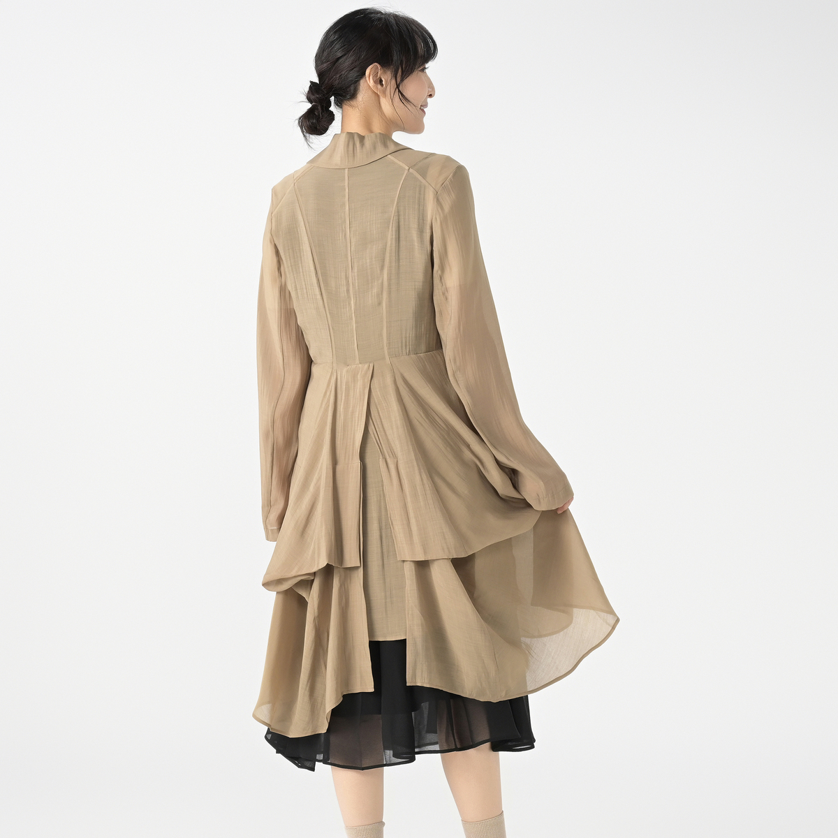 裾はタックと切り替えを駆使し、立体的なシルエットを演出。変形した裾のデザインが、コーディネートに個性を添えてくれます