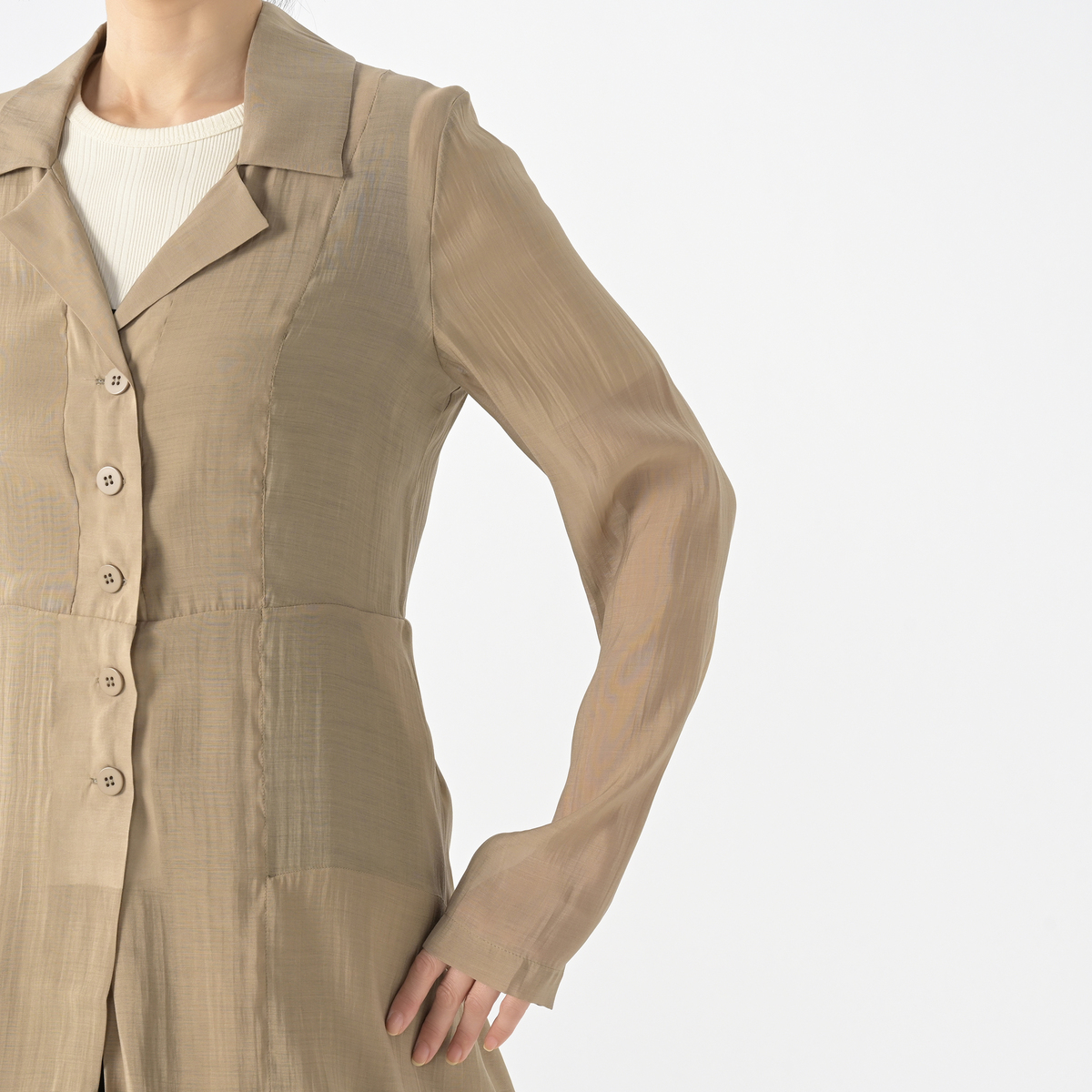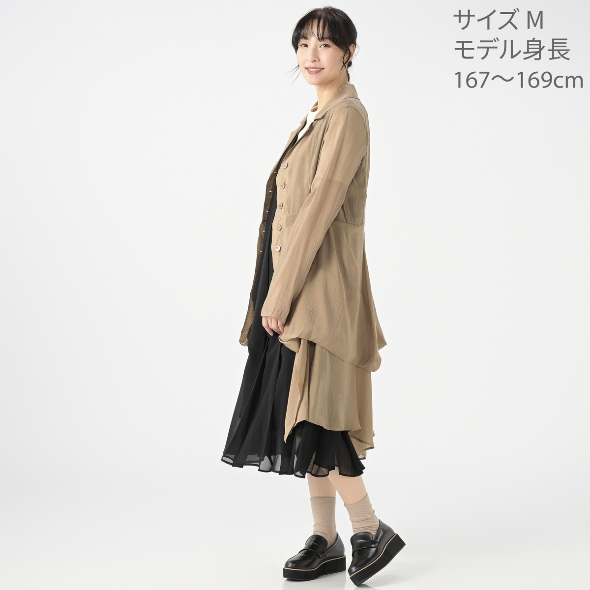 初めて購入させて頂けたのですが、ステキな一着だと思います。大阪の万博に行く計画もあり、また、子ども達とのランチもあり、着ていく服を探していました。後ろのフリルがステキです。適度な透明感は流行を感じさせて日焼け止めにもなりますね。カワイオカダ先生の作品は前から気になっていました。とても満足しています。