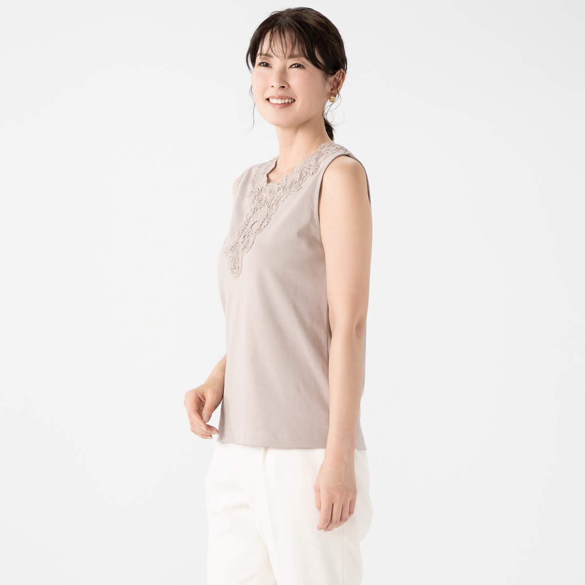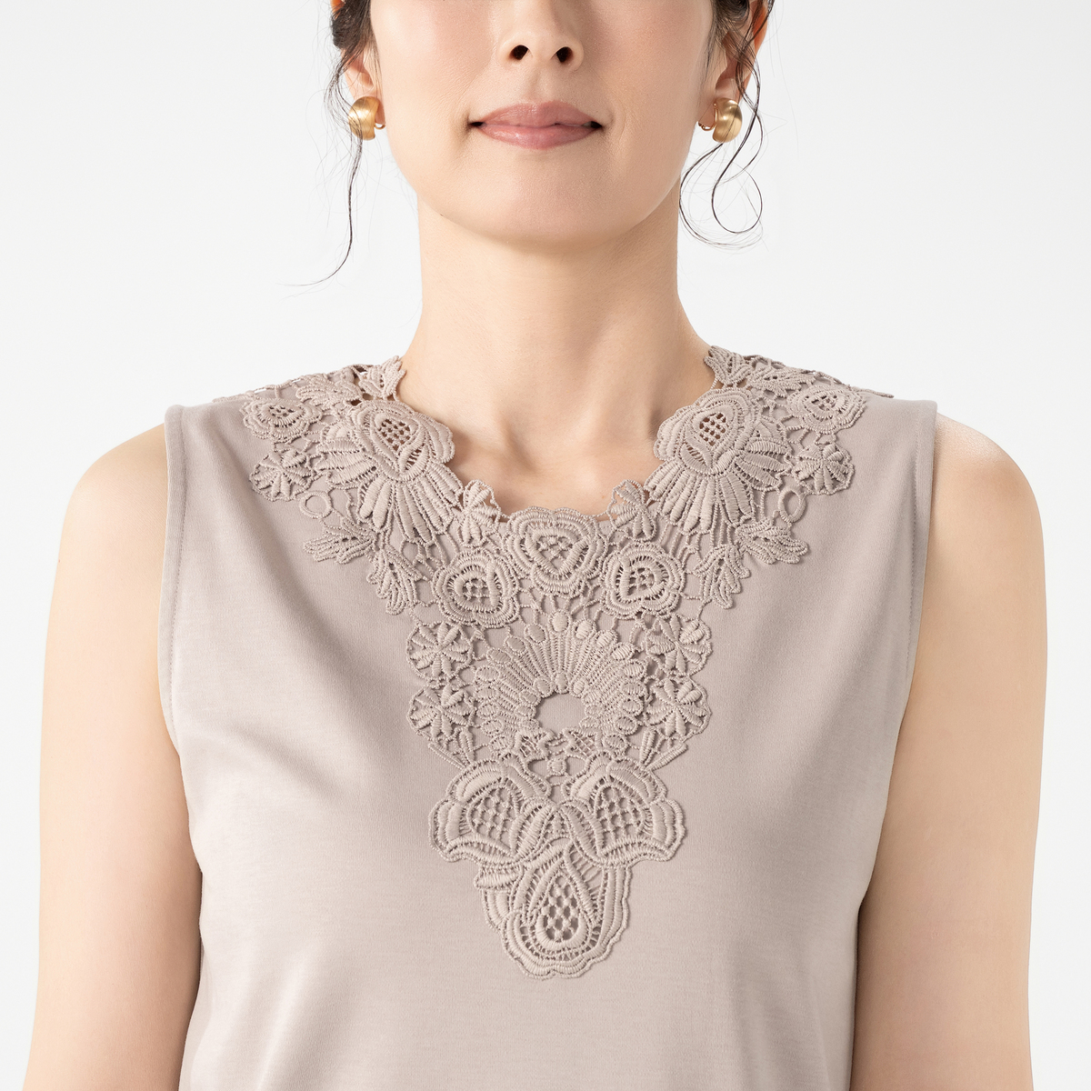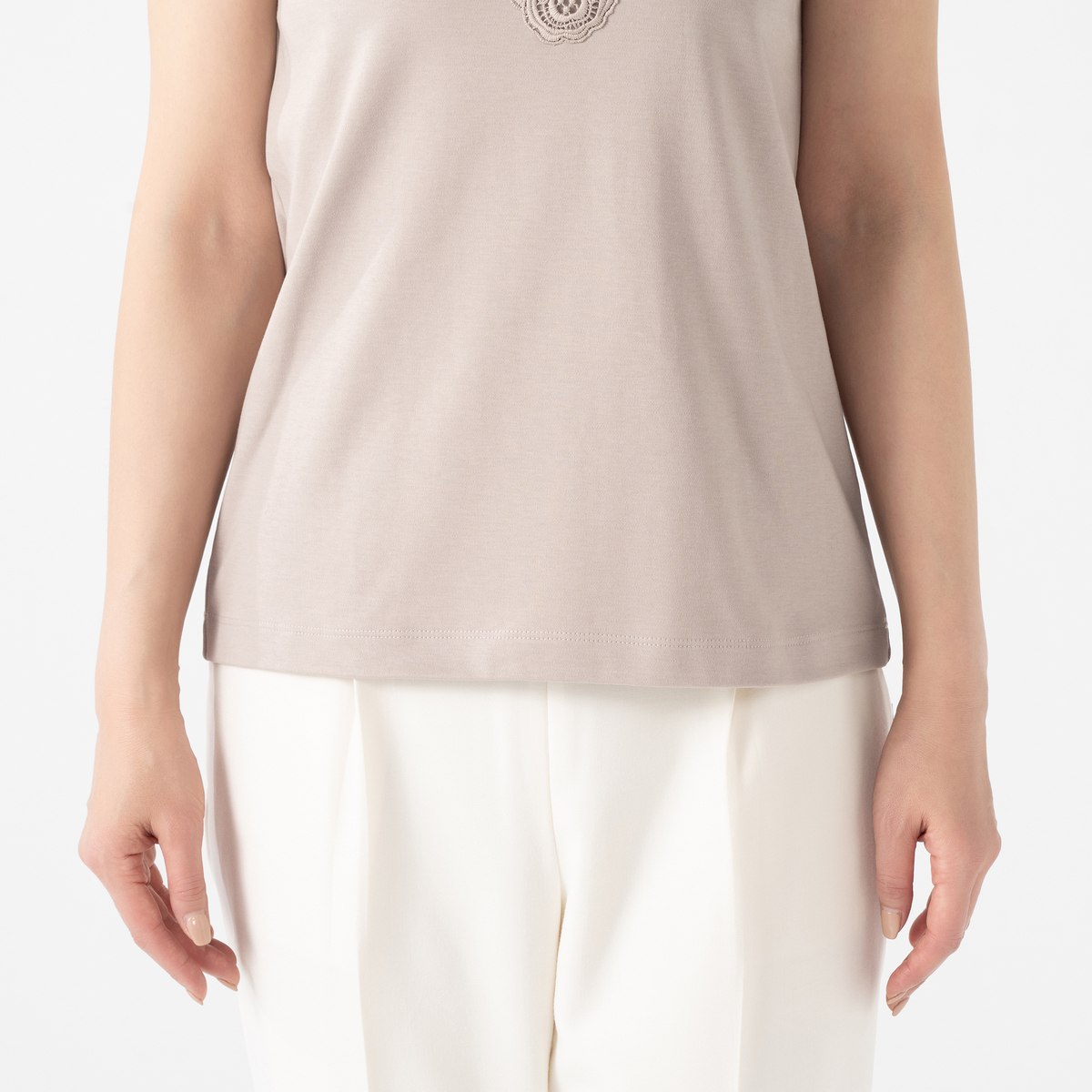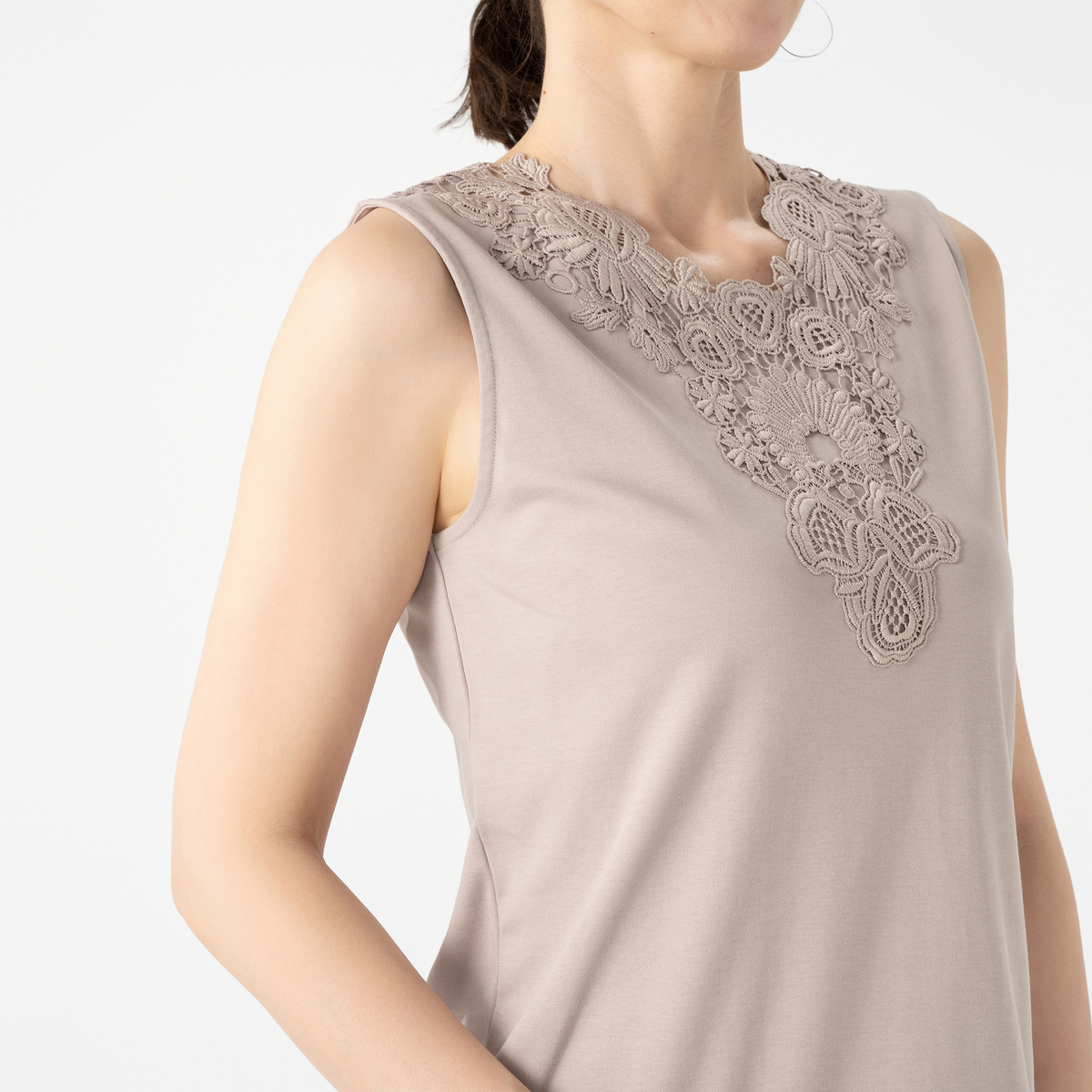 シルエットが美しいタンクトップ。衿元のモチーフレースが華やかなデザインで、夏の1枚着としても、シャツやカーディガンなどを羽織っても上品な着こなしに。雰囲気がありながら、UVカット、接触冷感、アンチピリングの機能性も備えています