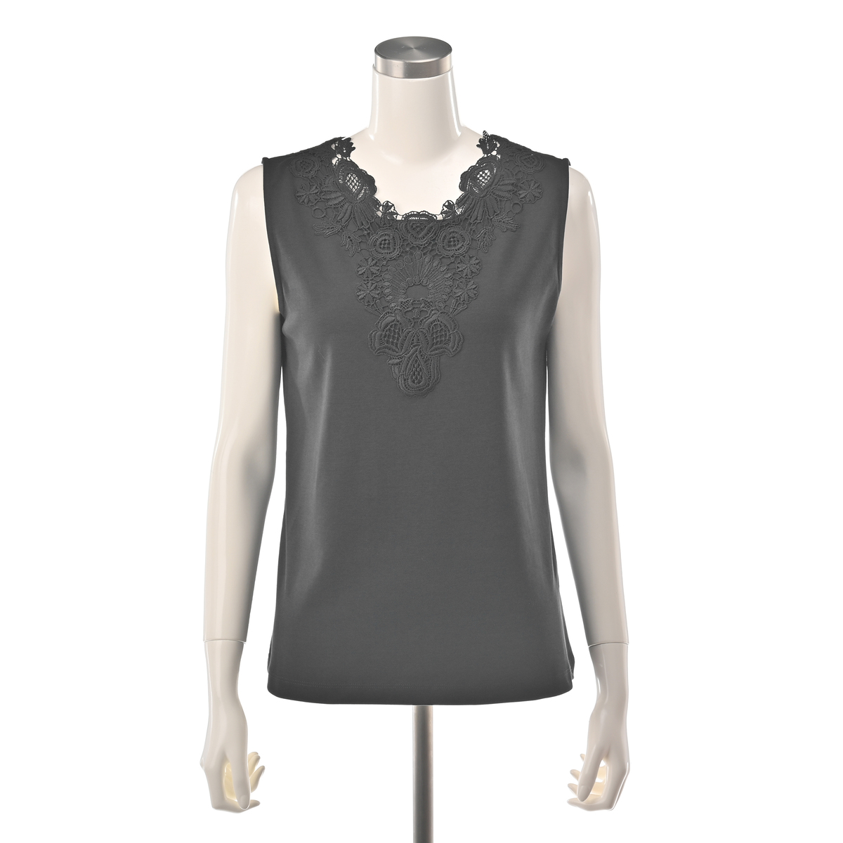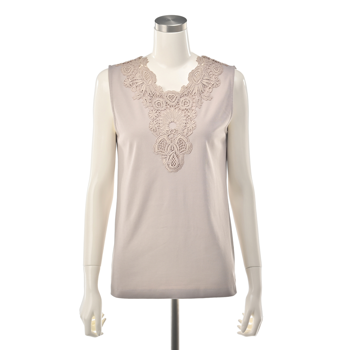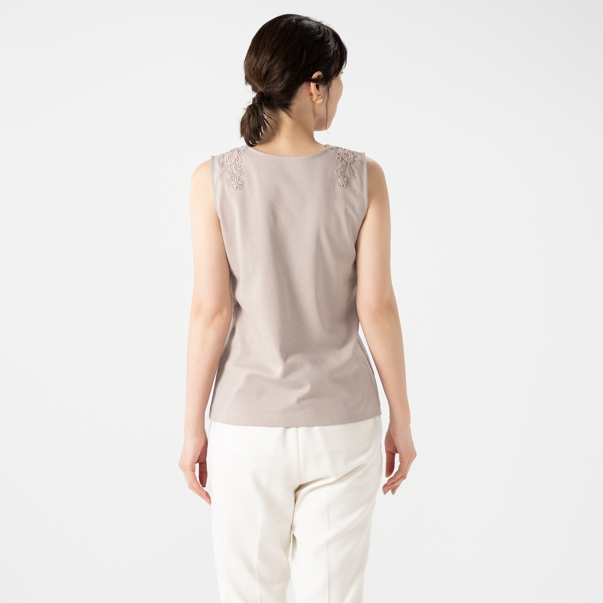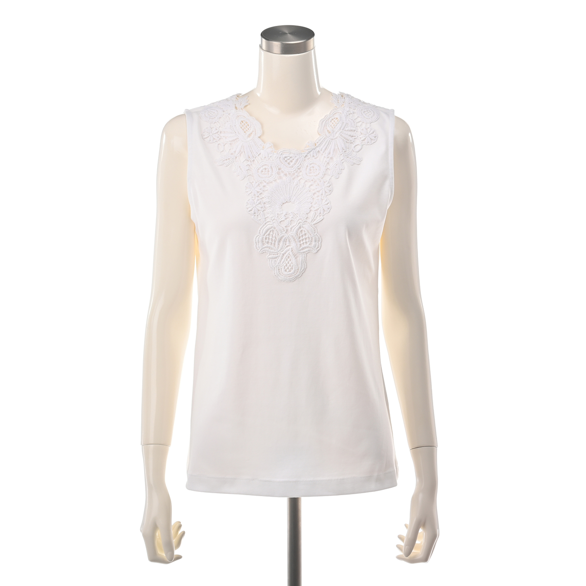シルエットが美しいタンクトップ。衿元のモチーフレースが華やかなデザインで、夏の1枚着としても、シャツやカーディガンなどを羽織っても上品な着こなしに。雰囲気がありながら、UVカット、接触冷感、アンチピリングの機能性も備えています