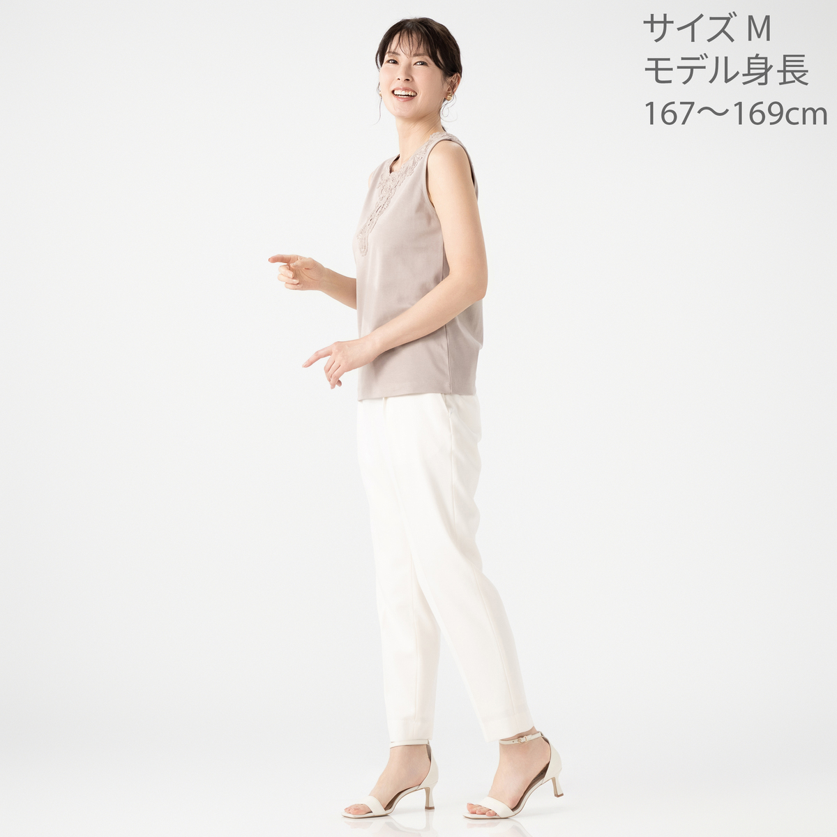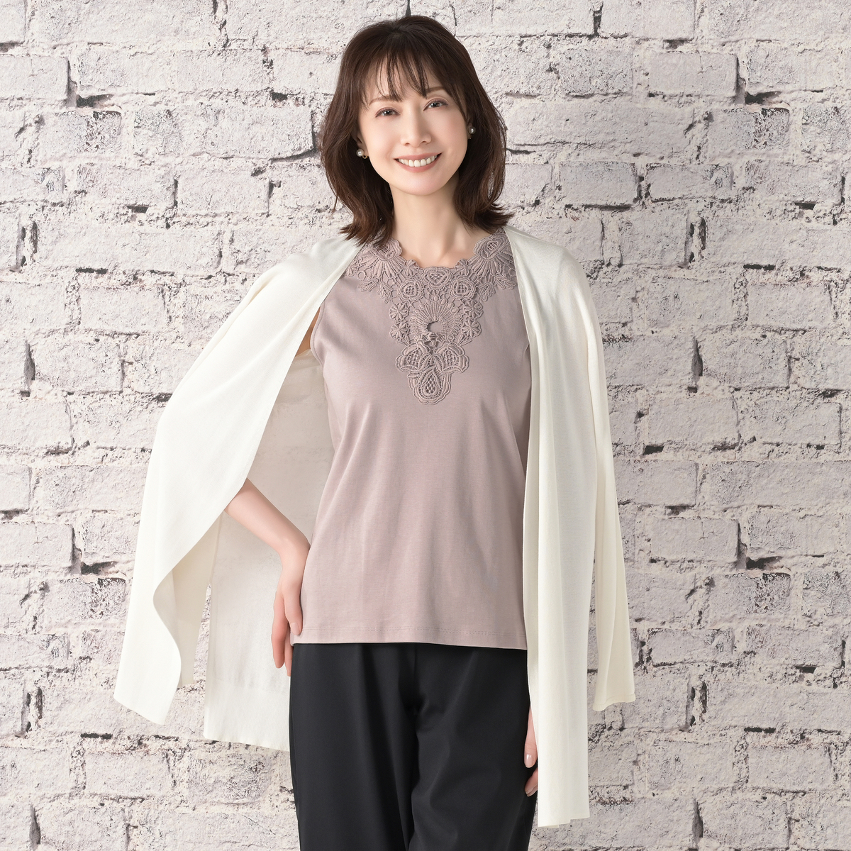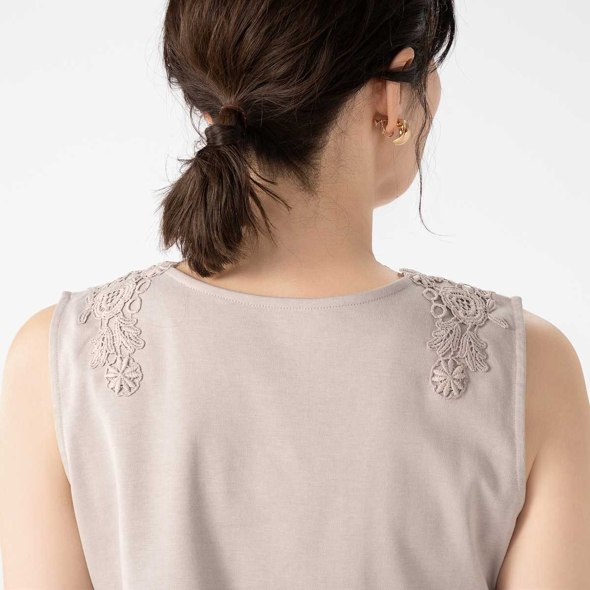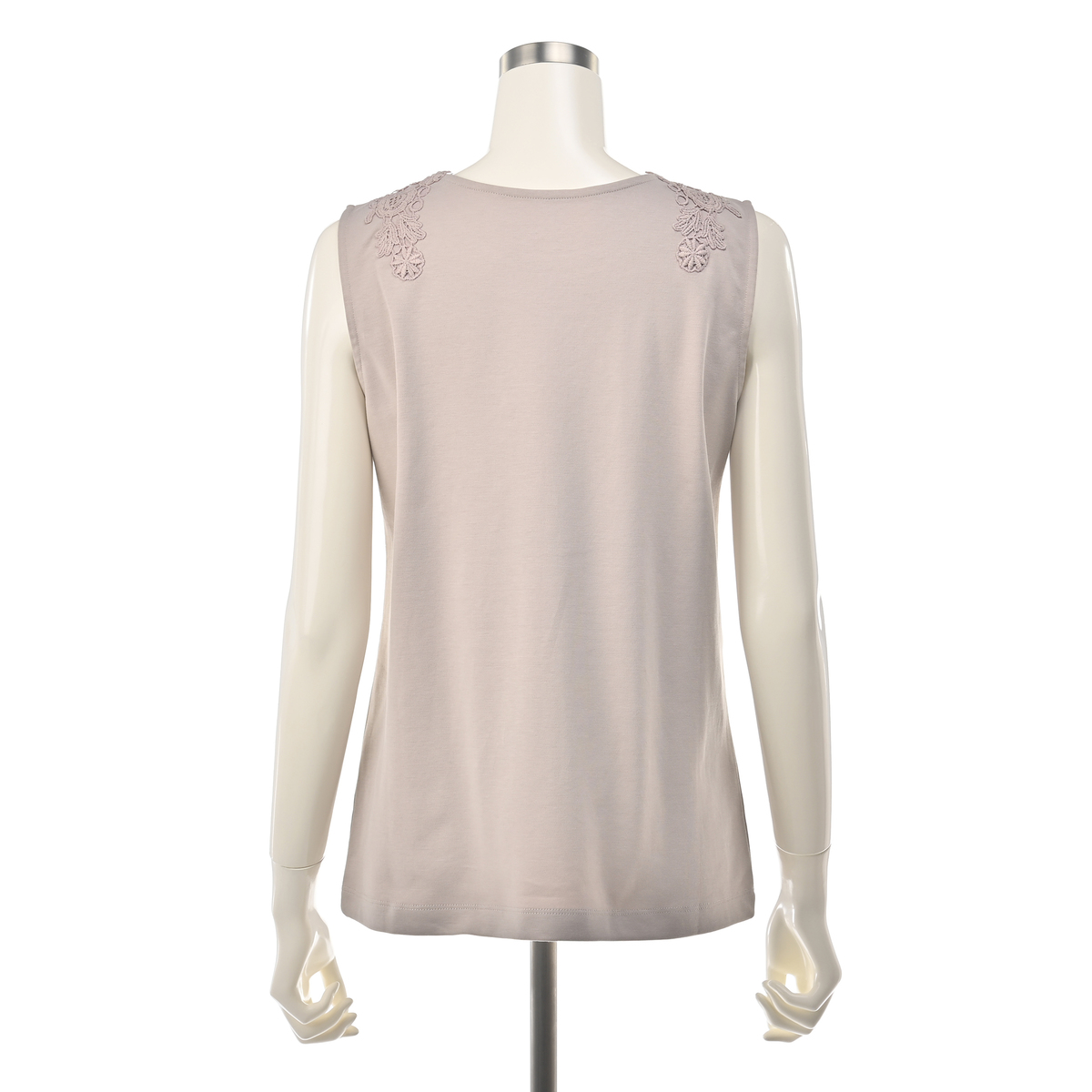 シルエットが美しいタンクトップ。衿元のモチーフレースが華やかなデザインで、夏の1枚着としても、シャツやカーディガンなどを羽織っても上品な着こなしに。雰囲気がありながら、UVカット、接触冷感、アンチピリングの機能性も備えています