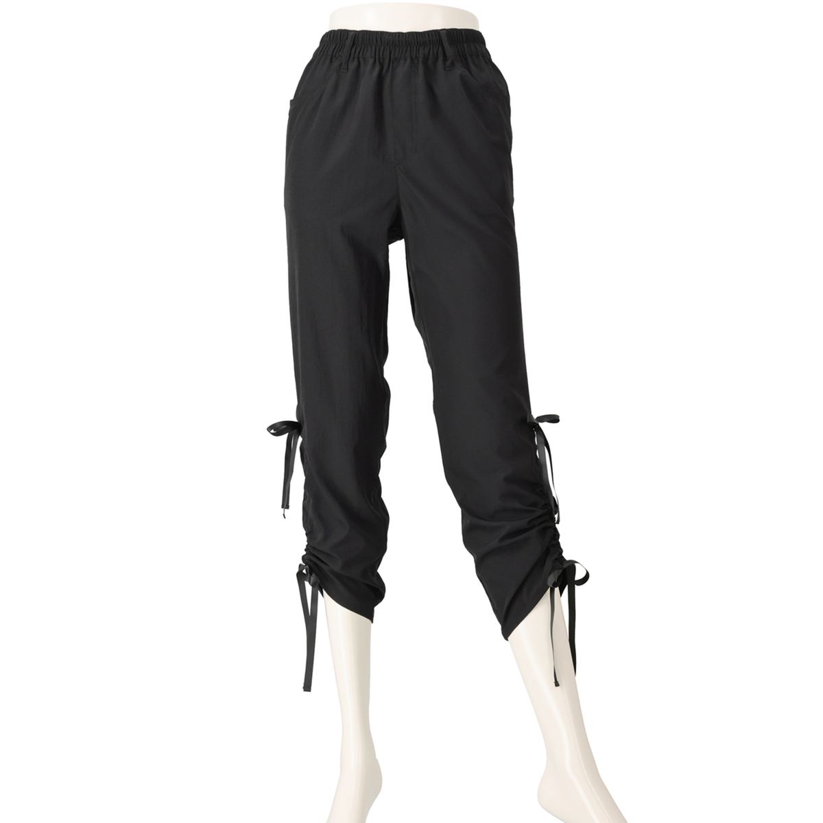 ドロスト仕様の裾が特徴のパンツ。お好みのシルエットに調節でき、リボンが可愛らしいアクセントになってくれます