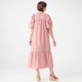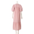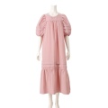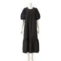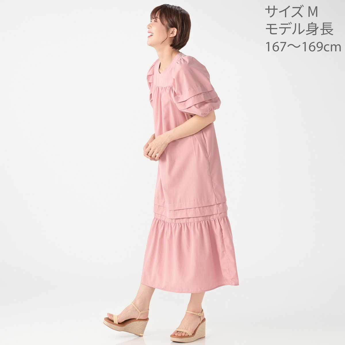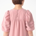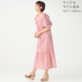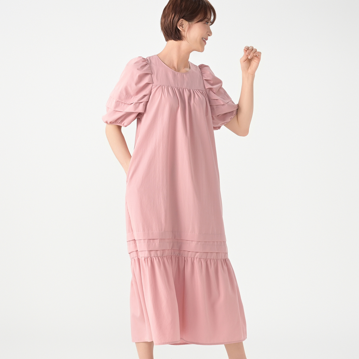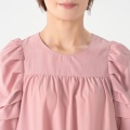 程よいハリと落ち感の布帛素材を使い、ミモレ丈のAラインシルエットに仕上げたワンピースです。たっぷりとしたパフスリーブで肩幅はコンパクトに。肩まわりはギャザーとタックでゆったりとした着用感です。胸元・背中の切り替えで体のラインを拾いにくく、ふんわりとした優しい雰囲気を演出します