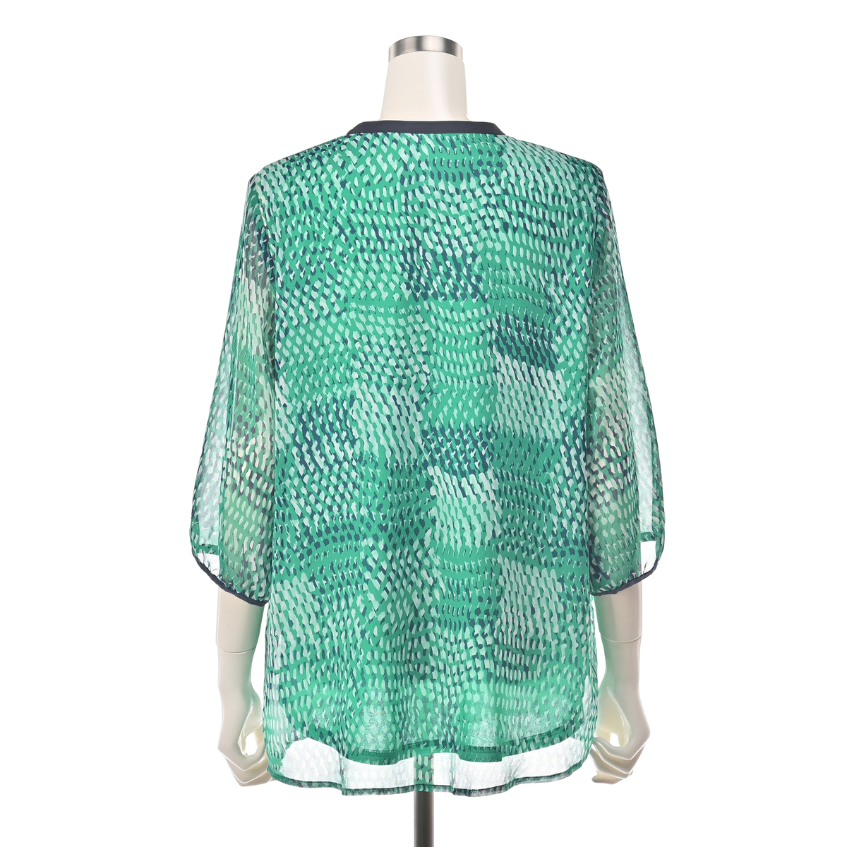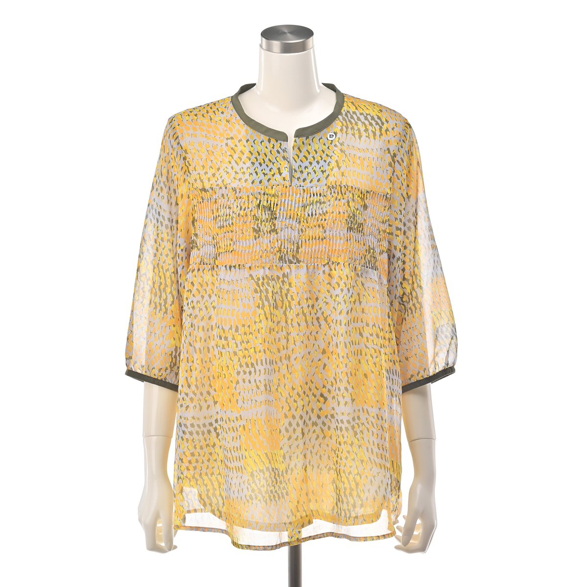M~L体型で今回もMかLで迷い2サイズのグリーンを取り寄せ。 サイズはどちらでもオッケーで軽いシフォンのデザインが一年中でも着れるし、どこにも無いようなオシャレな柄で素敵でした。 ただ、似合うはずのグリーンなのに何故か今回似合わない。 随分迷った挙げ句、今回はイエローの在庫が無く色交換もできないので諦めました。