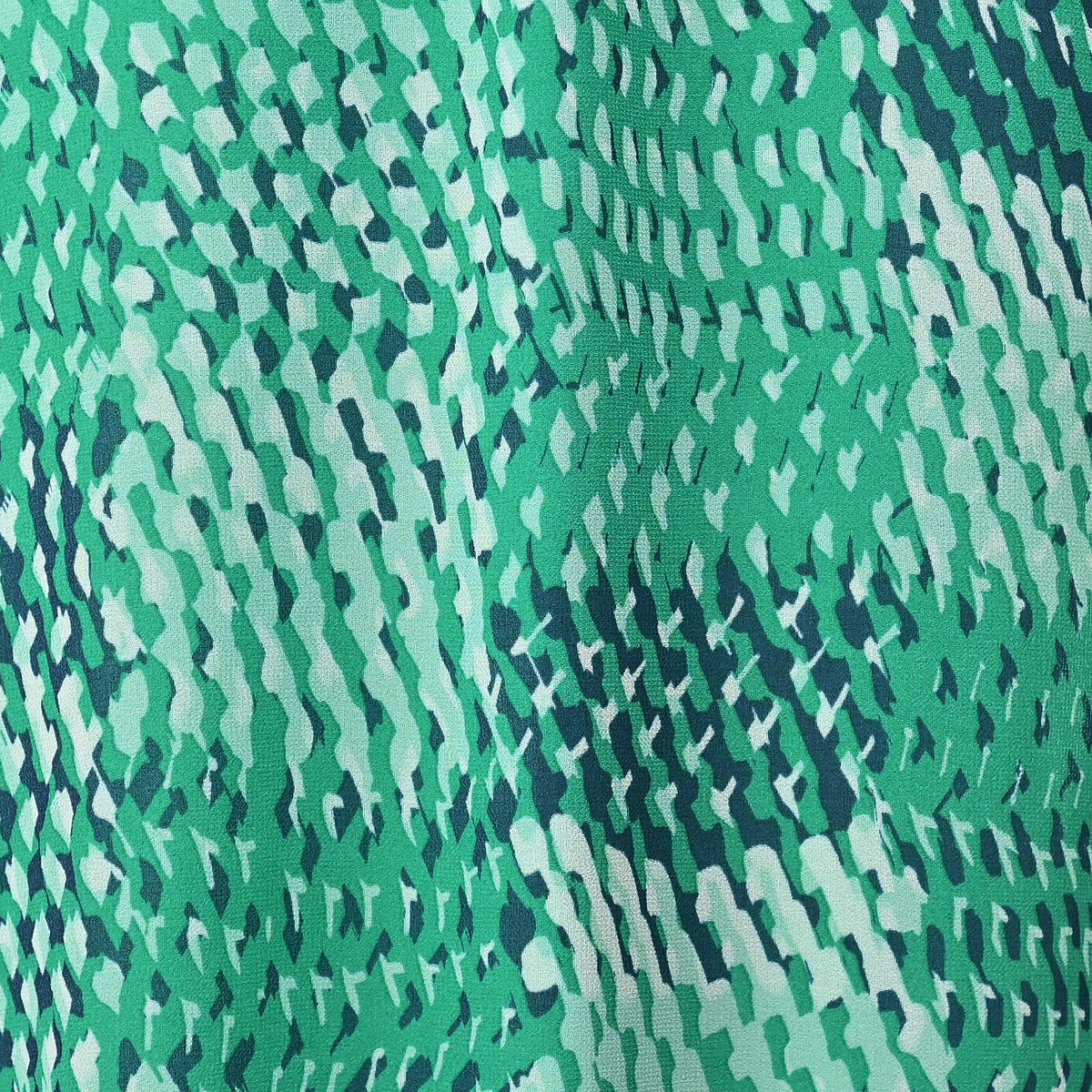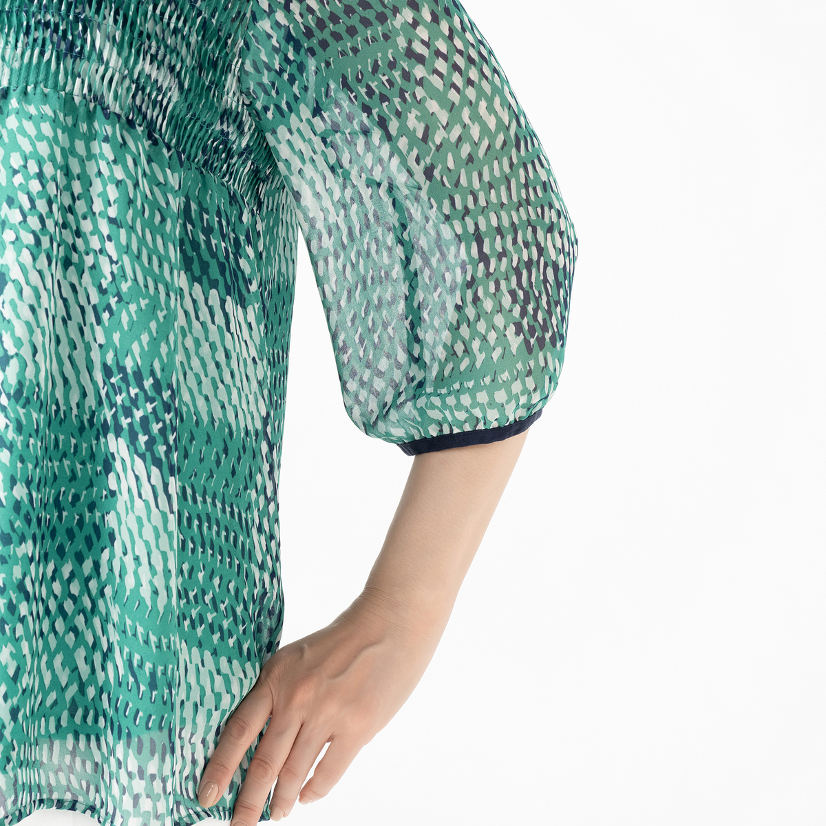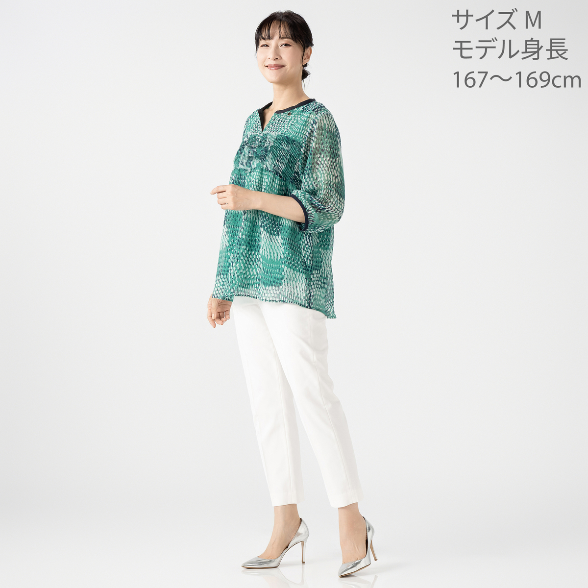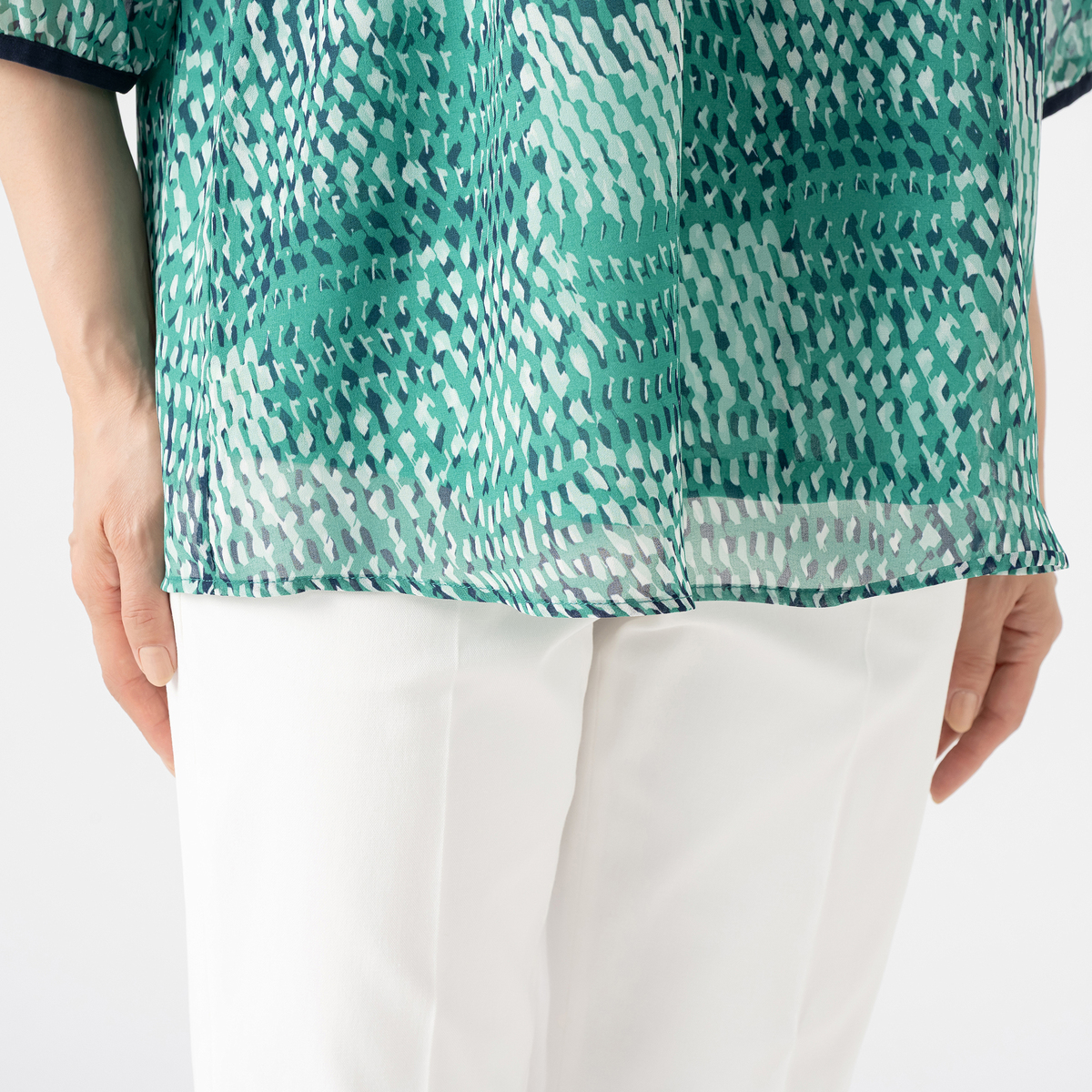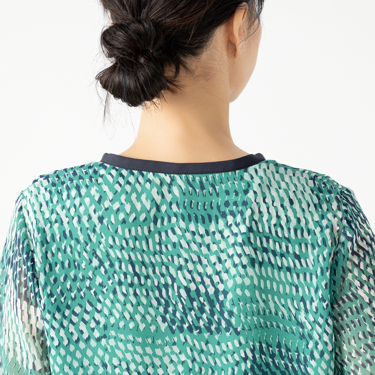 柔らかなシフォンジョーゼット素材にウェーブジオメトリック柄をプリントしました。落ち感があるのでボリュームが出過ぎず、すっきり着こなせます