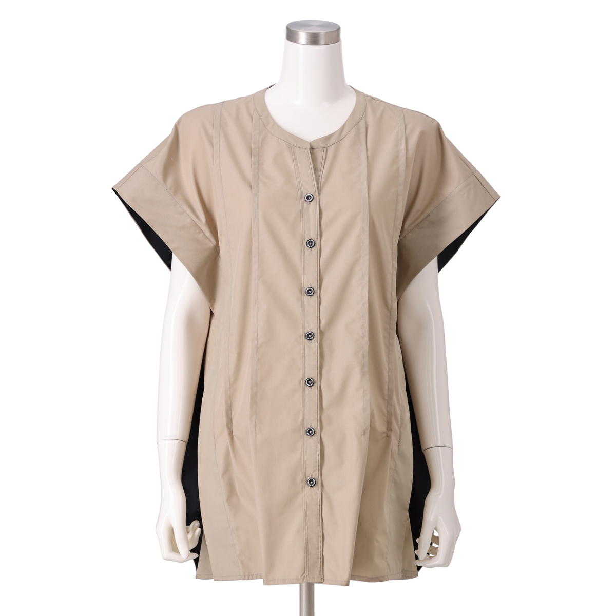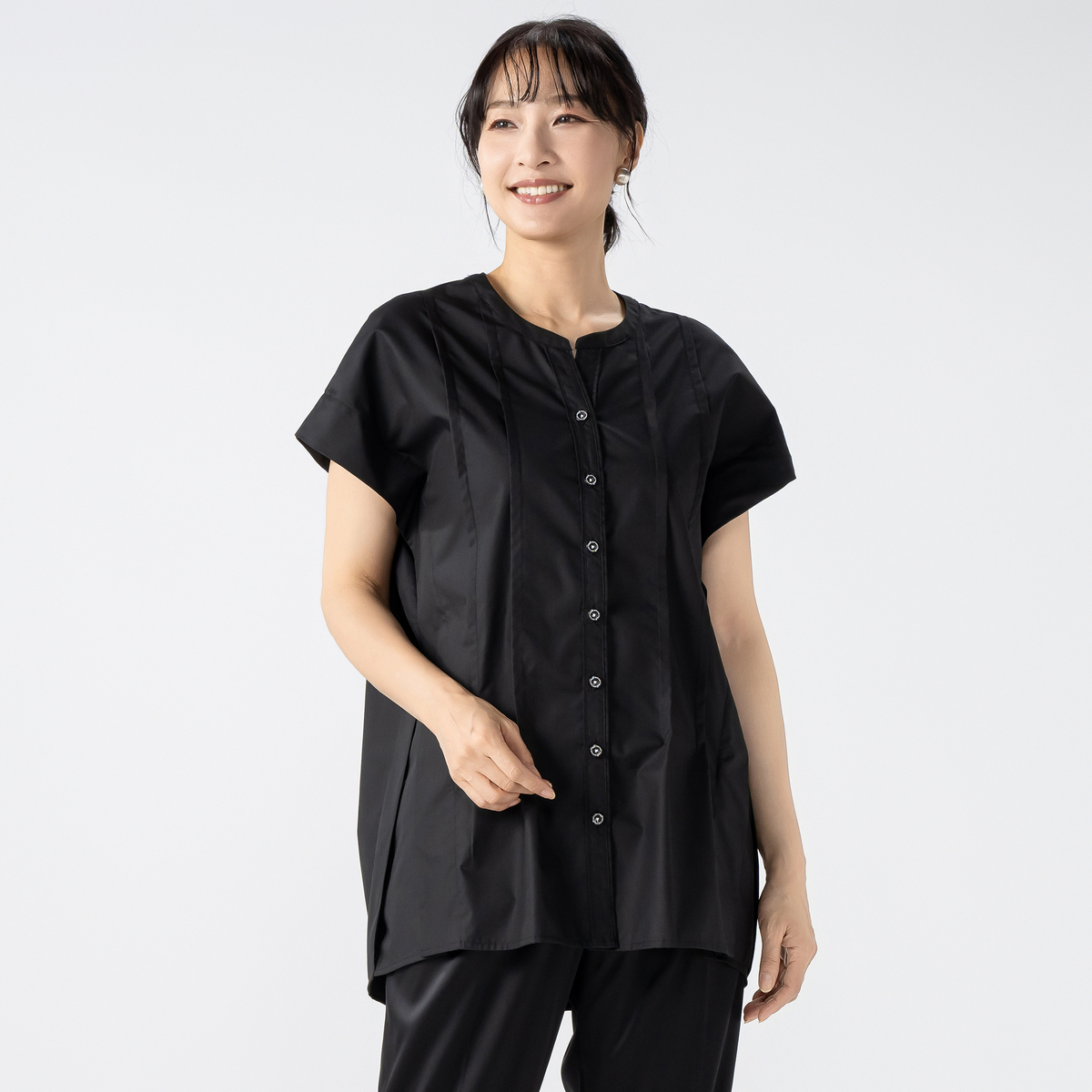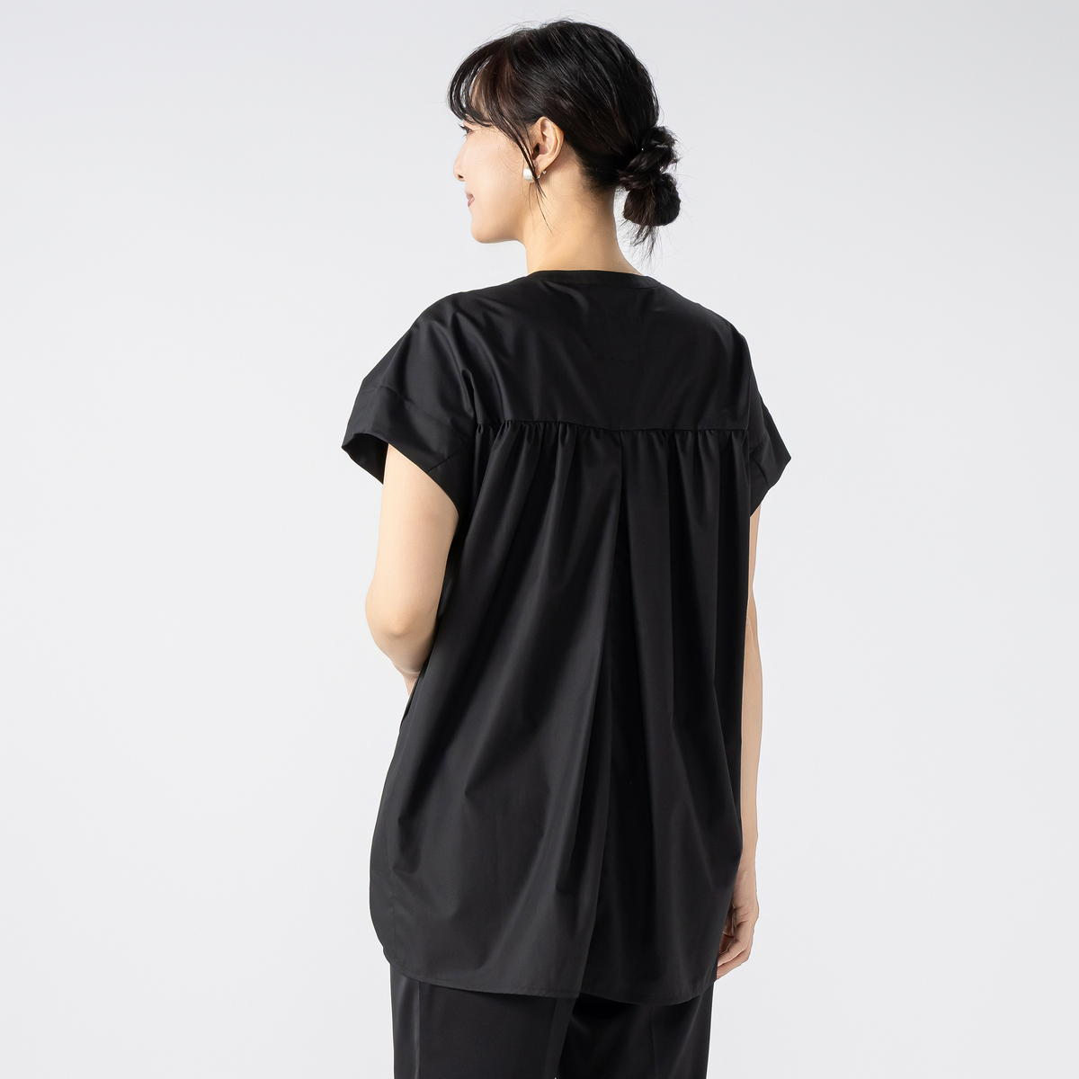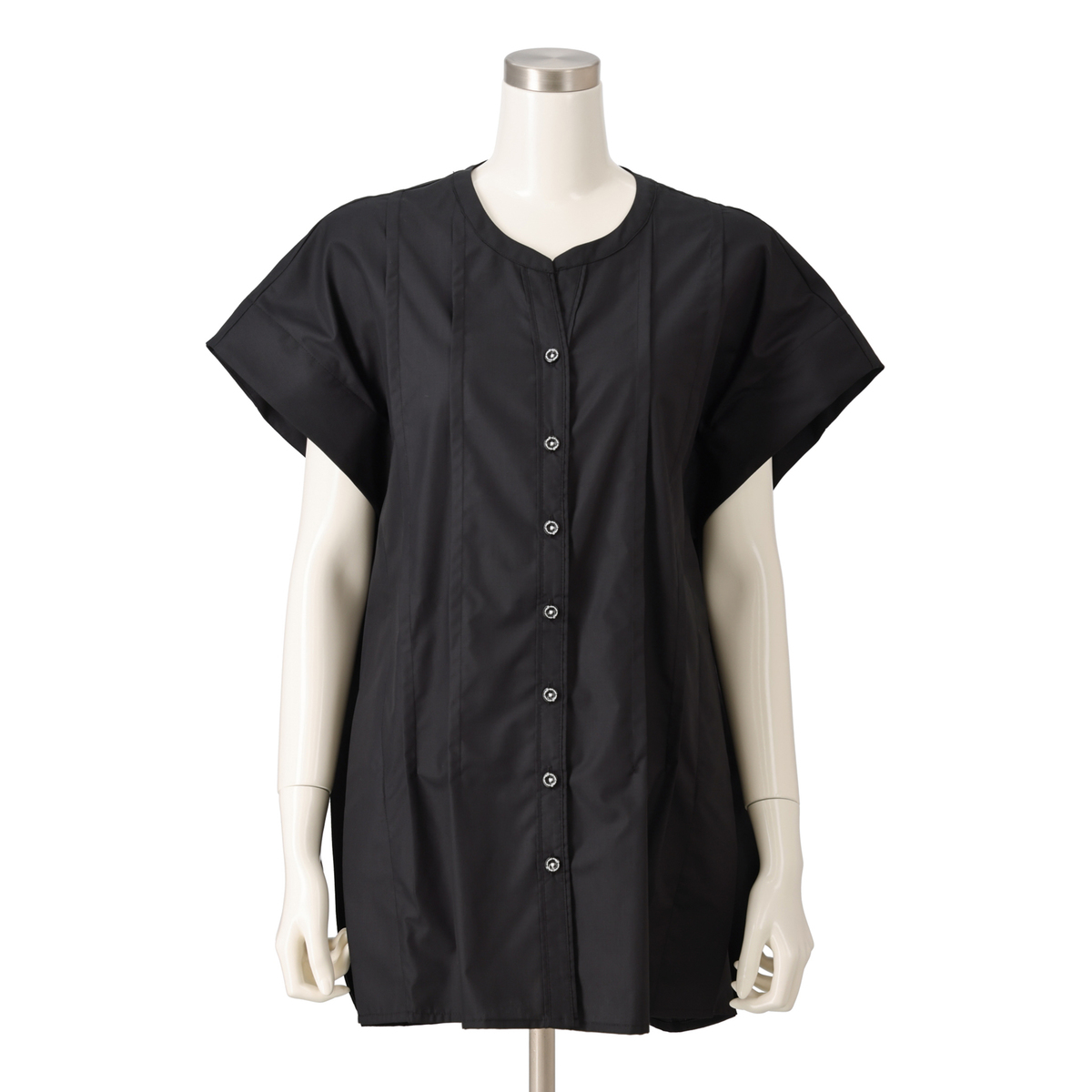 フロントの立体的なタックディテールや、構築的なデザインが目を引くフレンチスリーブシャツブラウス。マント風にも見えるデザインです。後ろの着丈を少し長めにすることでヒップが隠れ、立体感あるシルエットが自然に体型をカバーし、美しいラインを作ります