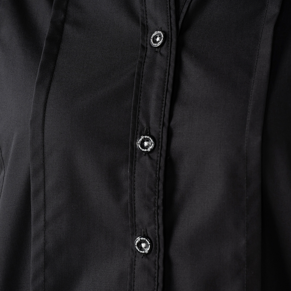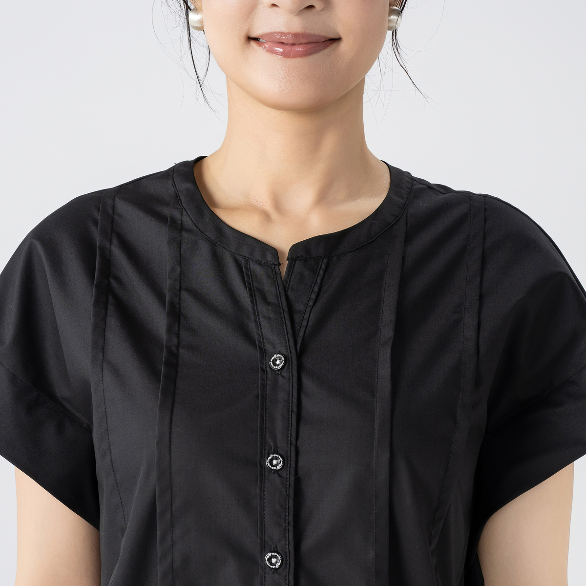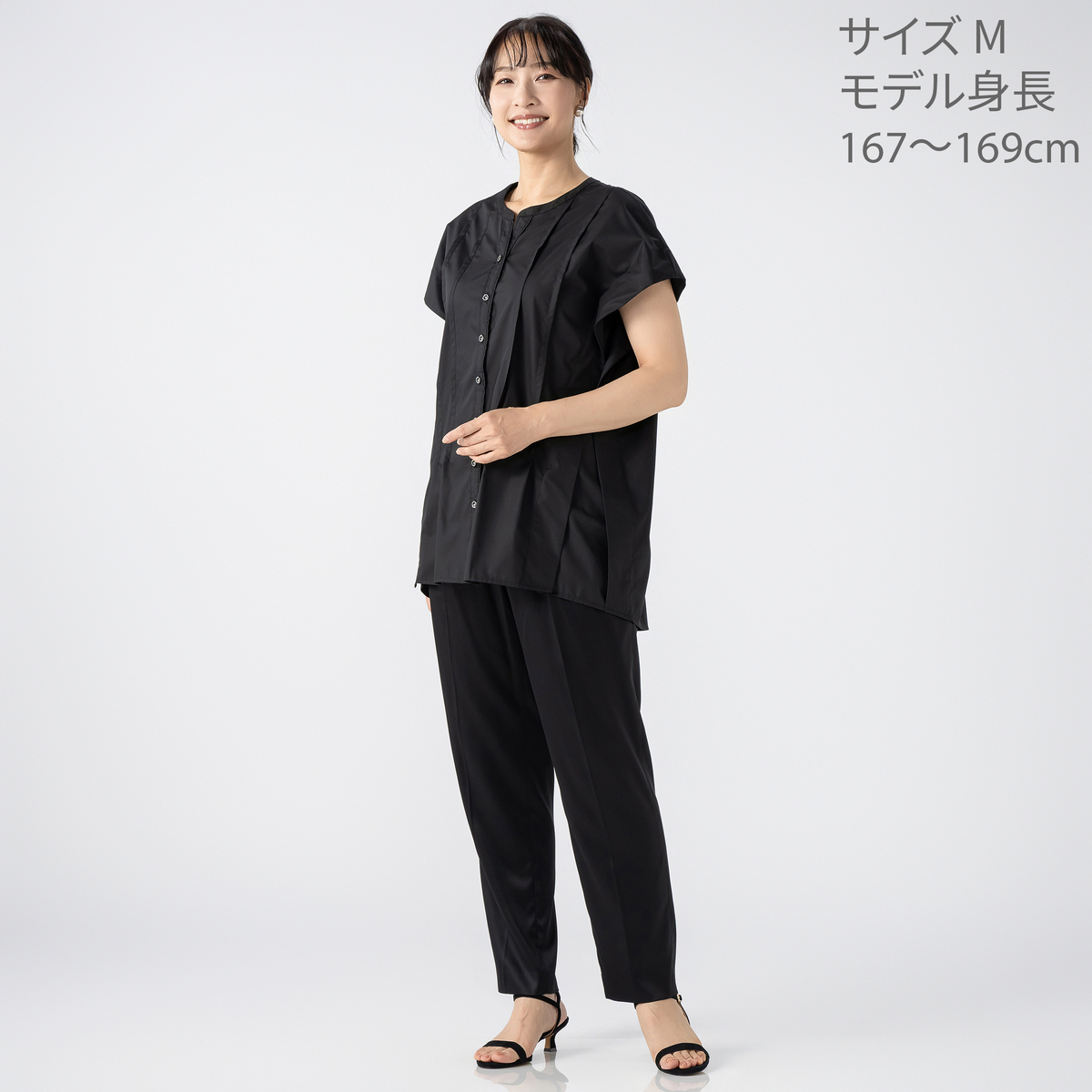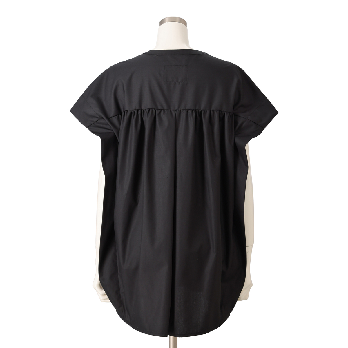 フロントの立体的なタックディテールや、構築的なデザインが目を引くフレンチスリーブシャツブラウス。マント風にも見えるデザインです。後ろの着丈を少し長めにすることでヒップが隠れ、立体感あるシルエットが自然に体型をカバーし、美しいラインを作ります