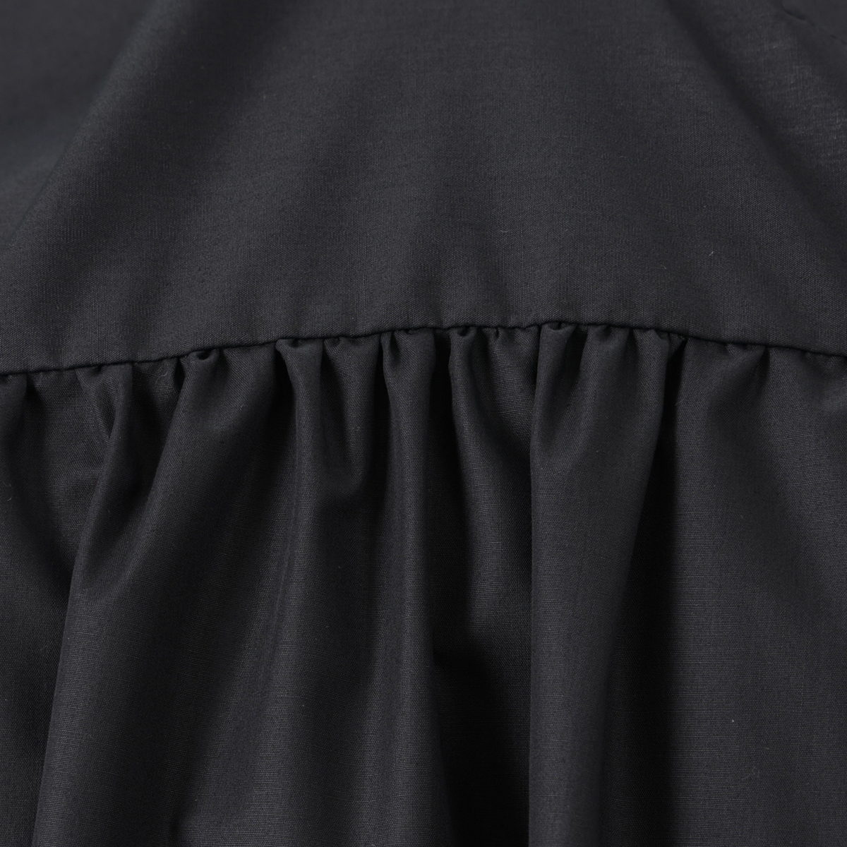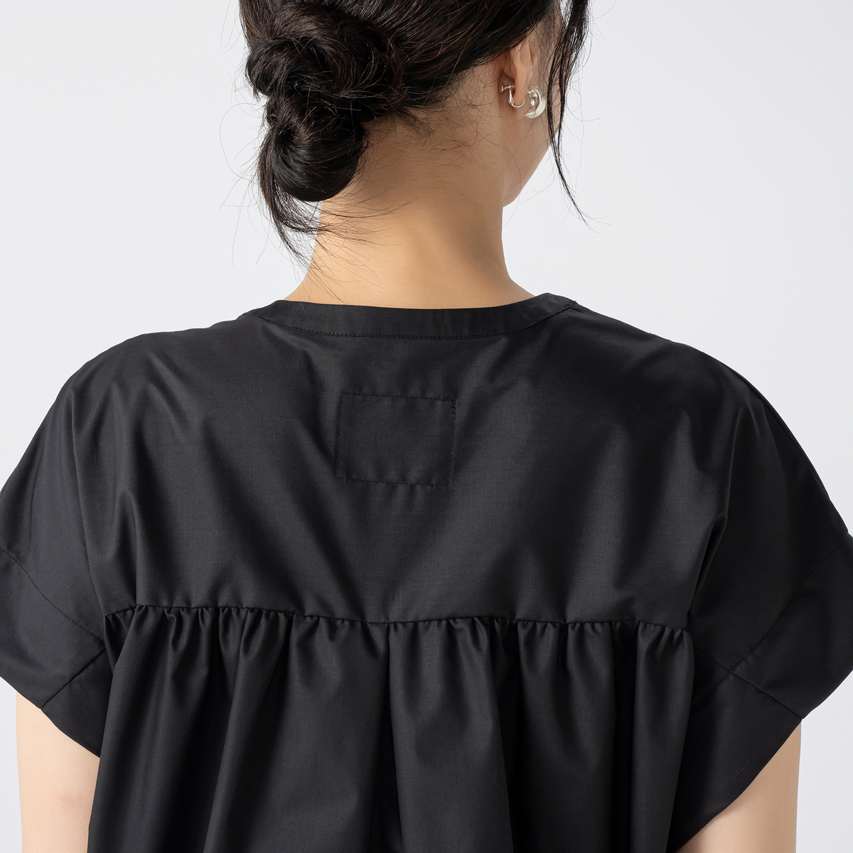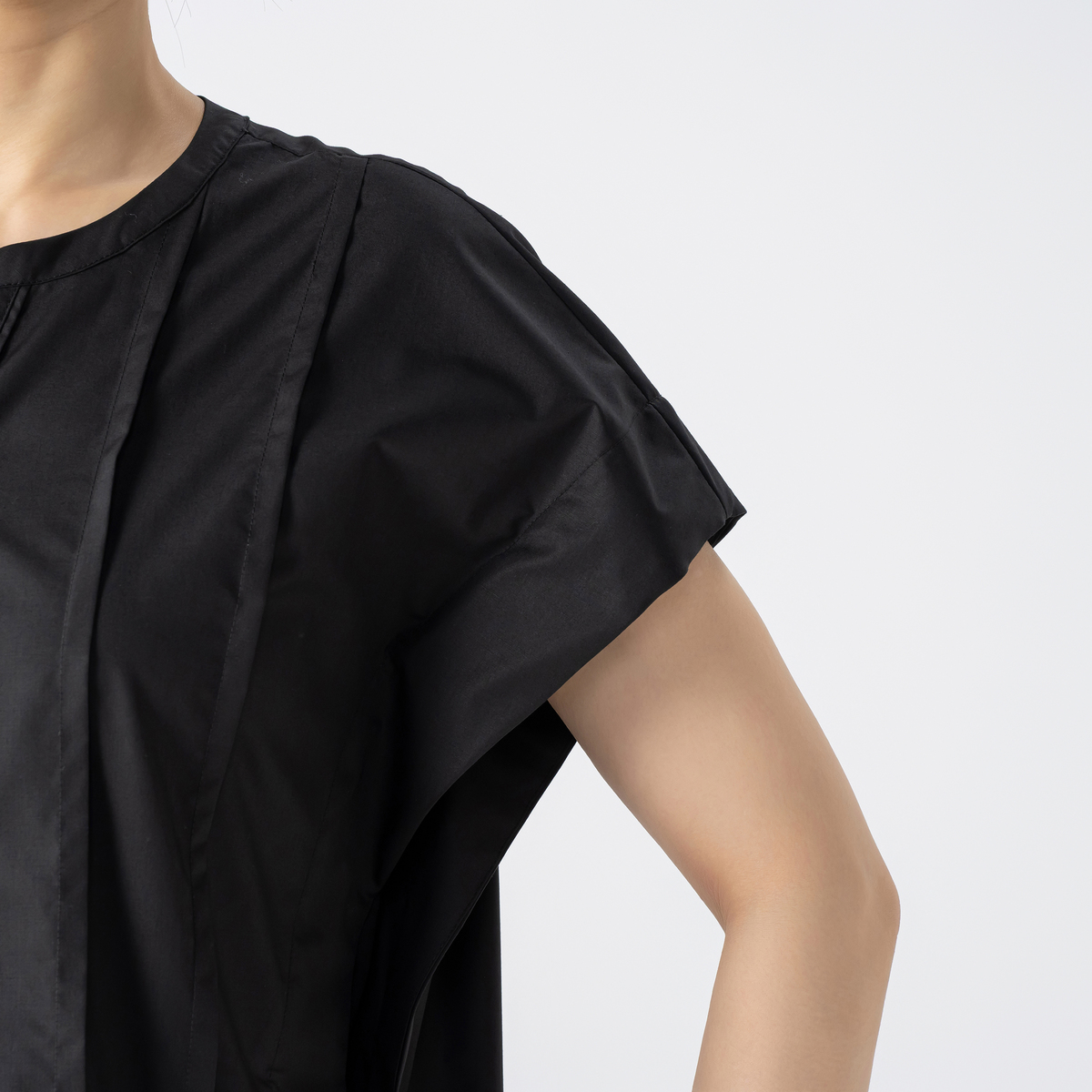 織り目が詰まった布帛素材で適度な艶感があり、綺麗見えを叶えます。ポリエステルと綿の混紡素材で、ハリ感と軽やかな質感を実現し、身体のラインを拾いにくいのも嬉しいポイントです