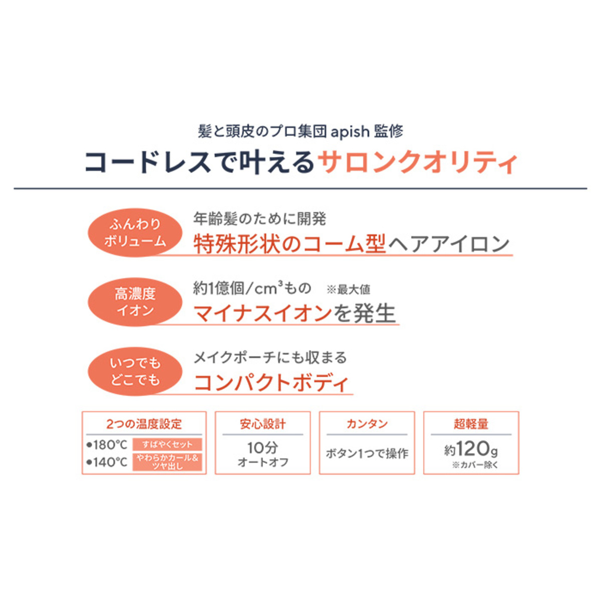 [商品内容] ・本体 ・充電ケーブル ※ACアダプターは付属しません [サイズ(約)] 幅10.6×奥行3.3×高さ8.15(カバーなし:7)cm [重量(約)] 135g(カバーなし120g) [材質] ABS樹脂、ナイロン樹脂、アルミニウム [充電時間] 約180分 [使用可能時間] 140℃:約40分 180℃:約25分 [定格時間] 10分 ■取り扱い説明を充分にご確認の上、ご使用下さい 【中国製】 [注意事項] ※次のような医療機器用電子機器をお使いの方は使用しないでください。症状を悪化させるおそれがあります ・ペースメーカーなどの体内植込み型電子機器 ・人工心肺などの生命維持用医用電子機器 ・心電計などの装着型医用電子機器 ・知覚障害や意思表示のできない方 ・幼児や自分で意思表示できない方 ・温度や刺激の感覚が自覚できない方 ※髪の毛以外の部位には使用しないでください ※次のような方は、必ず医師とご相談の上、使用してください ・皮膚病およびアトピー性皮膚炎の方 ・アレルギー体質、接触型皮膚炎等、皮膚に既往症のある方や ・使用に際してお肌、頭皮に不安のある方 ・過去に素肌に使用する製品などで皮膚にトラブルや障害をおこしたことがある方 ・敏感肌や肌の弱い方 ・脱毛などの髪の毛に関する疾患のある方 ※使用前や使用中、肌や身体に異常を感じたときは、ただちに使用を中止し、医師にご相談ください ※ACアダプターは付属しません ※お風呂場など、高温多湿の場所やほこりの多い場所で使用・保管しないでください ※コーム中央の電熱部に手や指を強く押し当てないでください ※異常な音、におい、煙が出たとき、内部に異物が混入したときは電源をオフにし、販売店までご連絡ください ※本体・付属品を濡れた手で操作しないでください。また、水につけたり、水を使用してお手入れしないでください ※お子様・ペットの手の届くところに置かないでください。また、お子様・ペットには使用しないでください ※火に入れないでください ※踏みつけたり、落下させたり、強い衝撃を与えないようにしてください ※可燃物や重いものを乗せたり、毛布や座布団で覆ったり、包んだりしないでください ※本製品はリチウムイオン電池を内蔵しております。次のようなことは絶対にしないでください ・加熱や火中投下 ・高温多湿環境でのご使用、充電、放置 ・火気のある環境でのご使用、充電、放置 ・ほこりやチリの多い環境での放置 ・直射日光が当たる場所や炎天下の車中など高温になる場所でのご使用、充電 ※付属の充電用ケーブル以外に接続しないでください ※本体の充電ポートの間に、ピンのような鋭いものや異物を差し込まないでください ※付属の充電用ケーブルを他の機器には絶対に使用しないでください ※お手入れの際は必ず充電用ケーブルを本体から抜いてください ※充電池は消耗品です。(保証対象外)充電しても使用時間が極端に短くなった場合は、充電池の寿命と考えられます ※充電池の寿命は使用・保管などの状態により大きく変化します ※長期間使用しないときは、本体を満充電にしてから保管してください。長期間充電しなかった場合、充電ができなくなることがあります。また3ヶ月ごとに本製品を動作させて、再度充電してください ※廃棄の際は、お住まいの地方自治体の条例に従って処分してください。条例の詳しい内容は、各地自治体にお問い合わせください。充電用ケーブルはお住まいの地方自治体の廃棄区分に従って処分してください