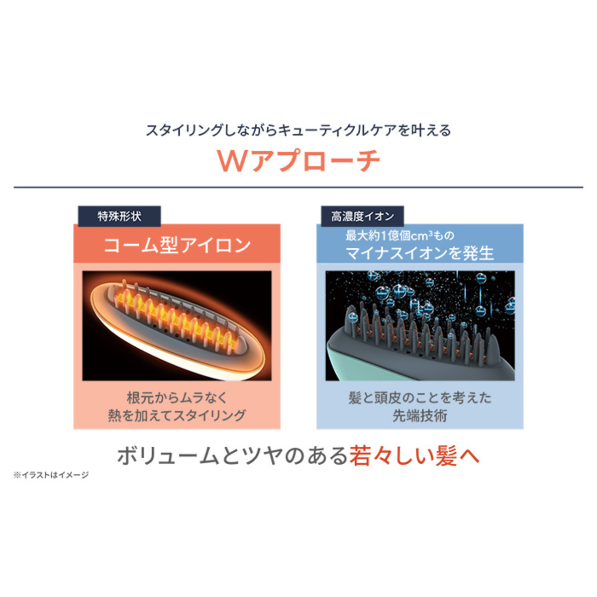 ブラシに埋め込まれたプレートが熱を面で伝える事で髪を効率的にスタイリングできる設計。また、最大で1億個/cm3のマイナスイオンが発生します