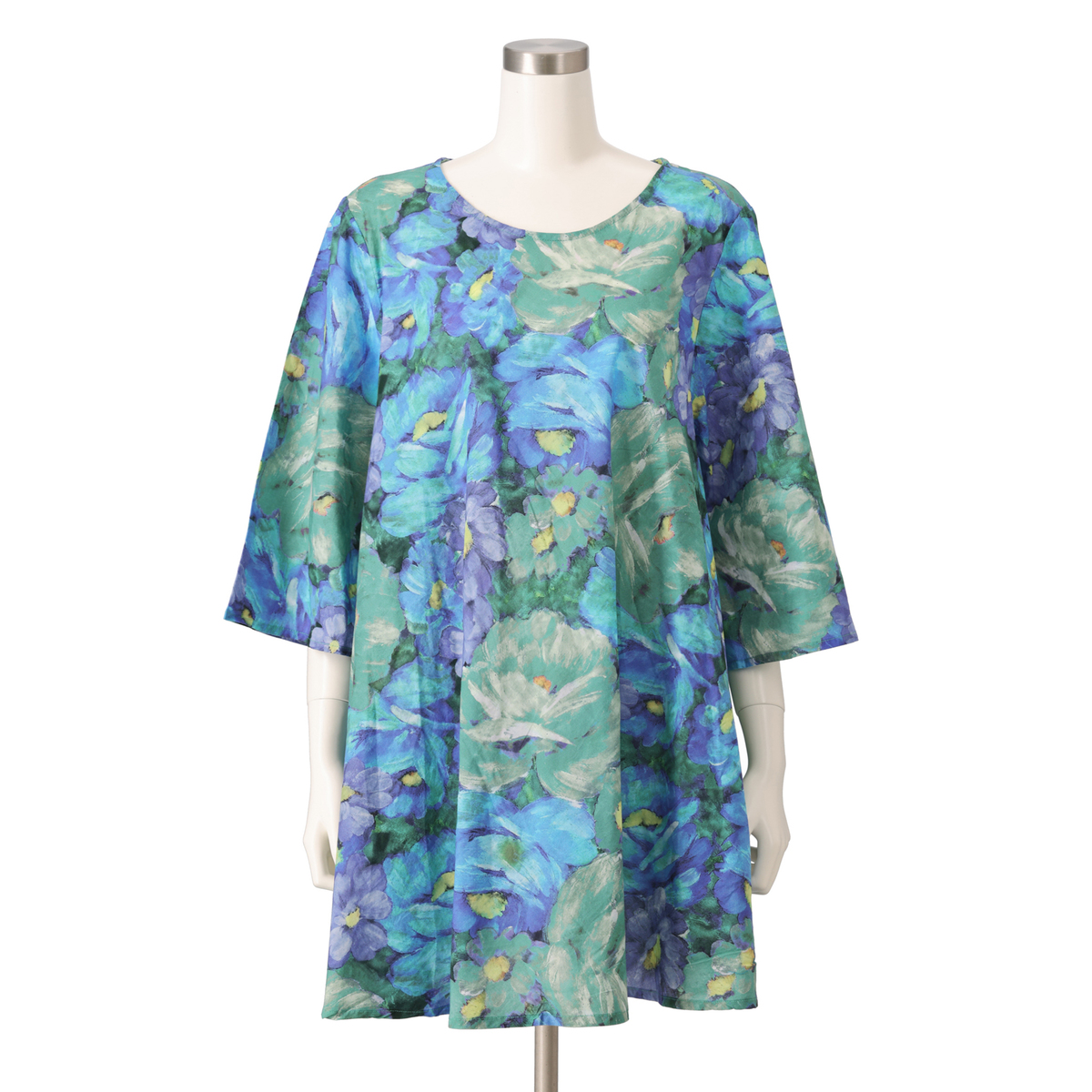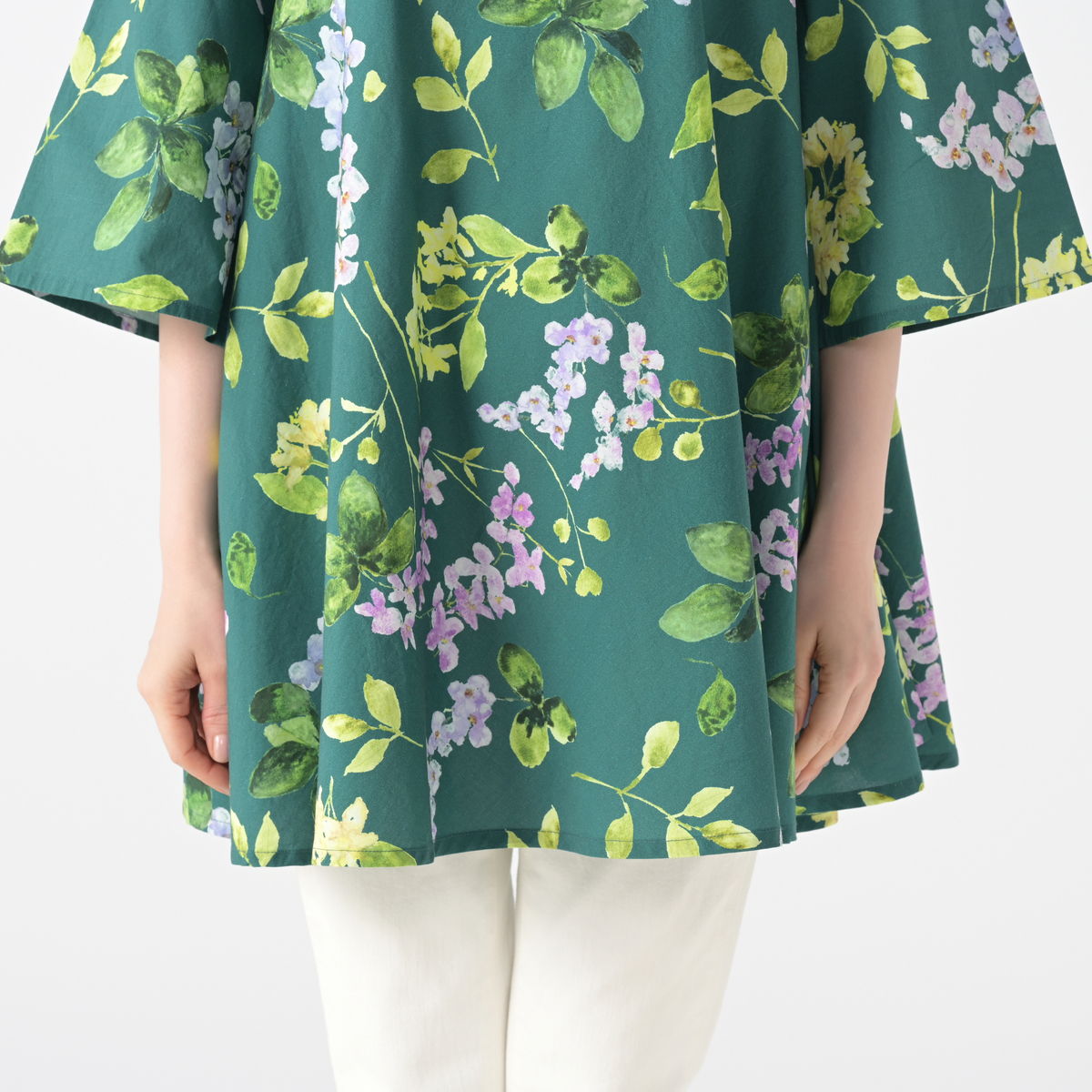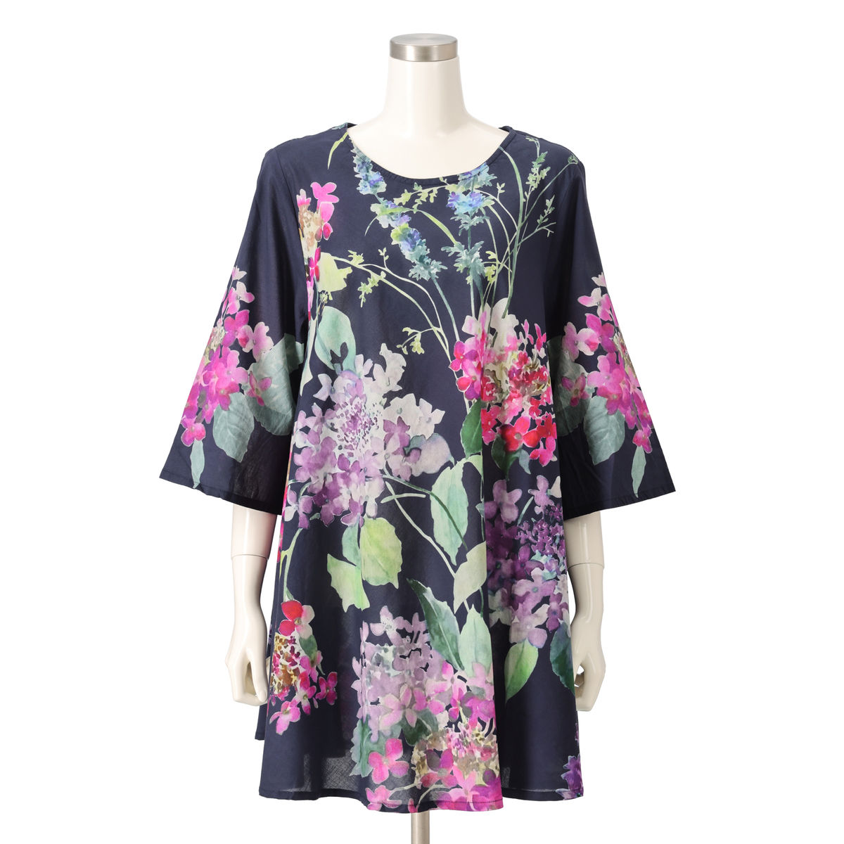 さらっとしたインド綿を使用したプリントチュニック。華やかなプリントがコーデのポイントになってくれます。生地をバイヤスに裁断し贅沢にゆったり使っている為、きれいなドレープが出て、エレガントな雰囲気で着こなせます