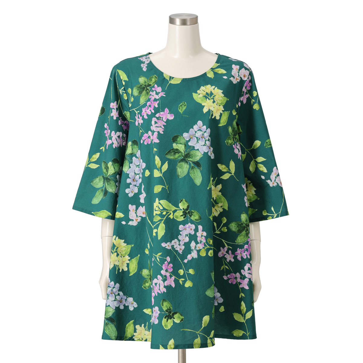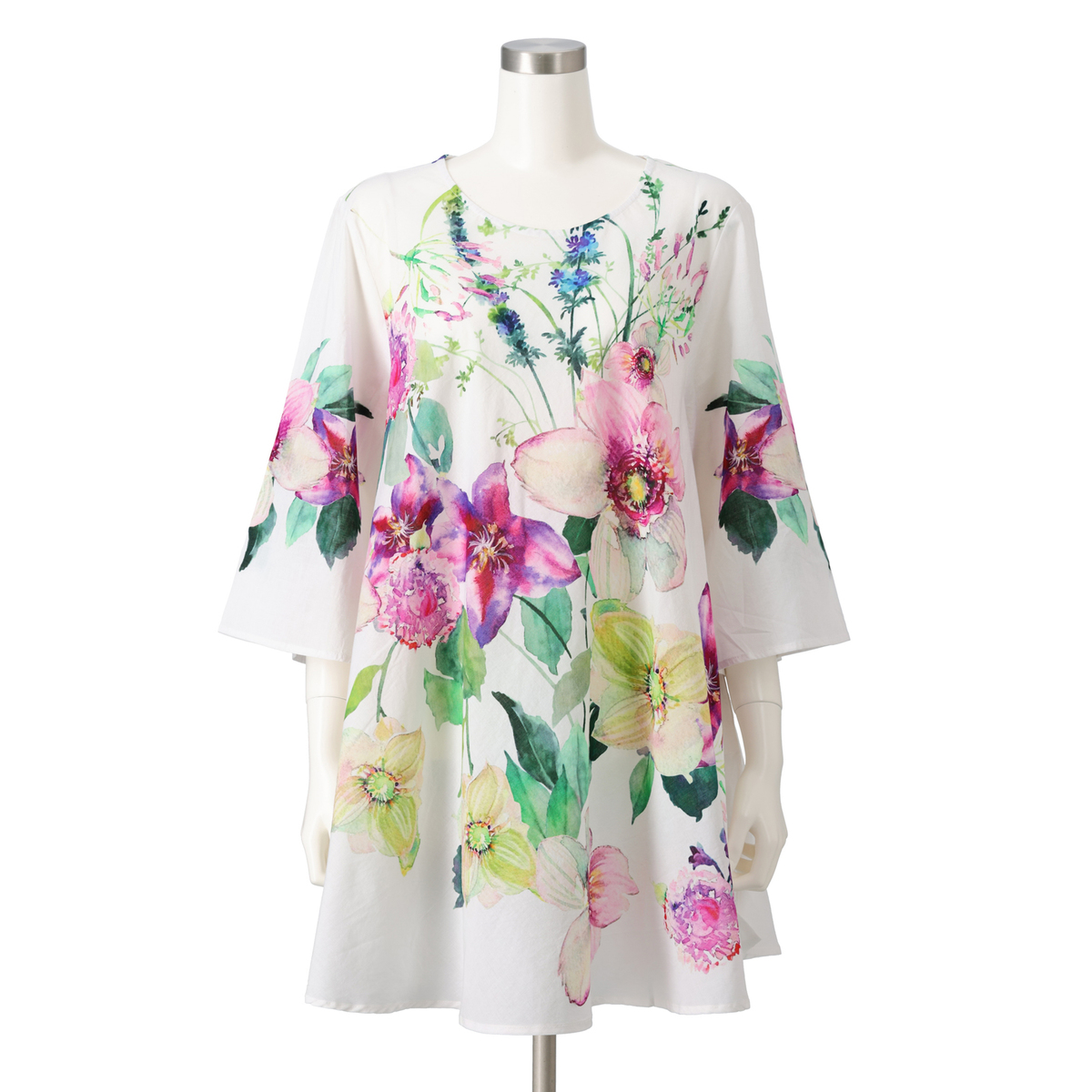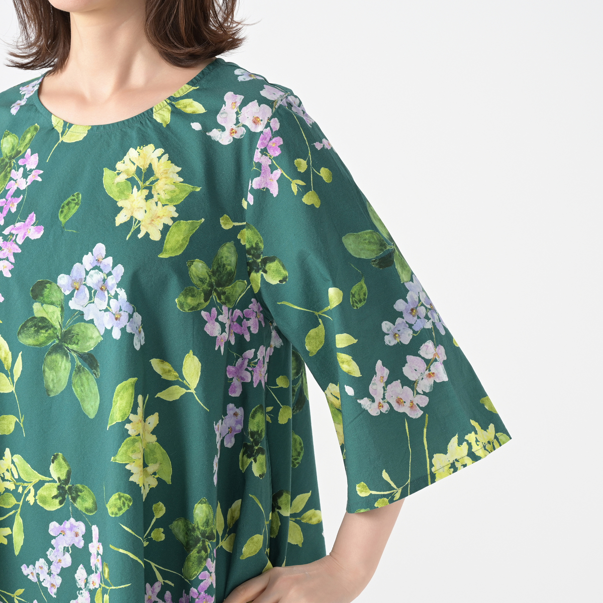 さらっとしたインド綿を使用したプリントチュニック。華やかなプリントがコーデのポイントになってくれます。生地をバイヤスに裁断し贅沢にゆったり使っている為、きれいなドレープが出て、エレガントな雰囲気で着こなせます