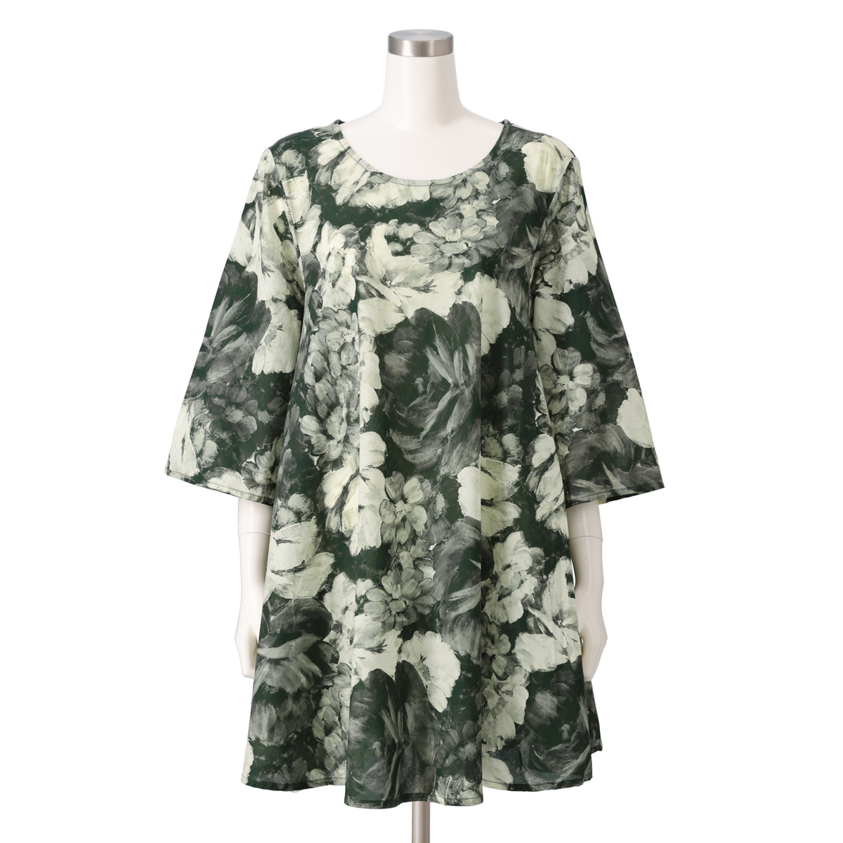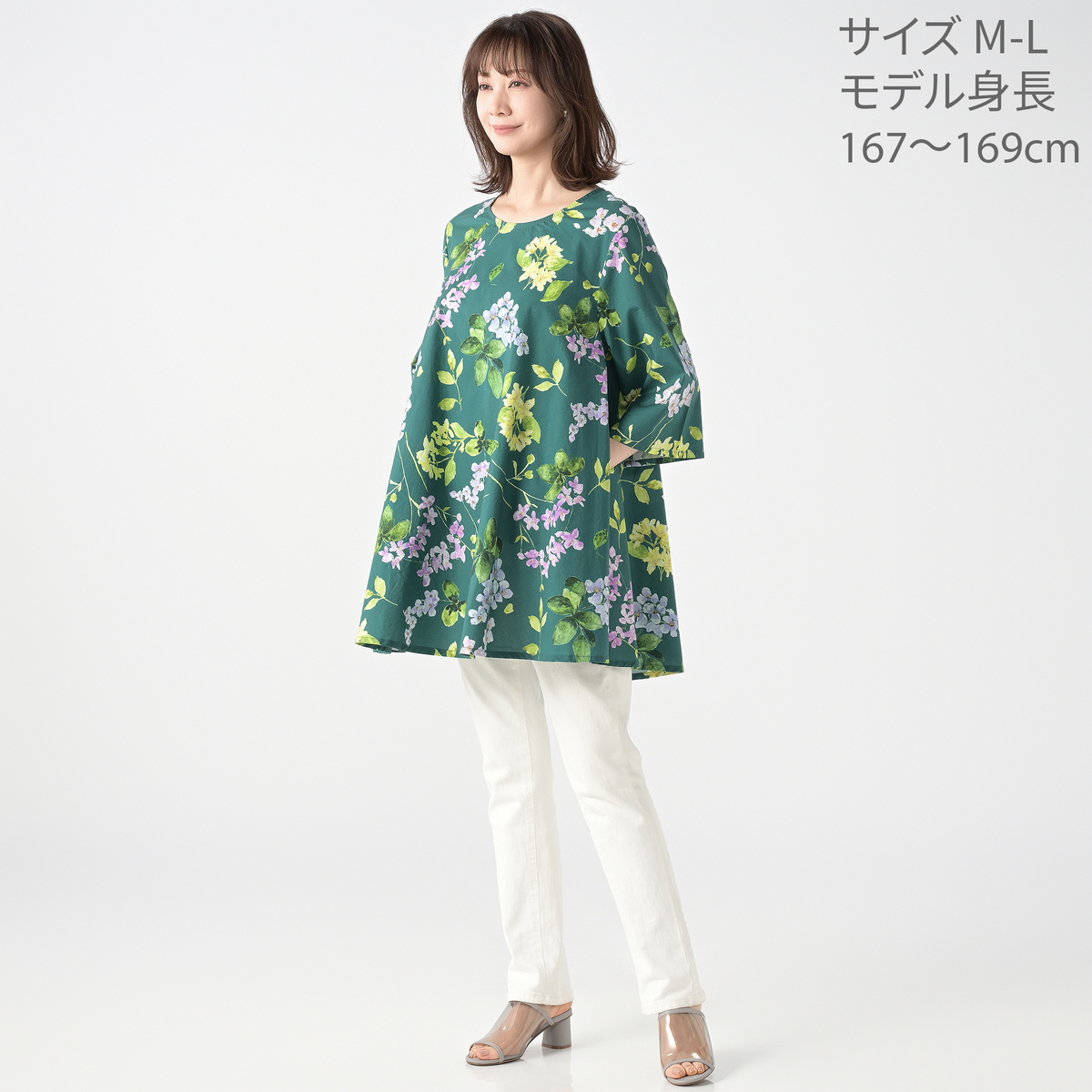 ヒップ周りや二の腕をしっかりカバーしてくれるシルエットで、きれいに広がったドレープにより細見え効果が期待できます。また、バイヤス裁断により背中のあたりも伸び縮みするので、腕を前にした時も窮屈に感じにくく楽な着心地です