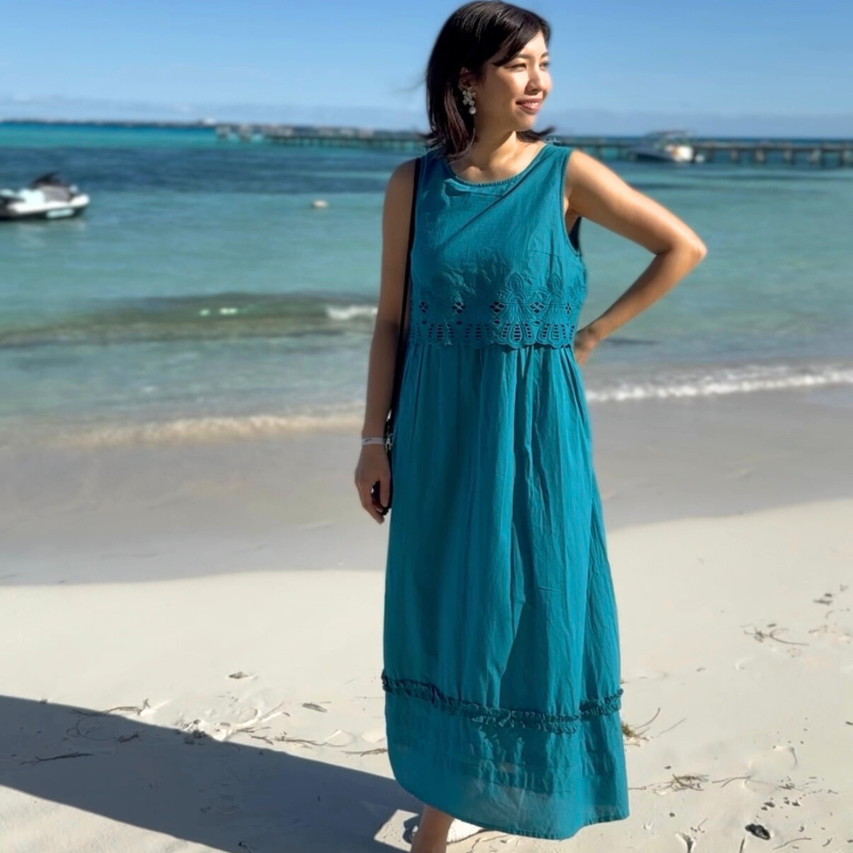 切り返し部分と裾のカットワークと刺繍が涼し気な印象を与えるワンピース。裾部分が広くエレガントで、裾さばきもきれいです
