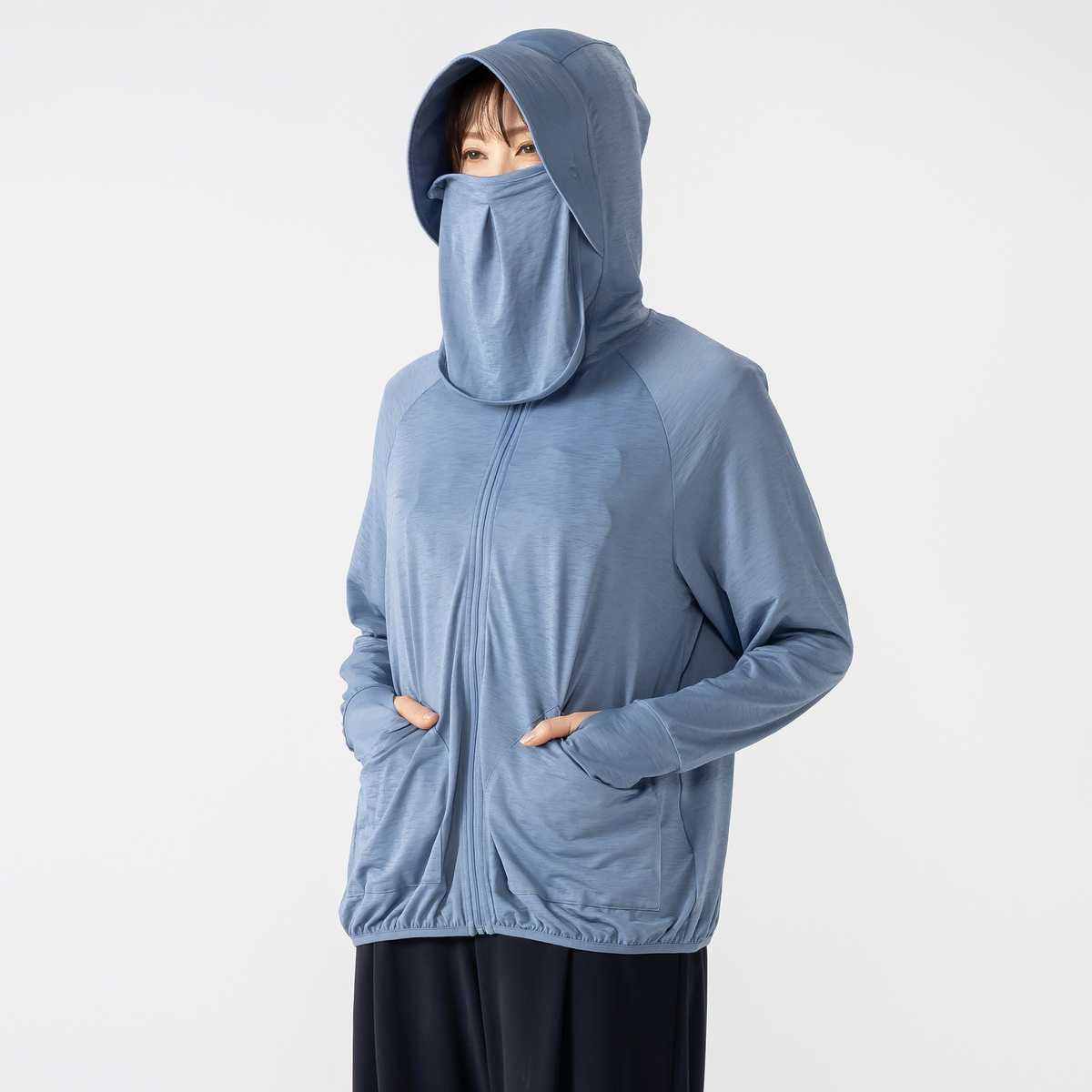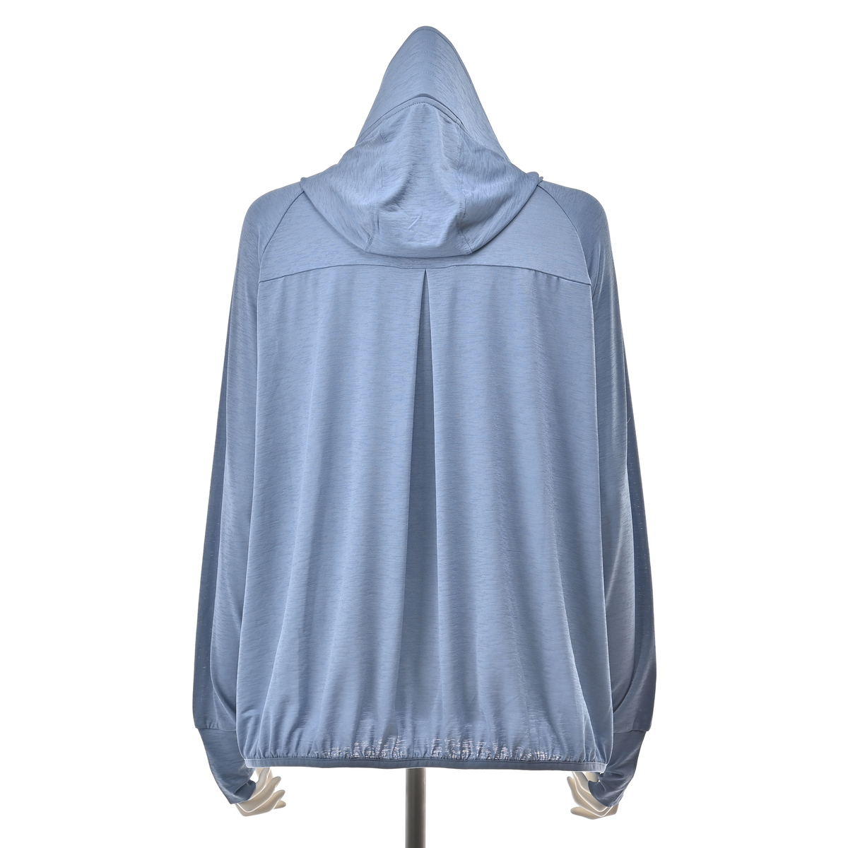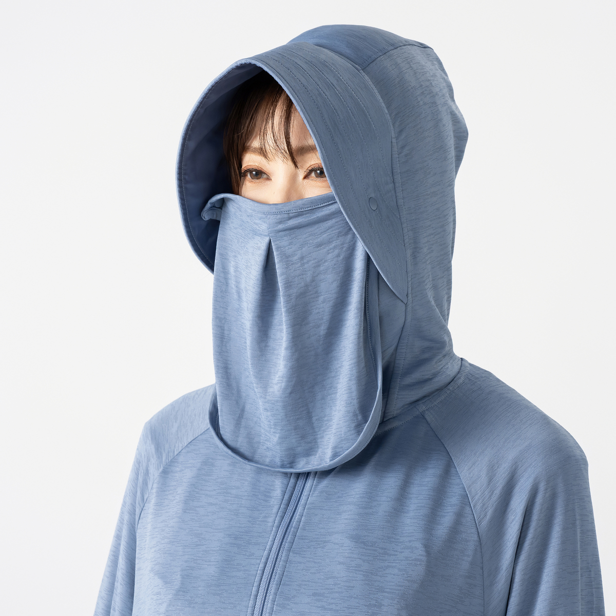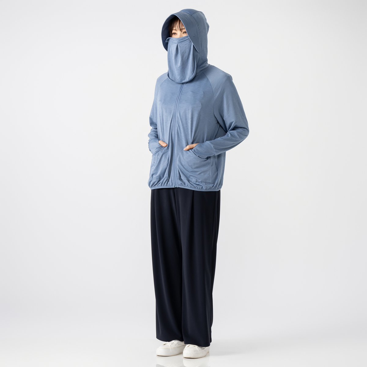 日焼け対策のための機能を備えたパーカー。ラグランスリーブで後ろヨーク部分にもタックを入れたリラックス感のあるデザインです。日焼け対策のためにマスクやフード、指先まで覆えるデザインにしました