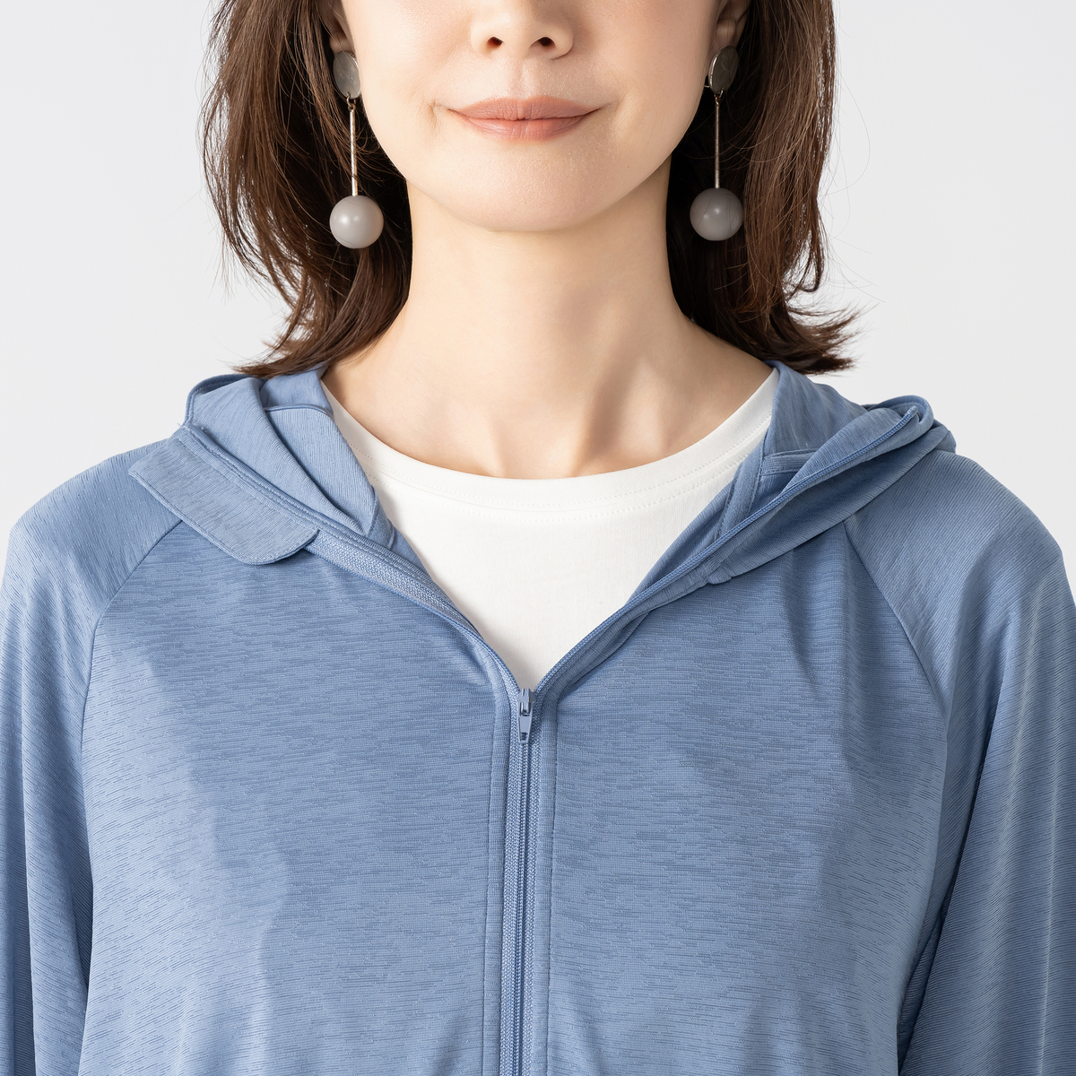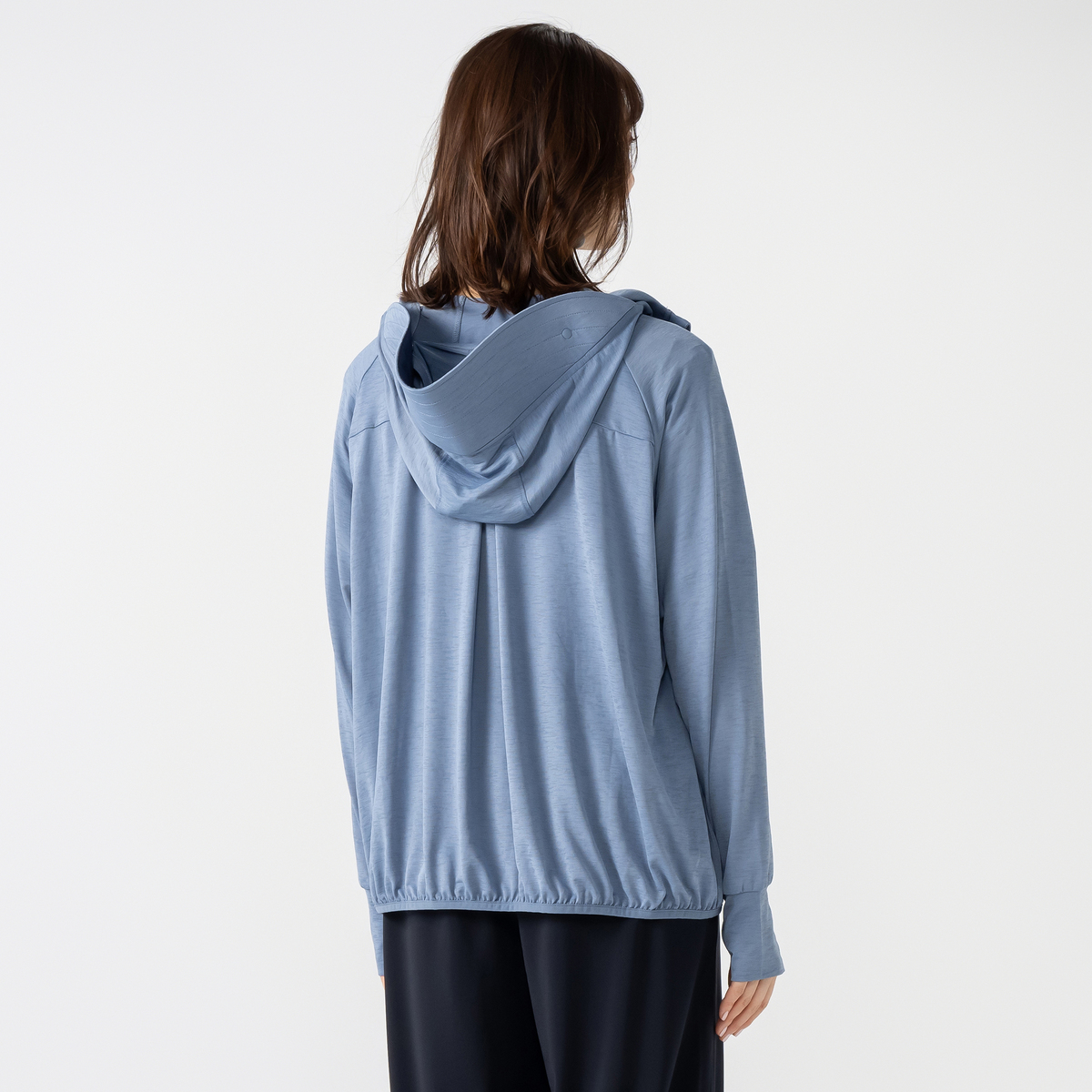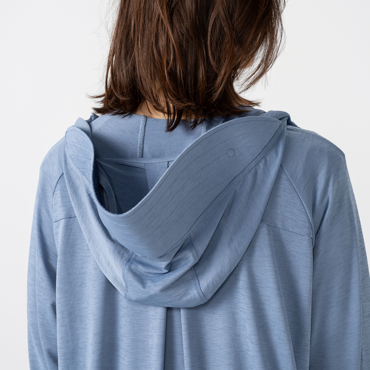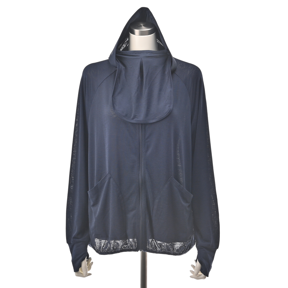 日焼け対策のための機能を備えたパーカー。ラグランスリーブで後ろヨーク部分にもタックを入れたリラックス感のあるデザインです。日焼け対策のためにマスクやフード、指先まで覆えるデザインにしました