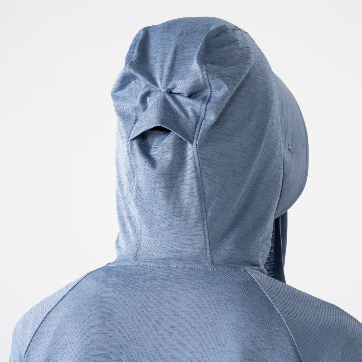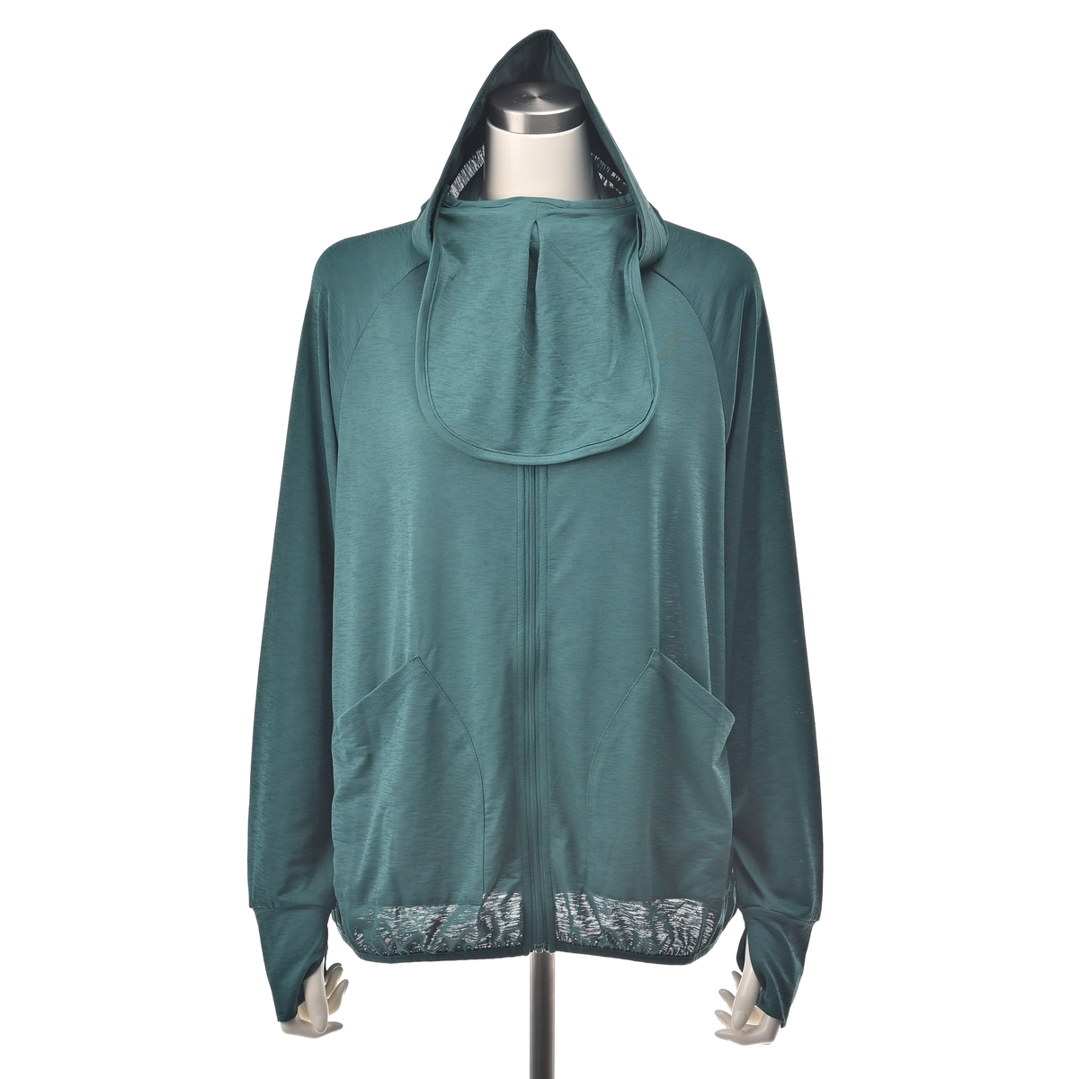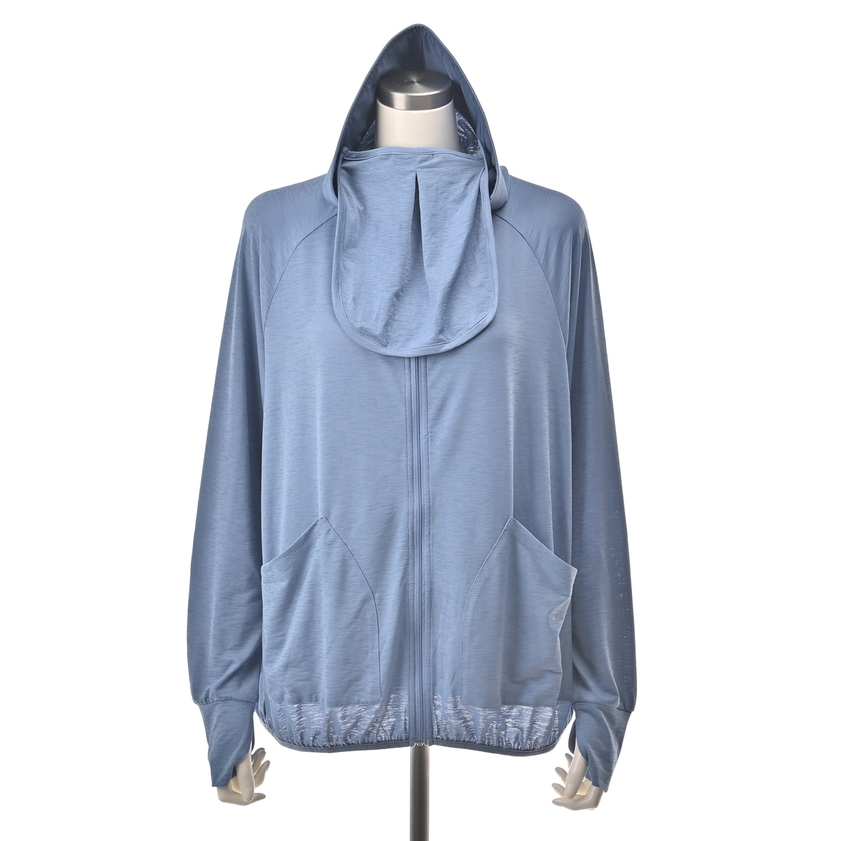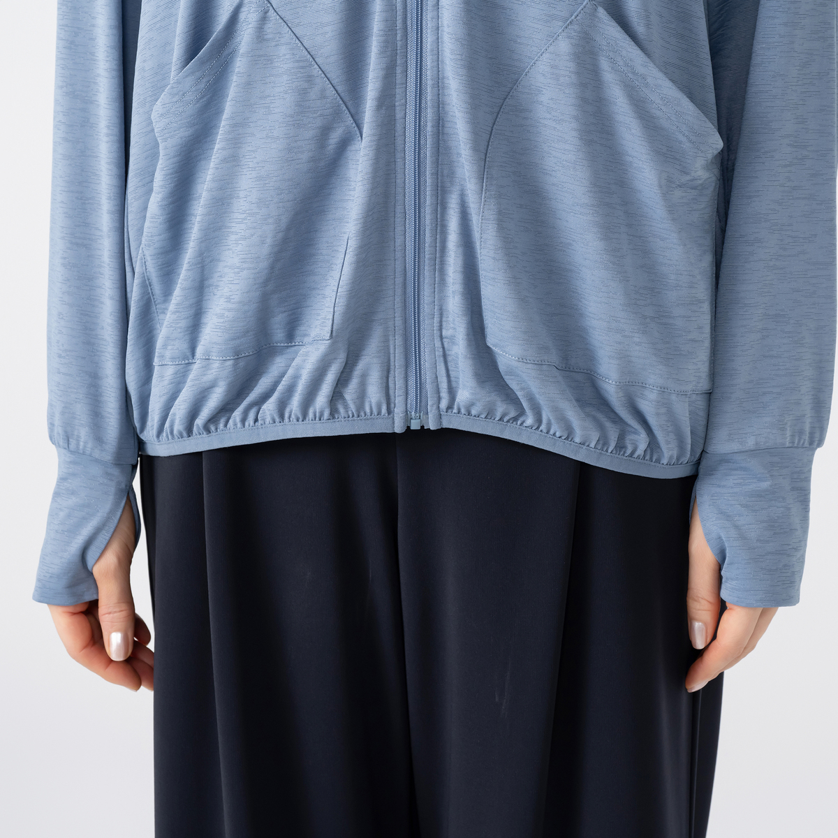 日焼け対策のための機能を備えたパーカー。ラグランスリーブで後ろヨーク部分にもタックを入れたリラックス感のあるデザインです。日焼け対策のためにマスクやフード、指先まで覆えるデザインにしました