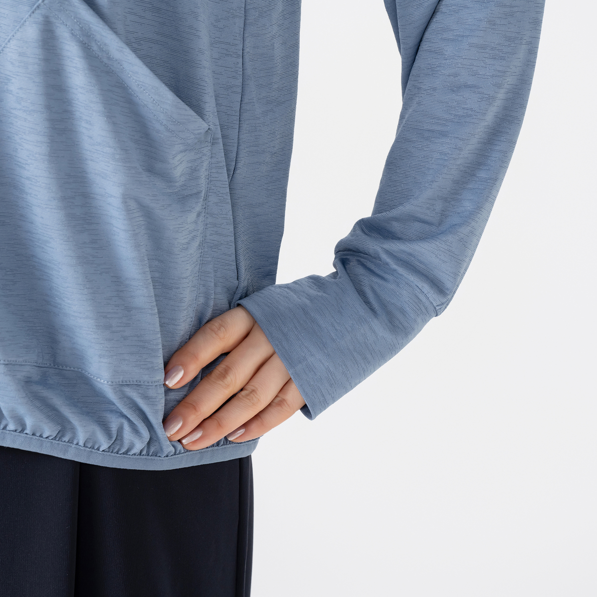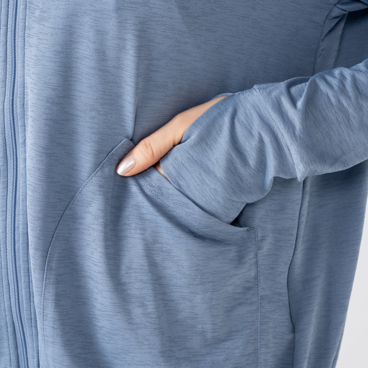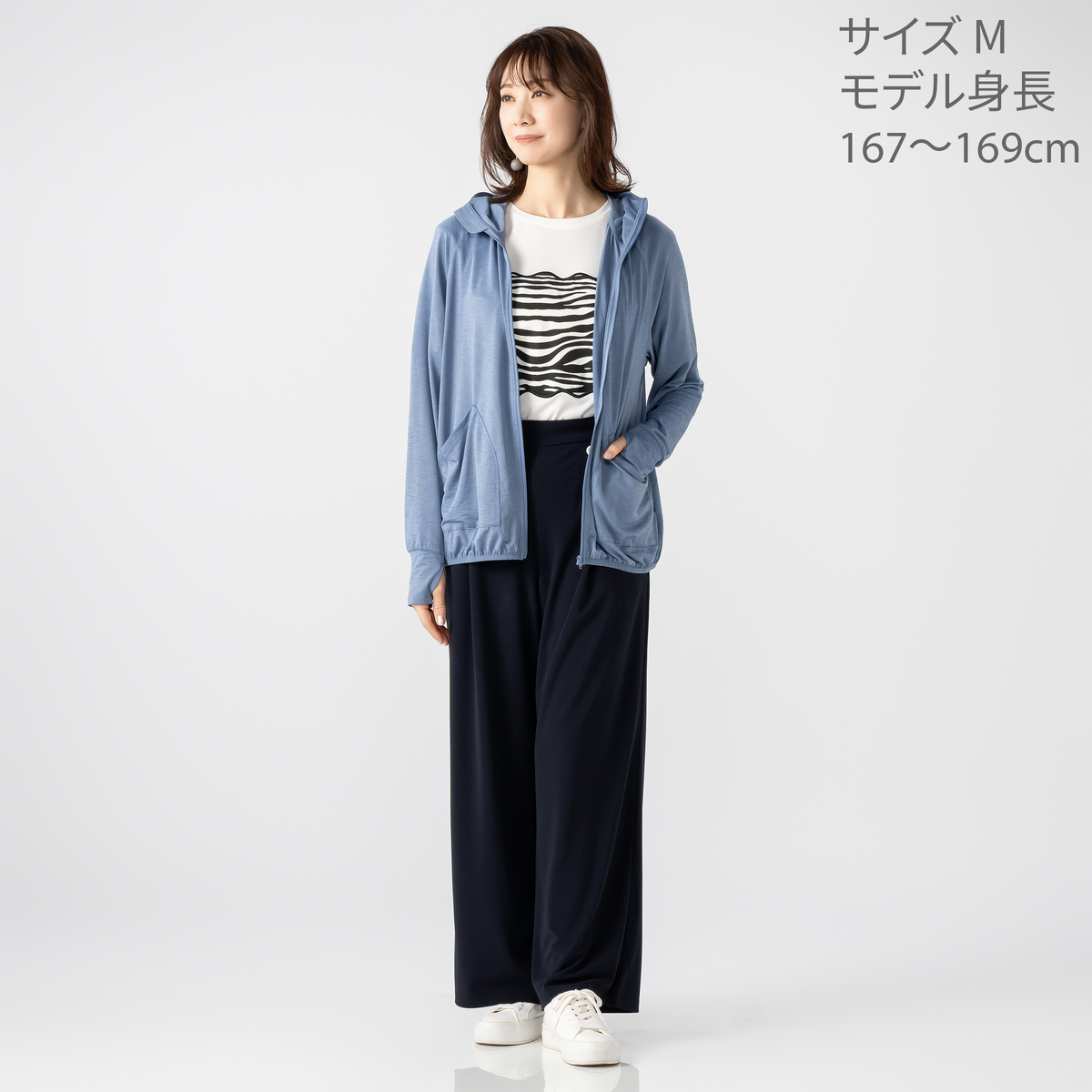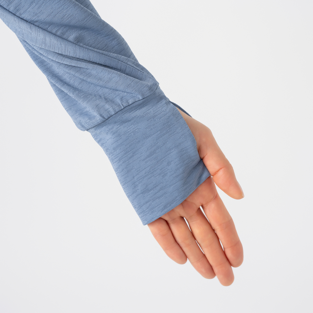 日焼け対策のための機能を備えたパーカー。ラグランスリーブで後ろヨーク部分にもタックを入れたリラックス感のあるデザインです。日焼け対策のためにマスクやフード、指先まで覆えるデザインにしました