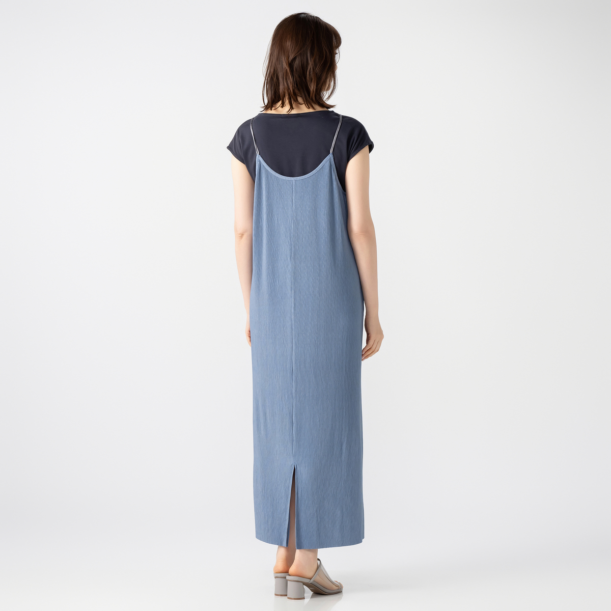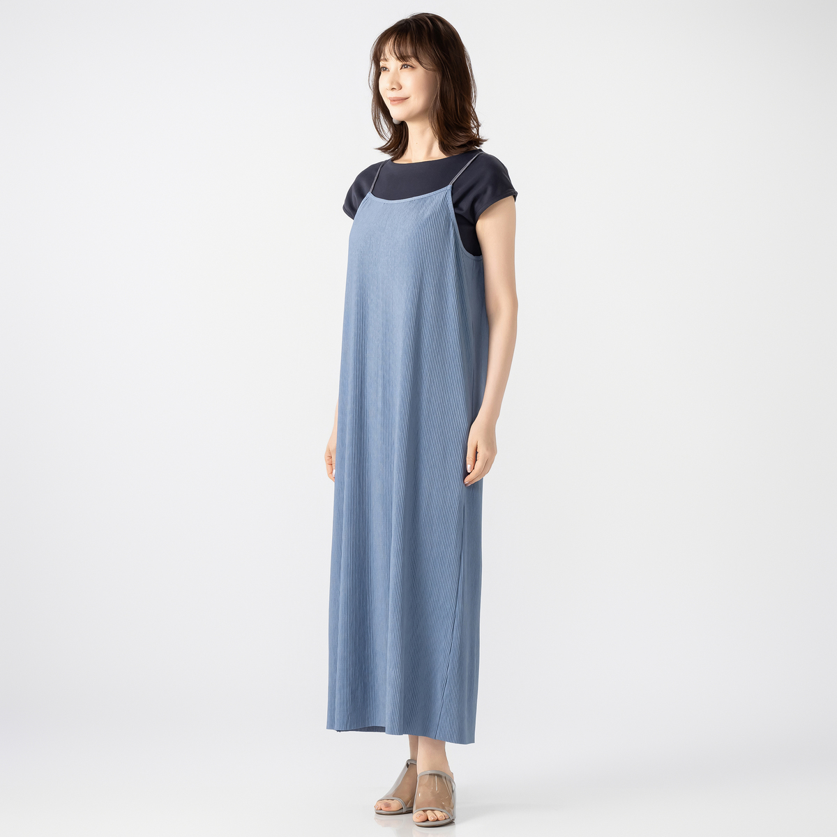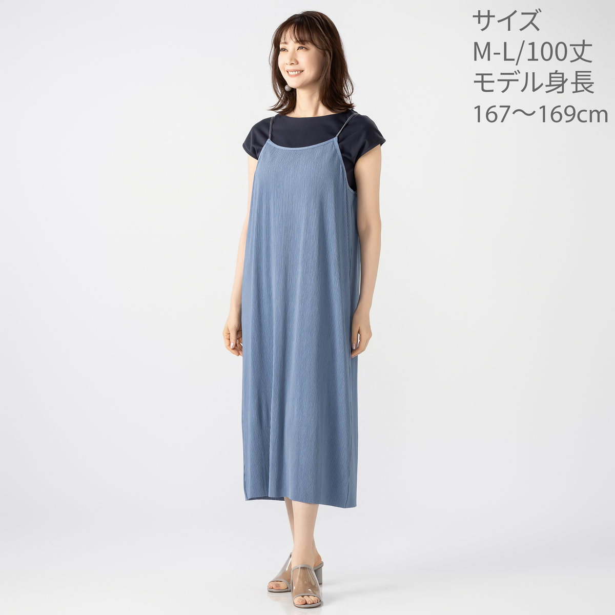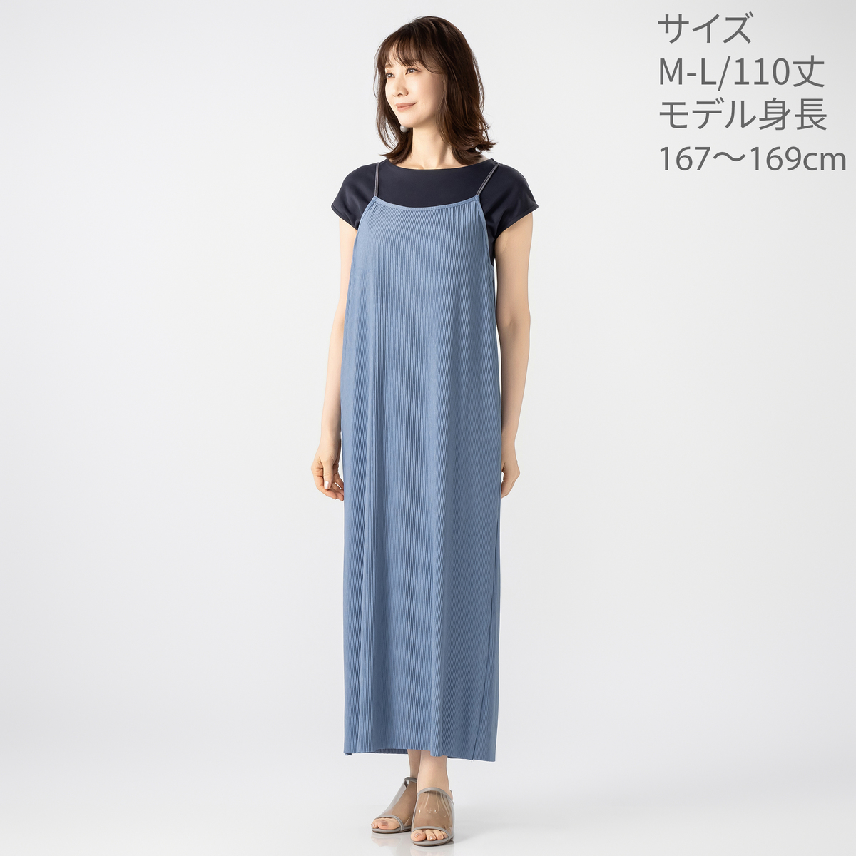 プリーツ加工の素材を使用したキャミワンピ。ゆったりしたシルエットで窮屈感が少なく、後ろ中心にスリット入りで、長めの着丈ながら歩きやすくなっています
