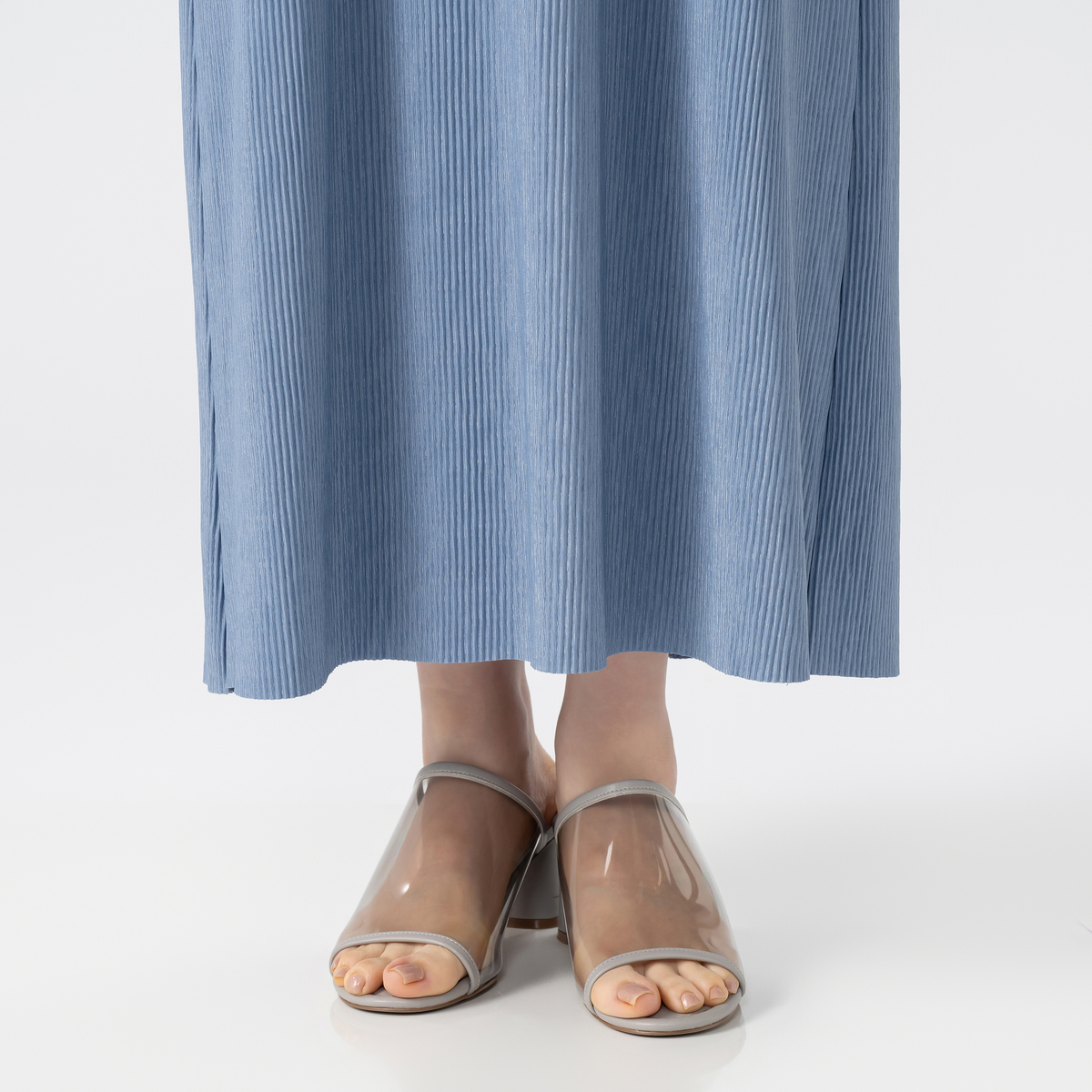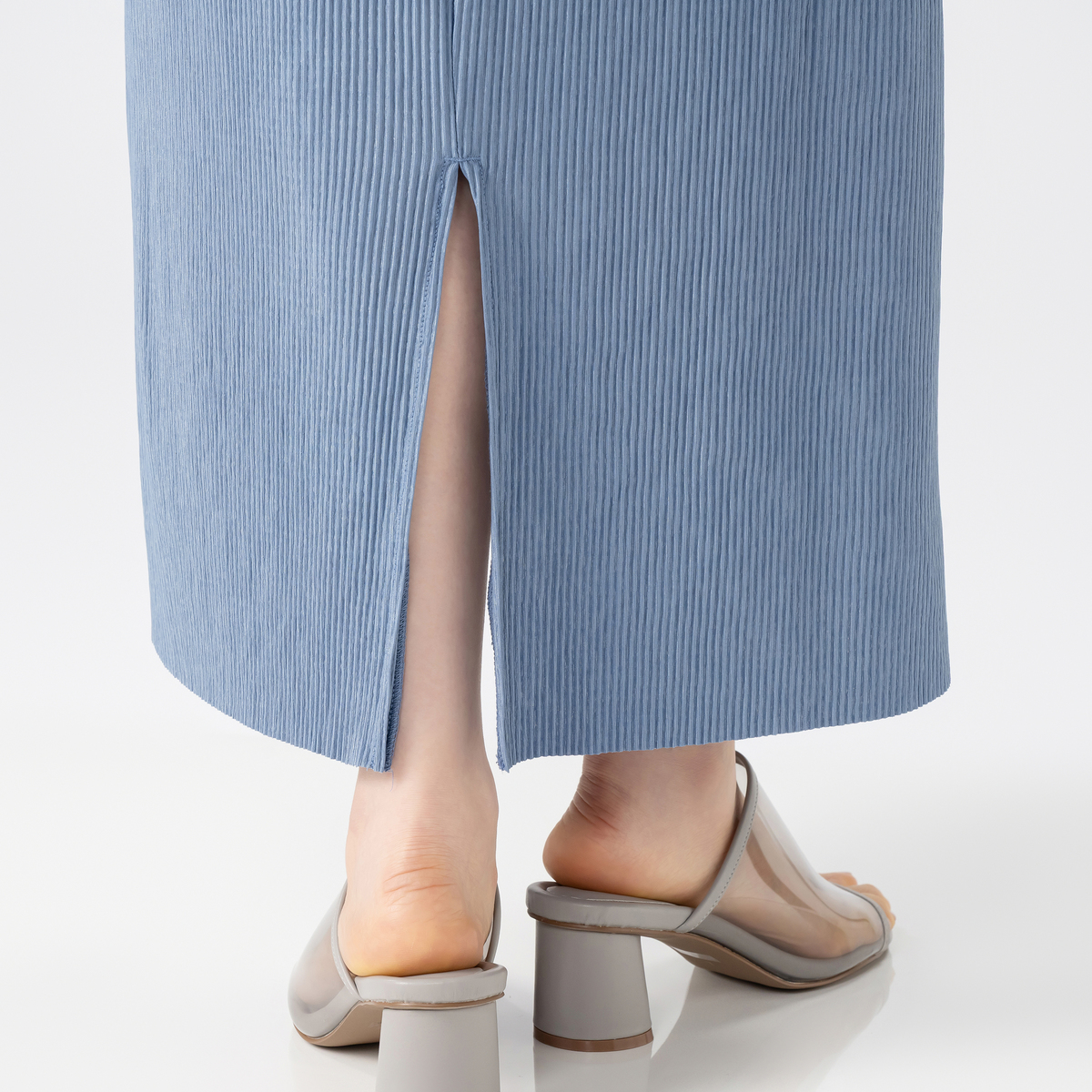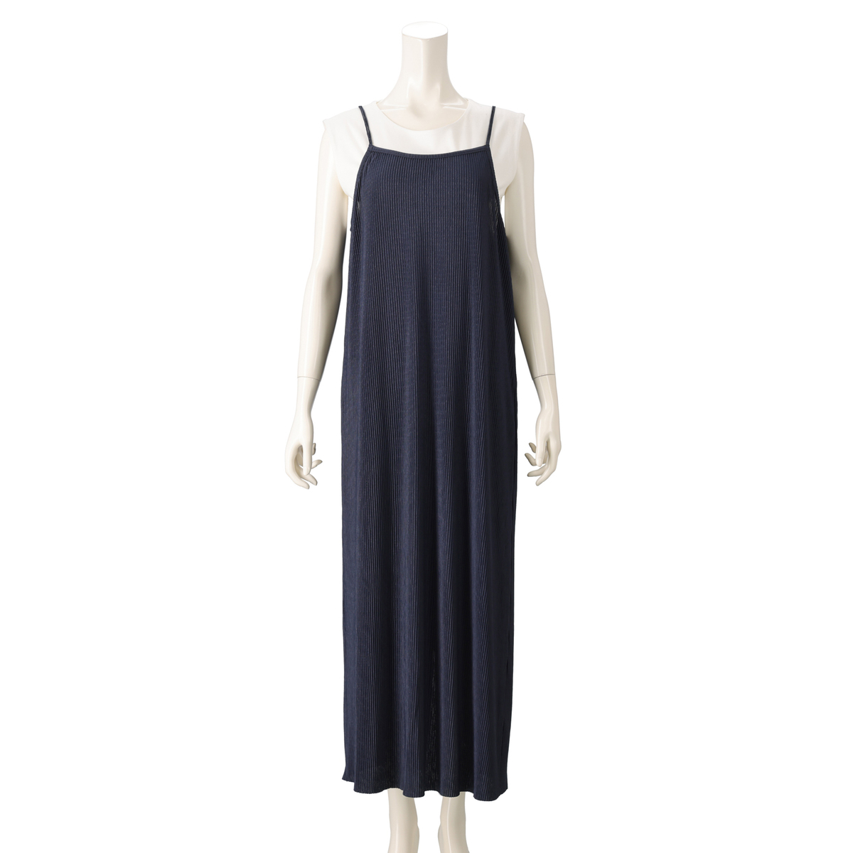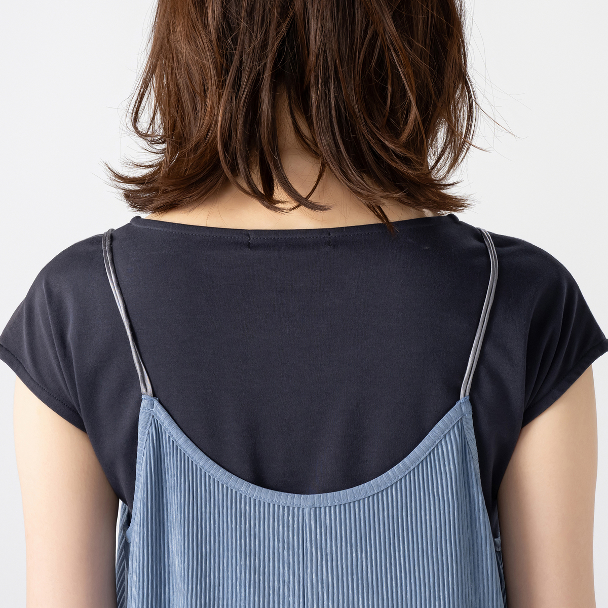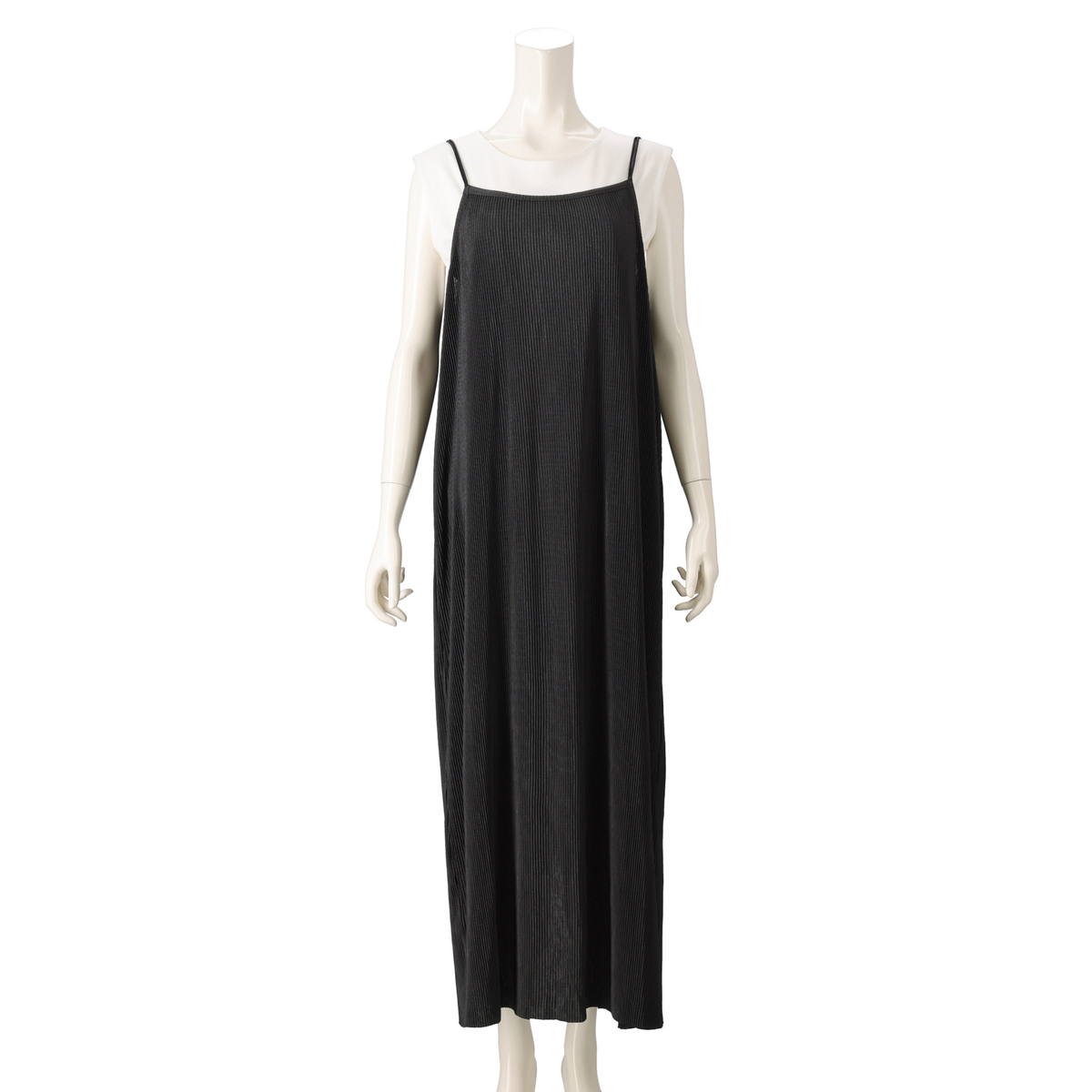 プリーツ加工の素材を使用したキャミワンピ。ゆったりしたシルエットで窮屈感が少なく、後ろ中心にスリット入りで、長めの着丈ながら歩きやすくなっています