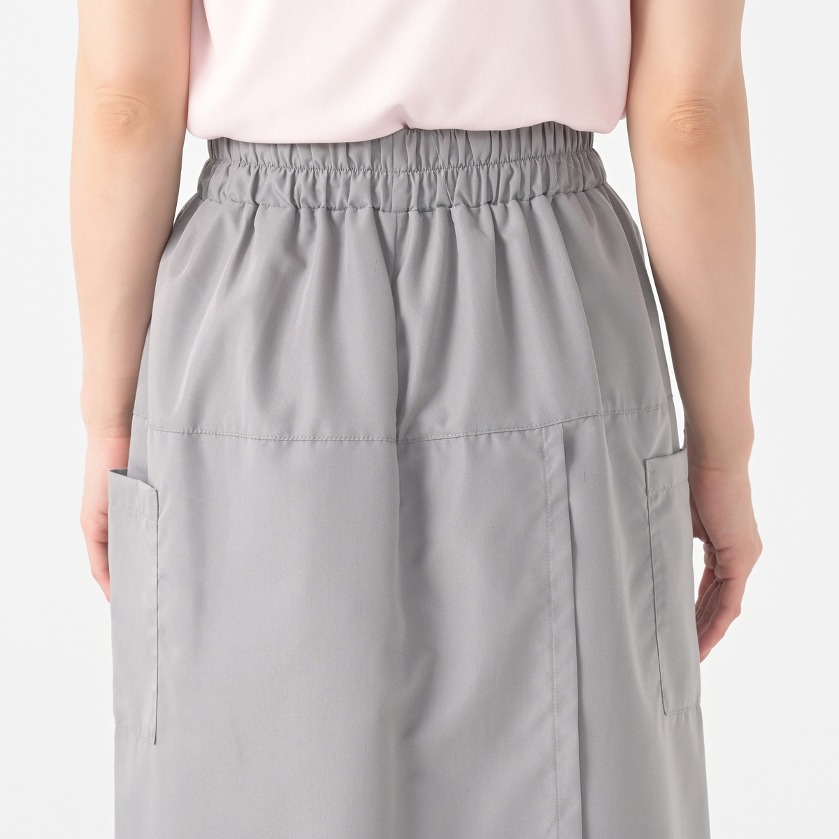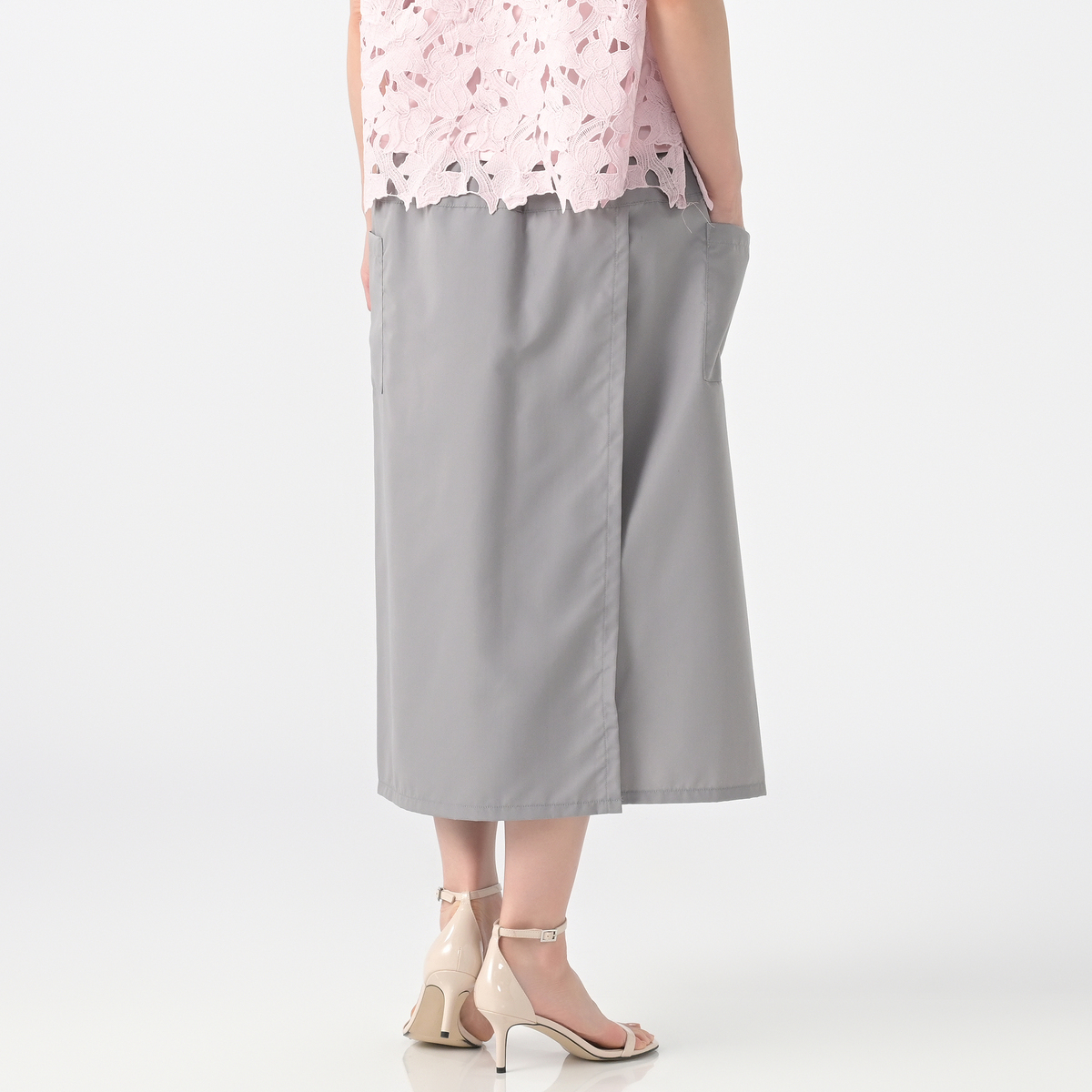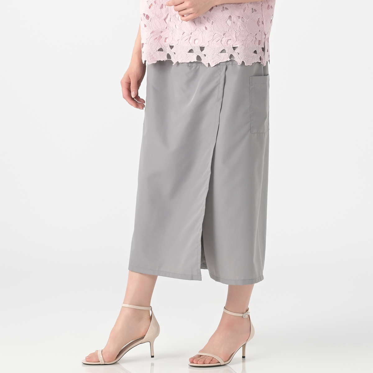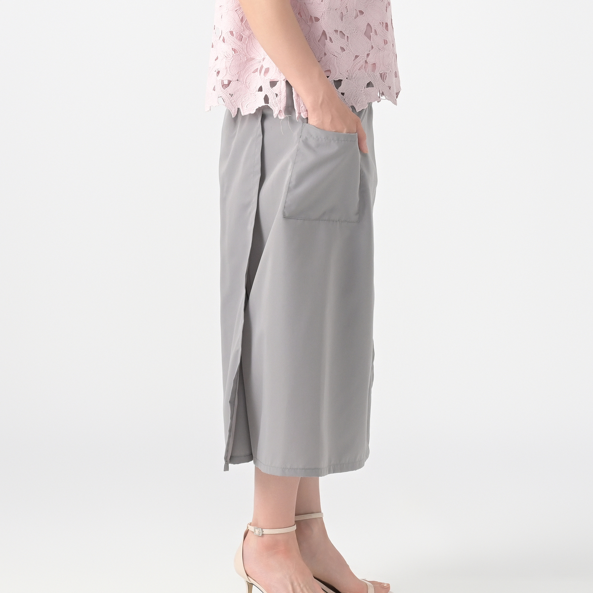 Aラインシルエットのラップ風スカーチョ。動きやすさと上品さを兼ね備えたスカート見えするパンツです。両サイドにあしらった大きめのパッチポケットでワークテイストを表現しました