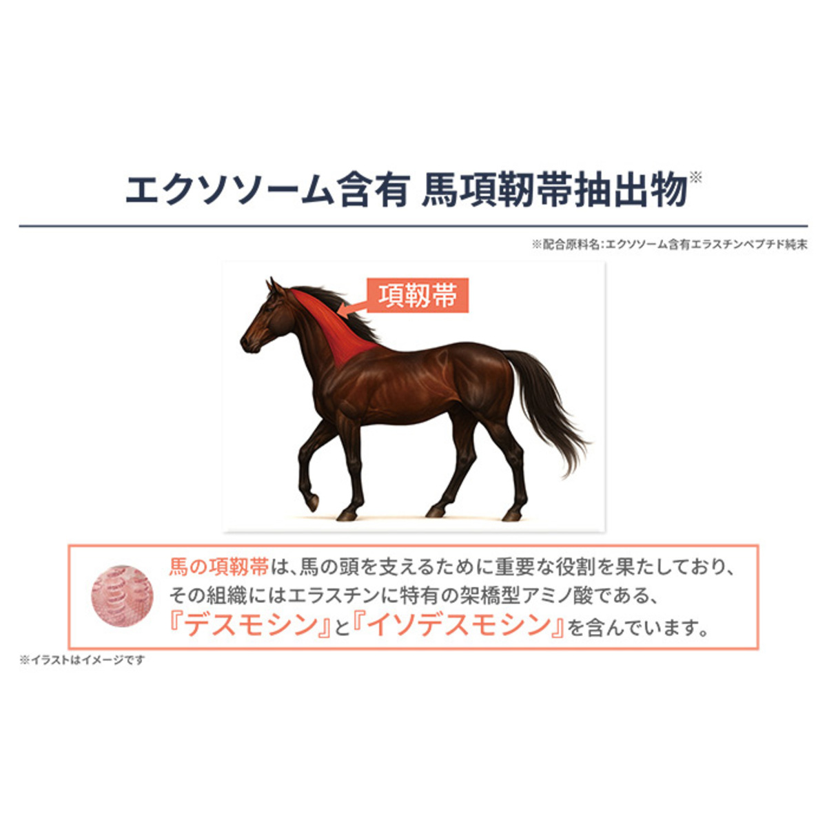本製品にはエクソソーム含有馬項靭帯抽出物を1粒あたり約120mg配合。なお、本原料にはエラスチンに含まれる特有の成分であるデスモシン・イソデスモシンを1粒あたり約1.2mg含有(原料メーカー規格値)しています(*1)