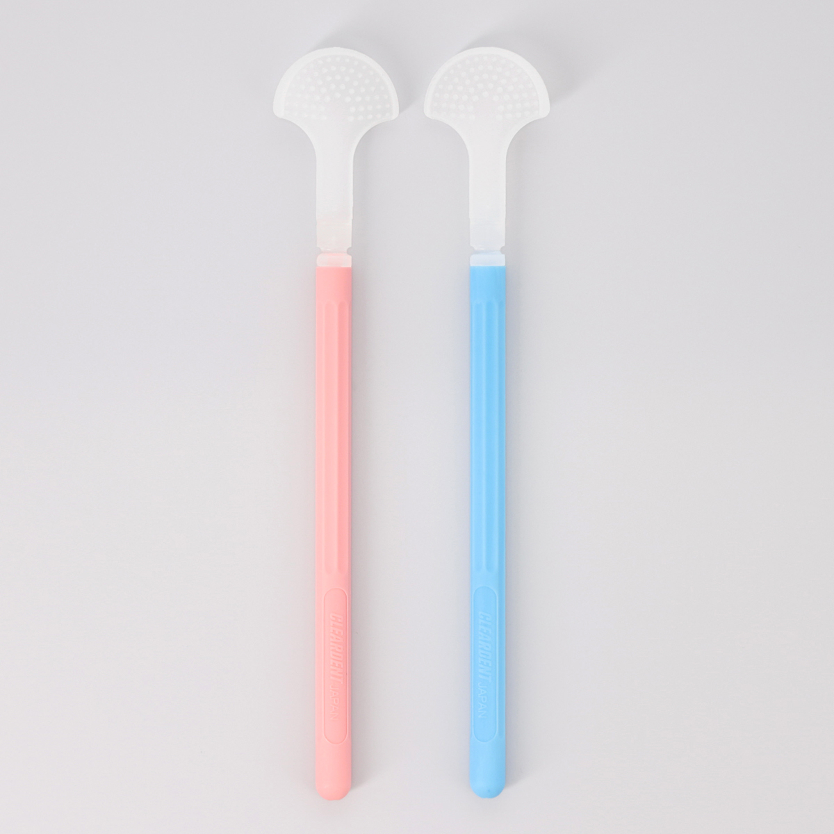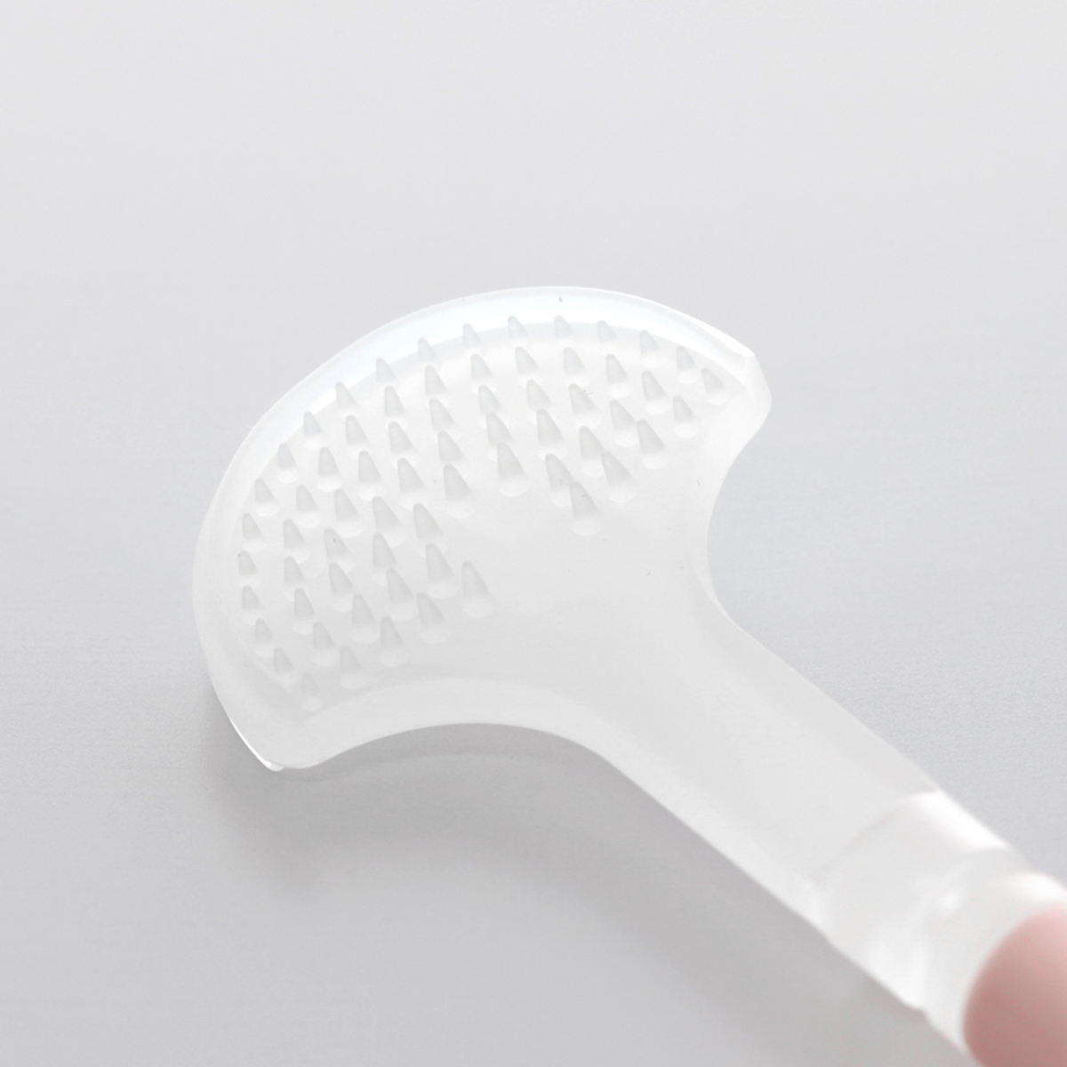 舌(とくに味を感じる敏感な味蕾)を傷つけにくく、しっかり汚れをかき出すことにこだわって開発された舌クリーナー。舌の形状に合わせたブラシ部分で汚れを浮かせてヘラ部でしっかり掬い取ります。ヘッド部とブラシの根本部分はソフトなエストラマー樹脂を採用。弾力性があり、舌にかかる負担を和らげます