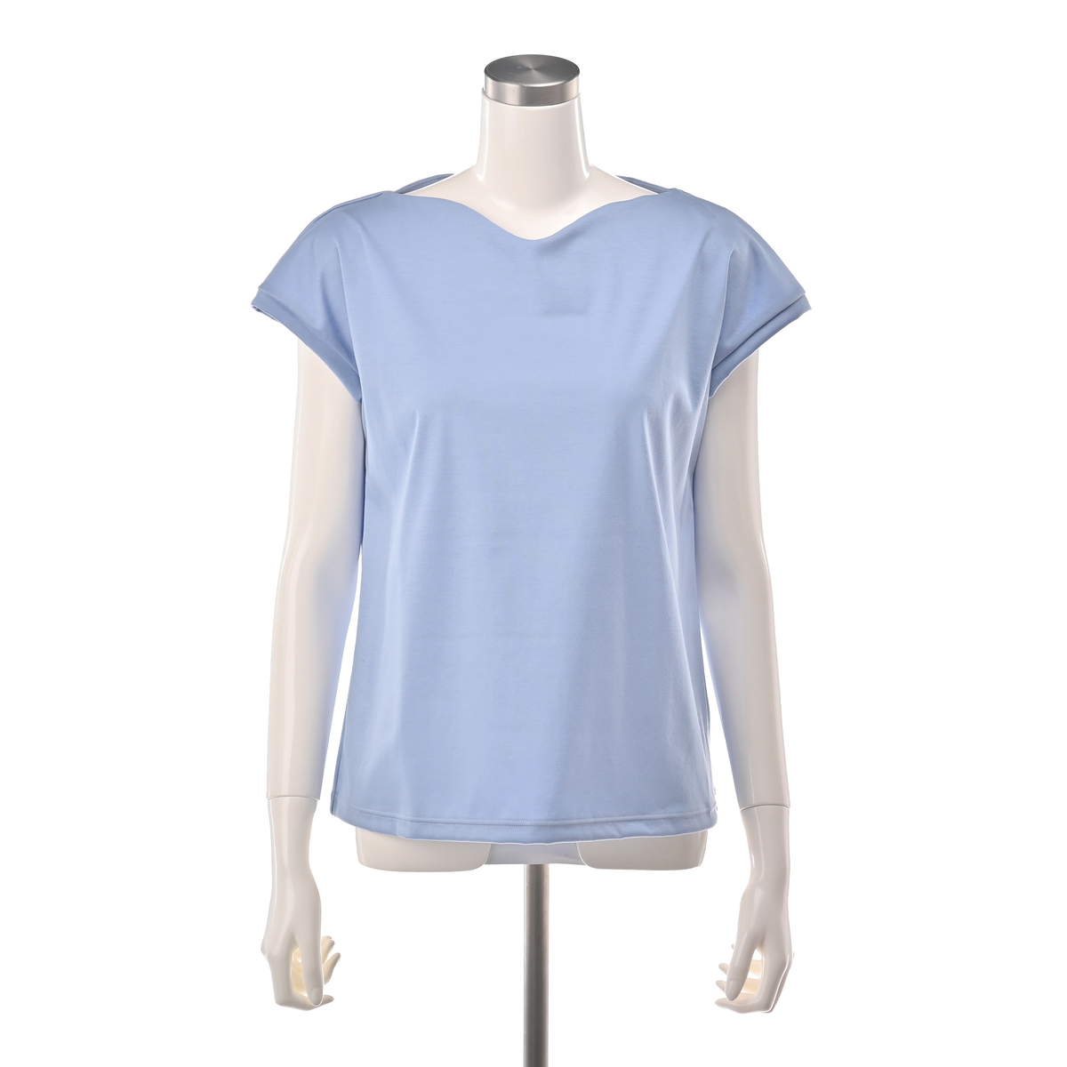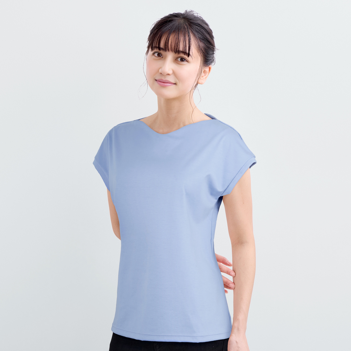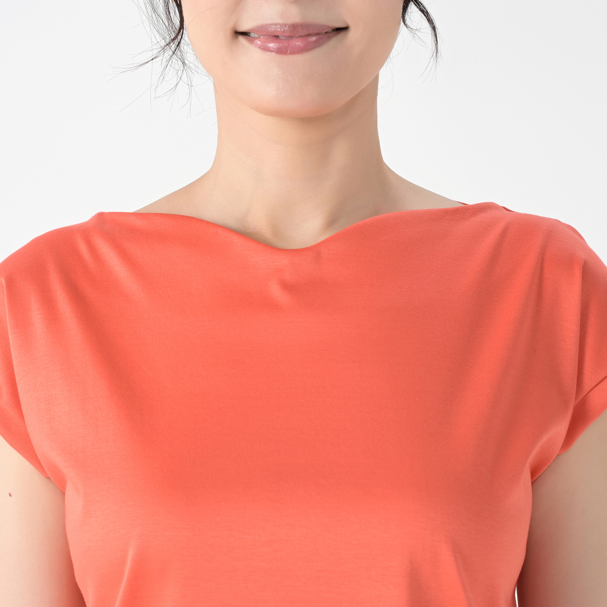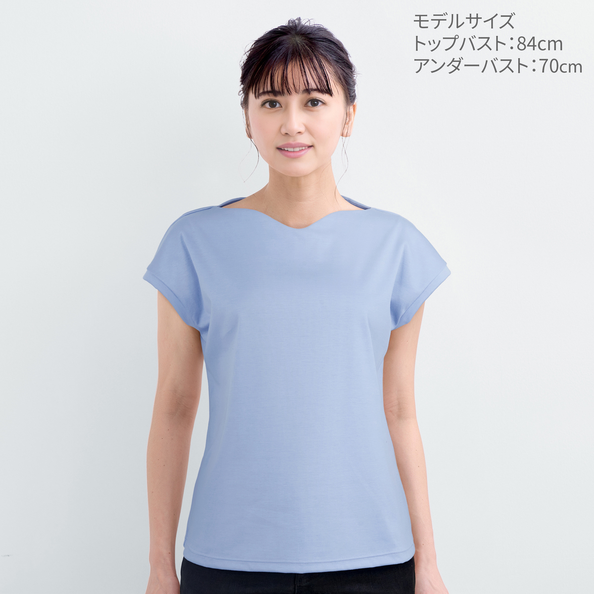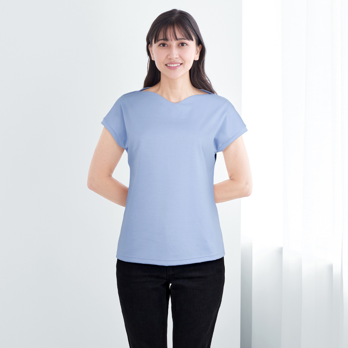 きれいめデザインのスカラネックTシャツ。曲線を描くスカラップのようなネックラインがデコルテをきれいに見せてくれます