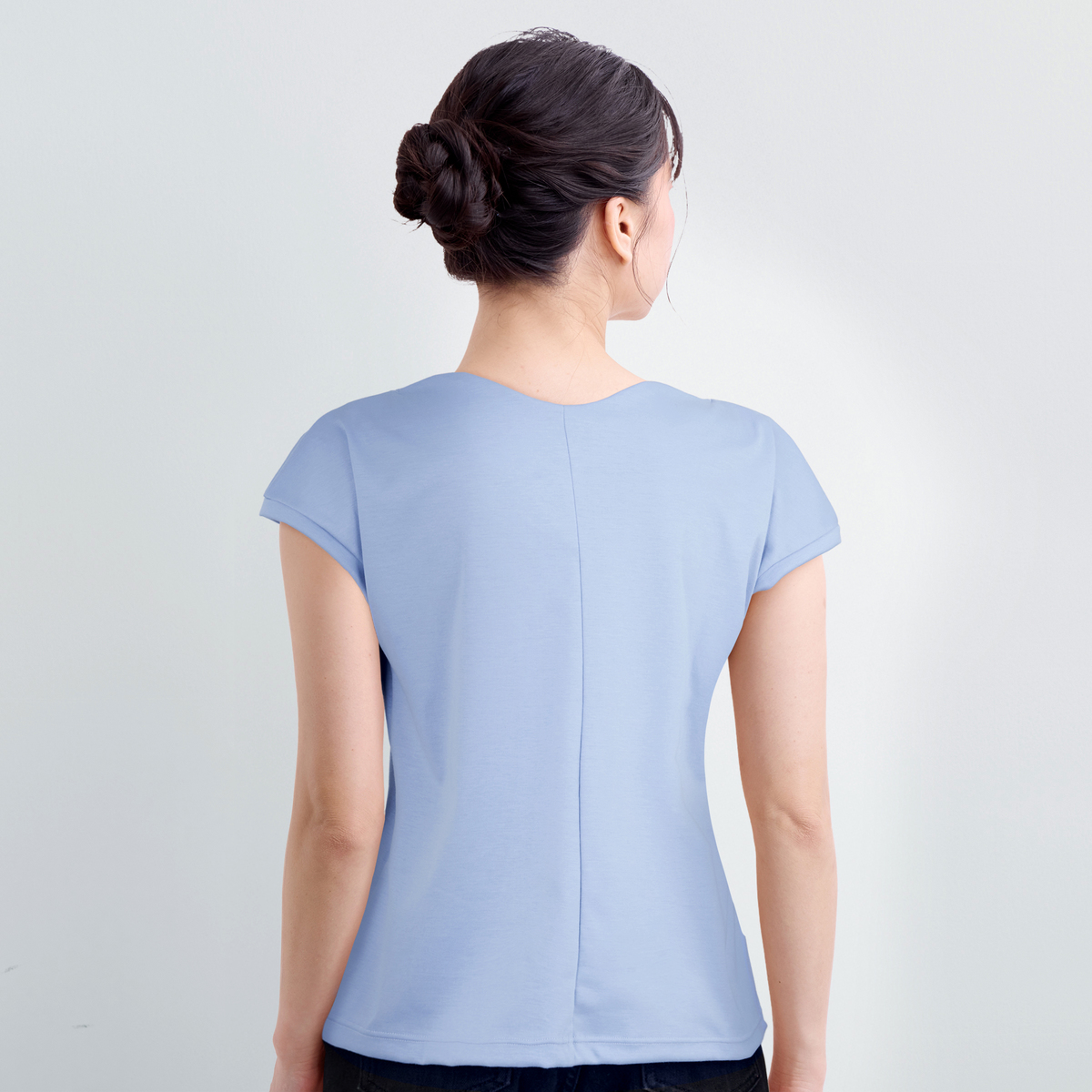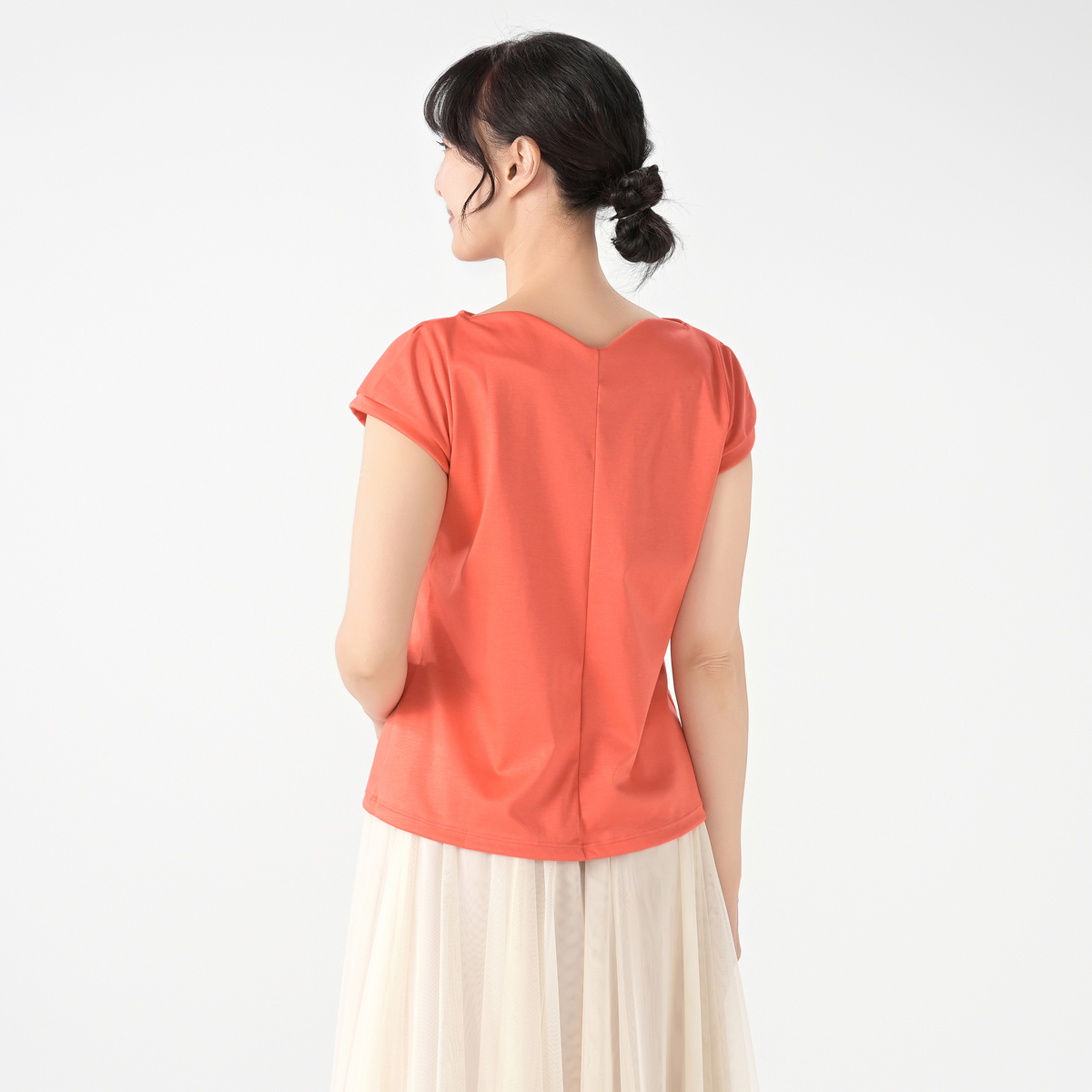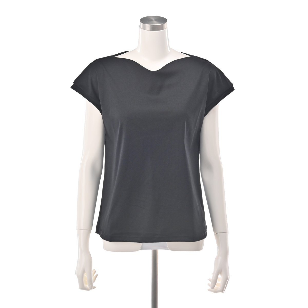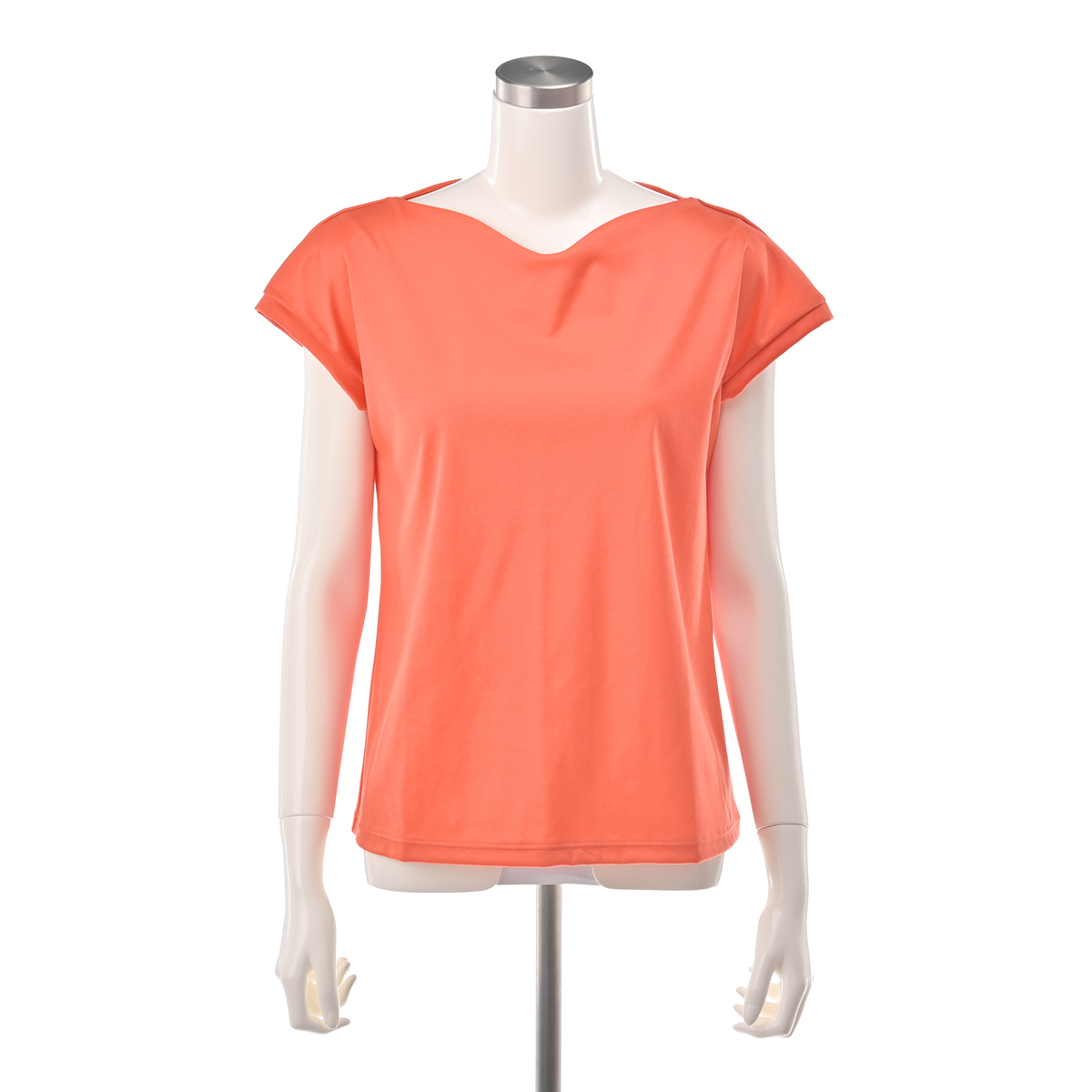 きれいめデザインのスカラネックTシャツ。曲線を描くスカラップのようなネックラインがデコルテをきれいに見せてくれます