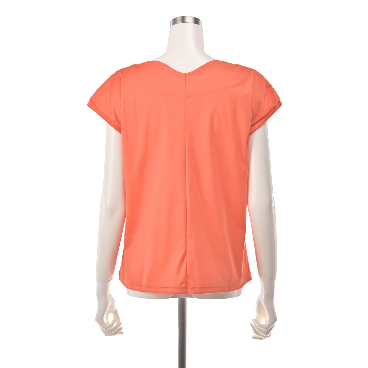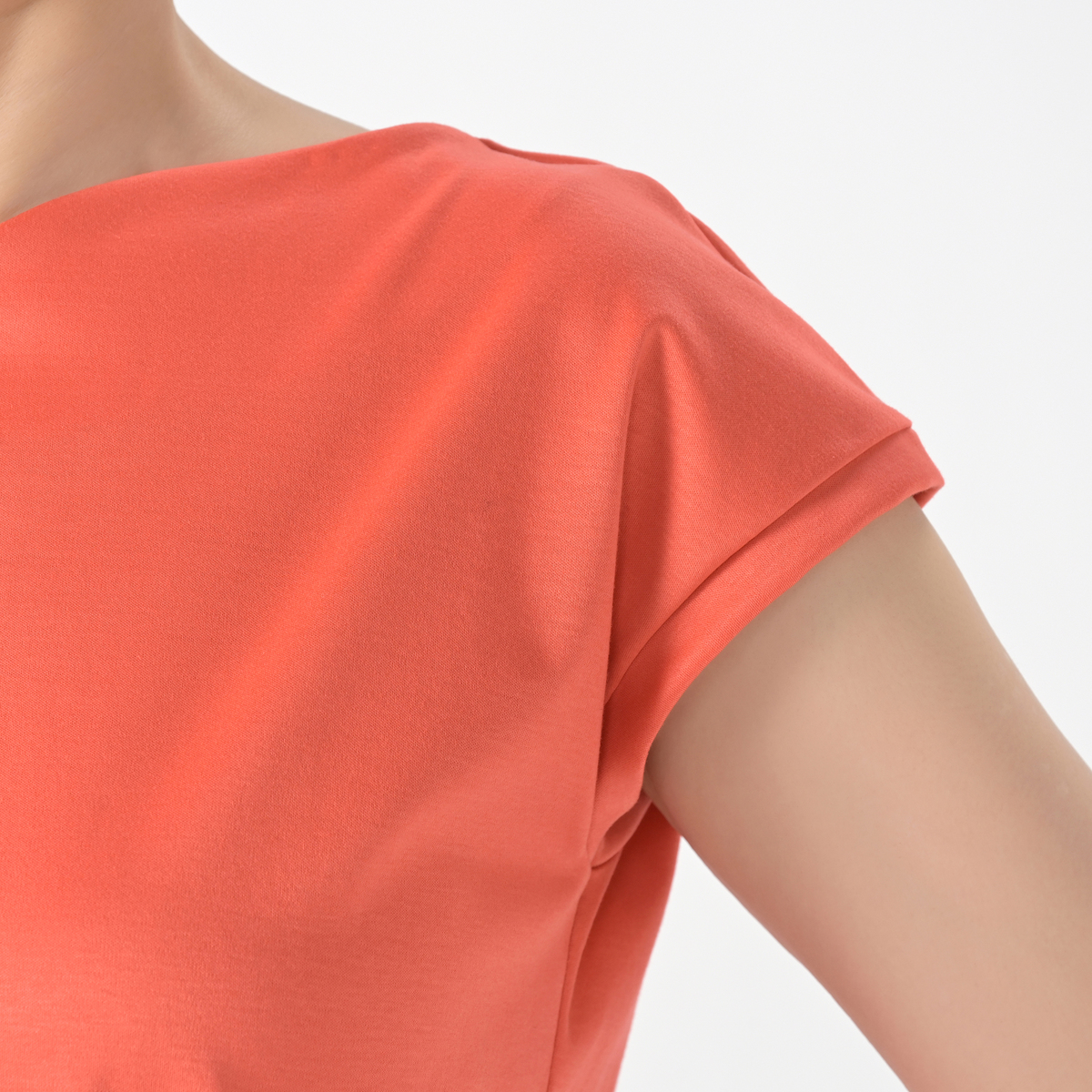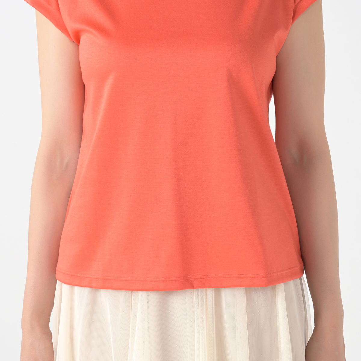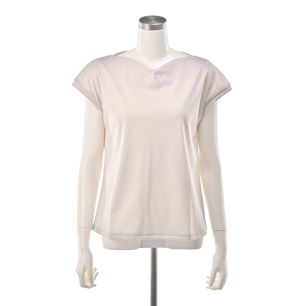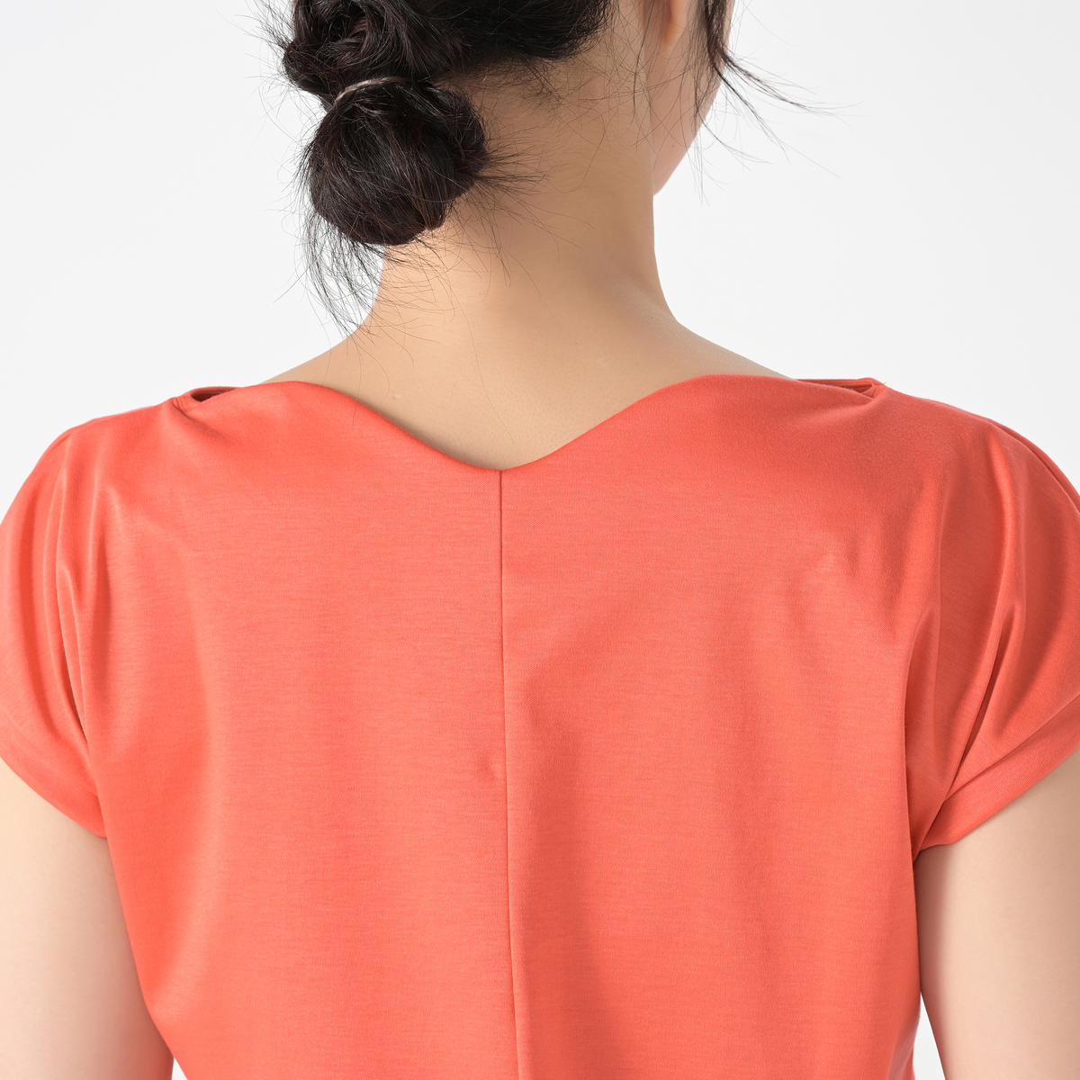 きれいめデザインのスカラネックTシャツ。曲線を描くスカラップのようなネックラインがデコルテをきれいに見せてくれます
