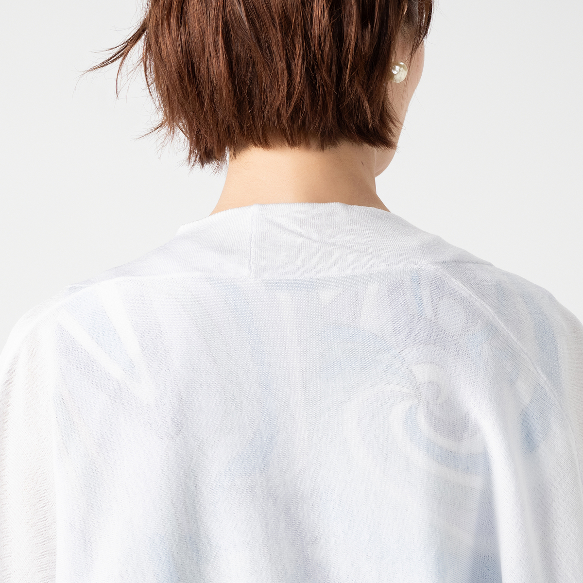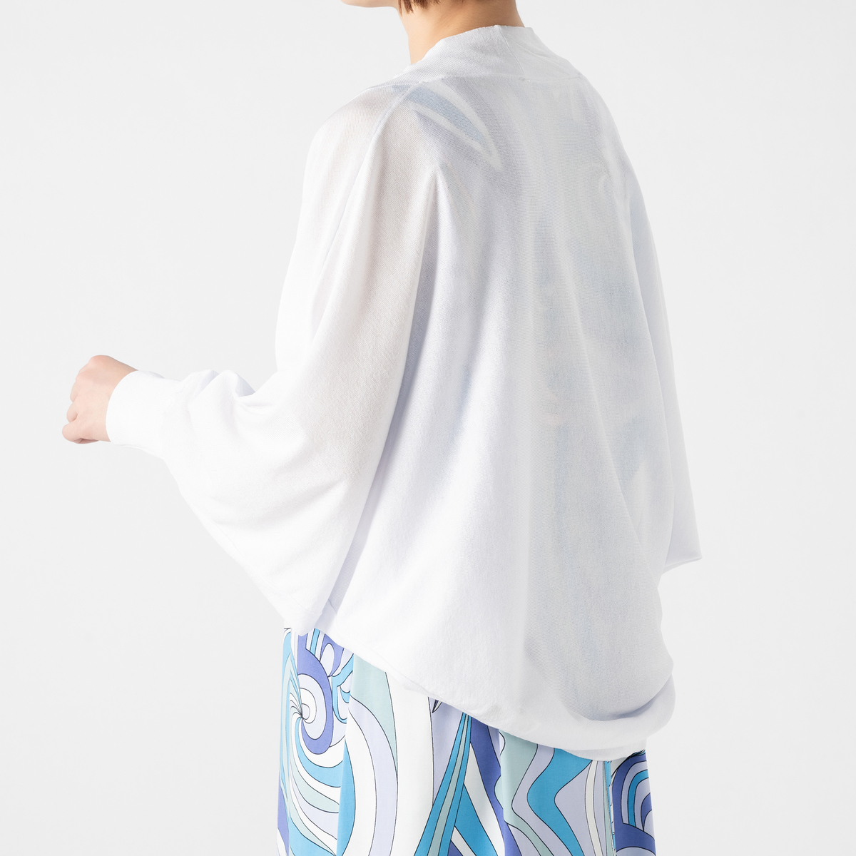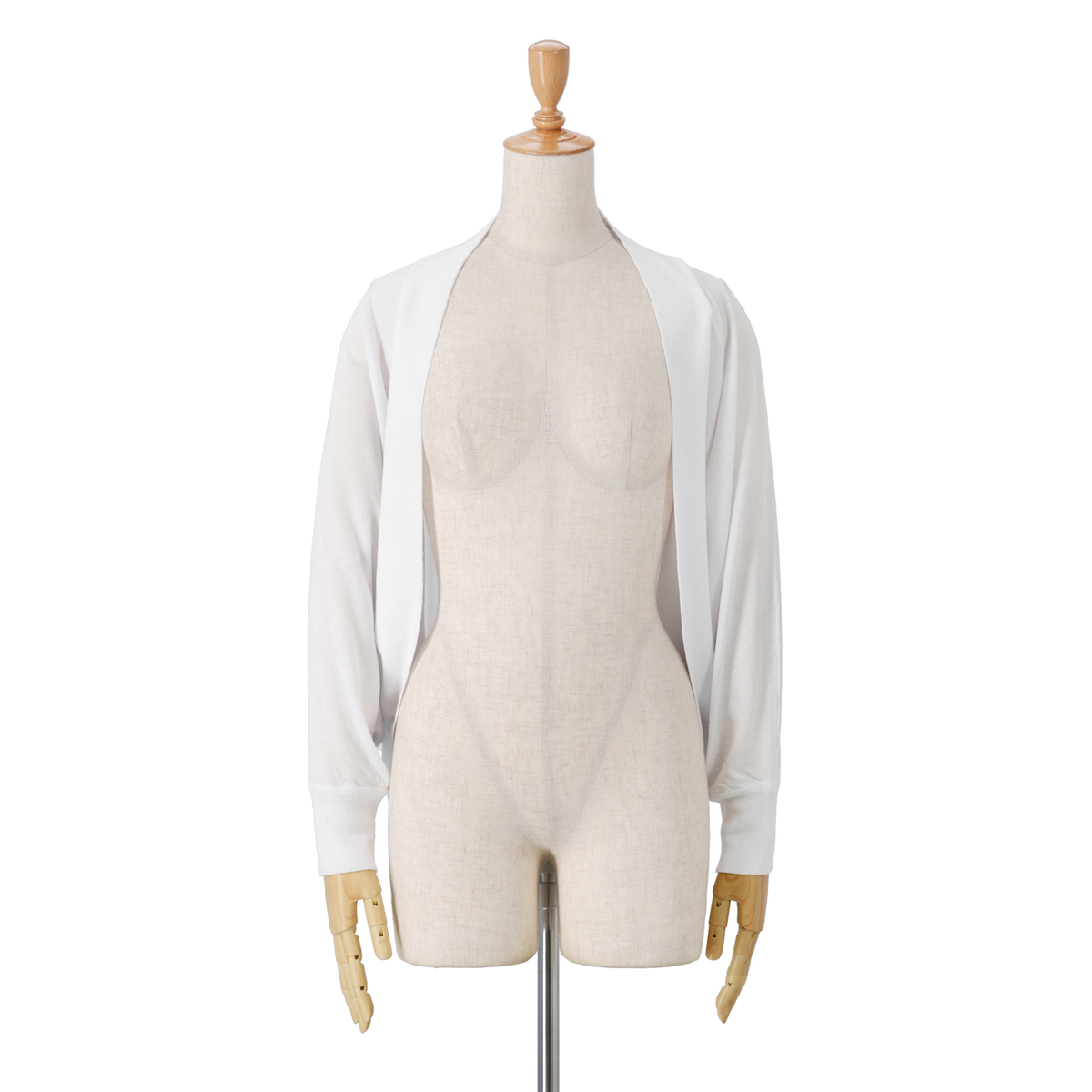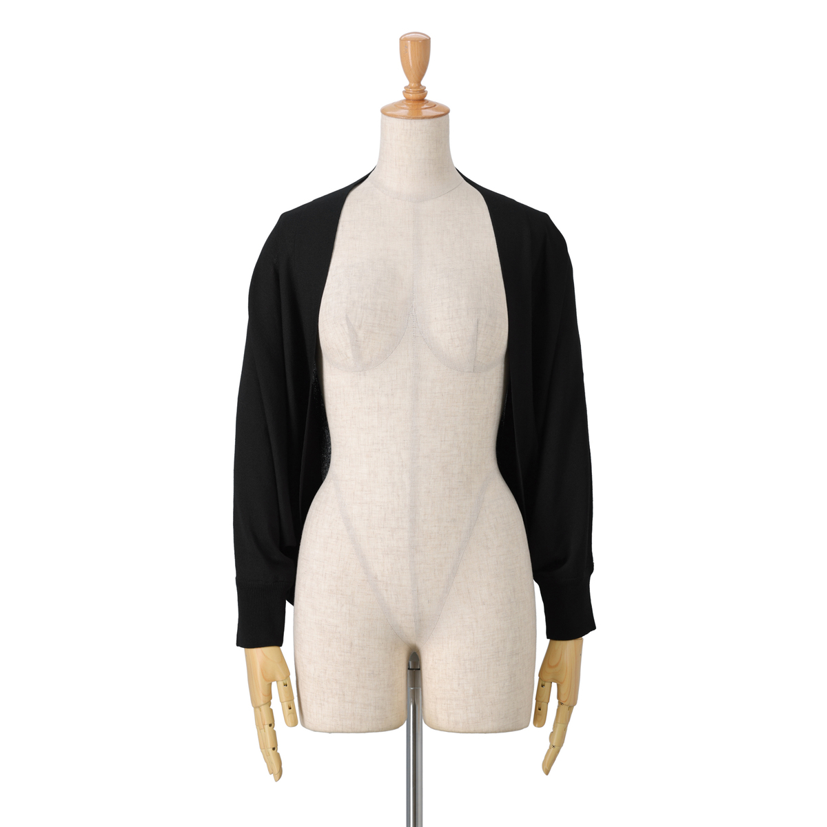 着流しタイプでゆったりしたシルエットのニットボレロ。ヒップトップを隠す程良い丈感で、上下逆さにしても着られる2WAYタイプ。ハイゲージで軽く、シアーな透け感が清涼感をプラスしています