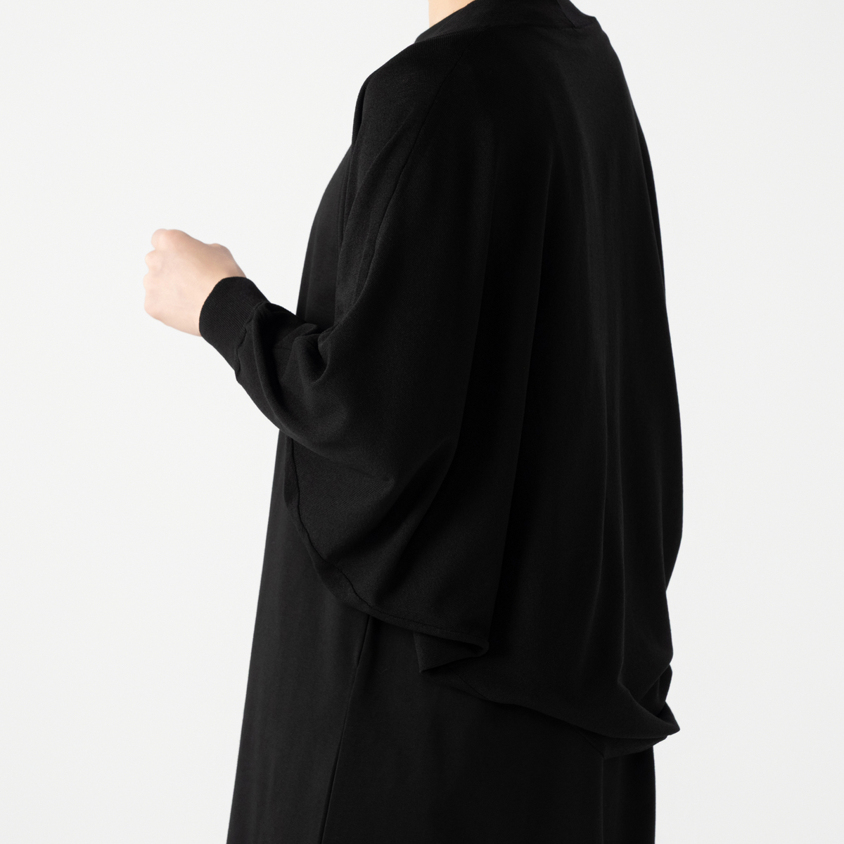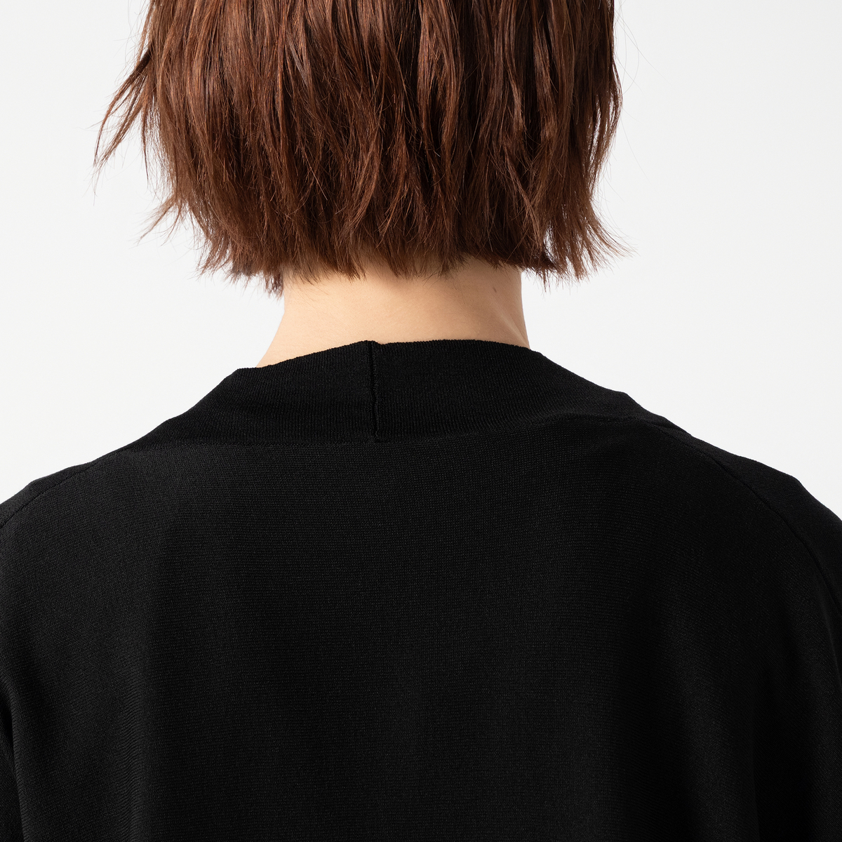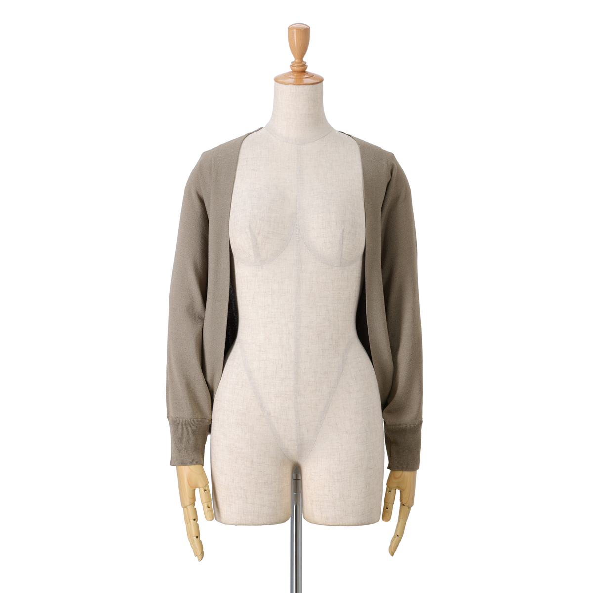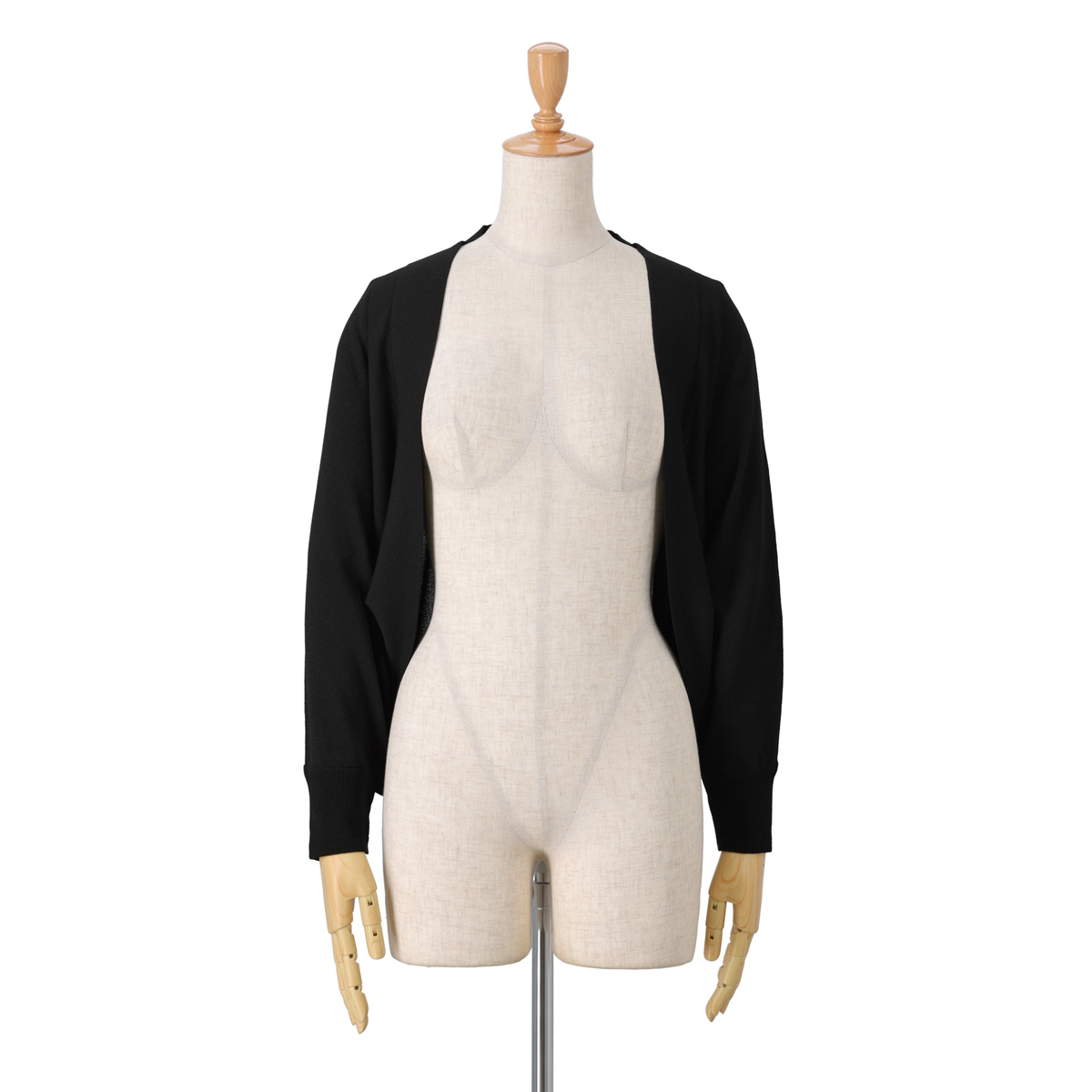 着流しタイプでゆったりしたシルエットのニットボレロ。ヒップトップを隠す程良い丈感で、上下逆さにしても着られる2WAYタイプ。ハイゲージで軽く、シアーな透け感が清涼感をプラスしています