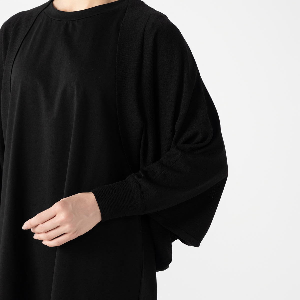 前を留めずにサッと羽織れる、ゆったりとしたシルエットのボレロです。上下逆にして短くも着られる2WAY仕様で、シアー感のある素材が清涼感を演出します。