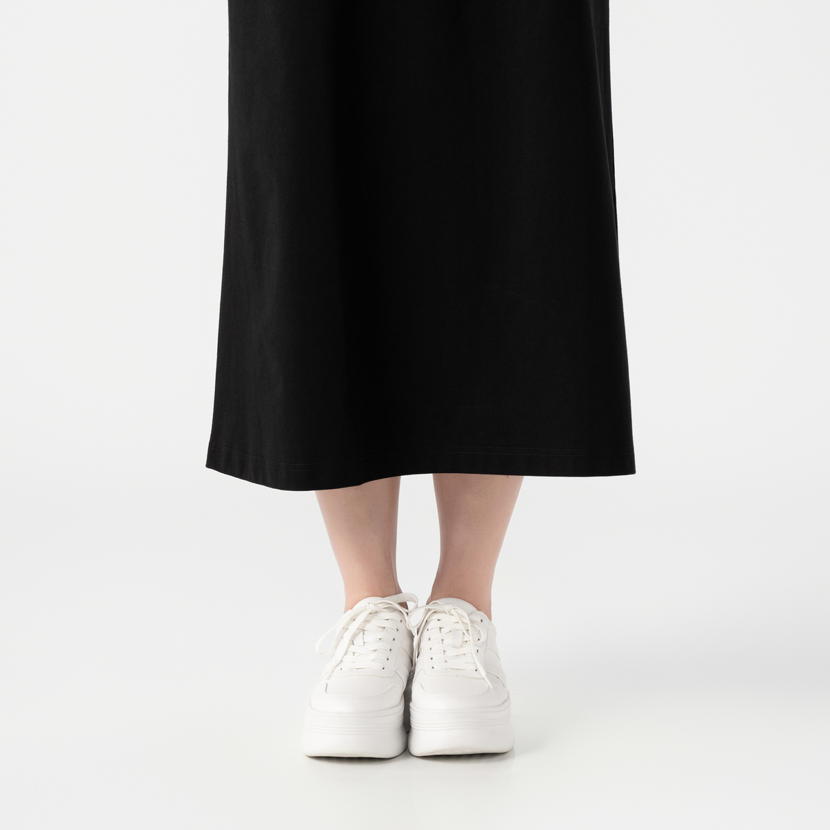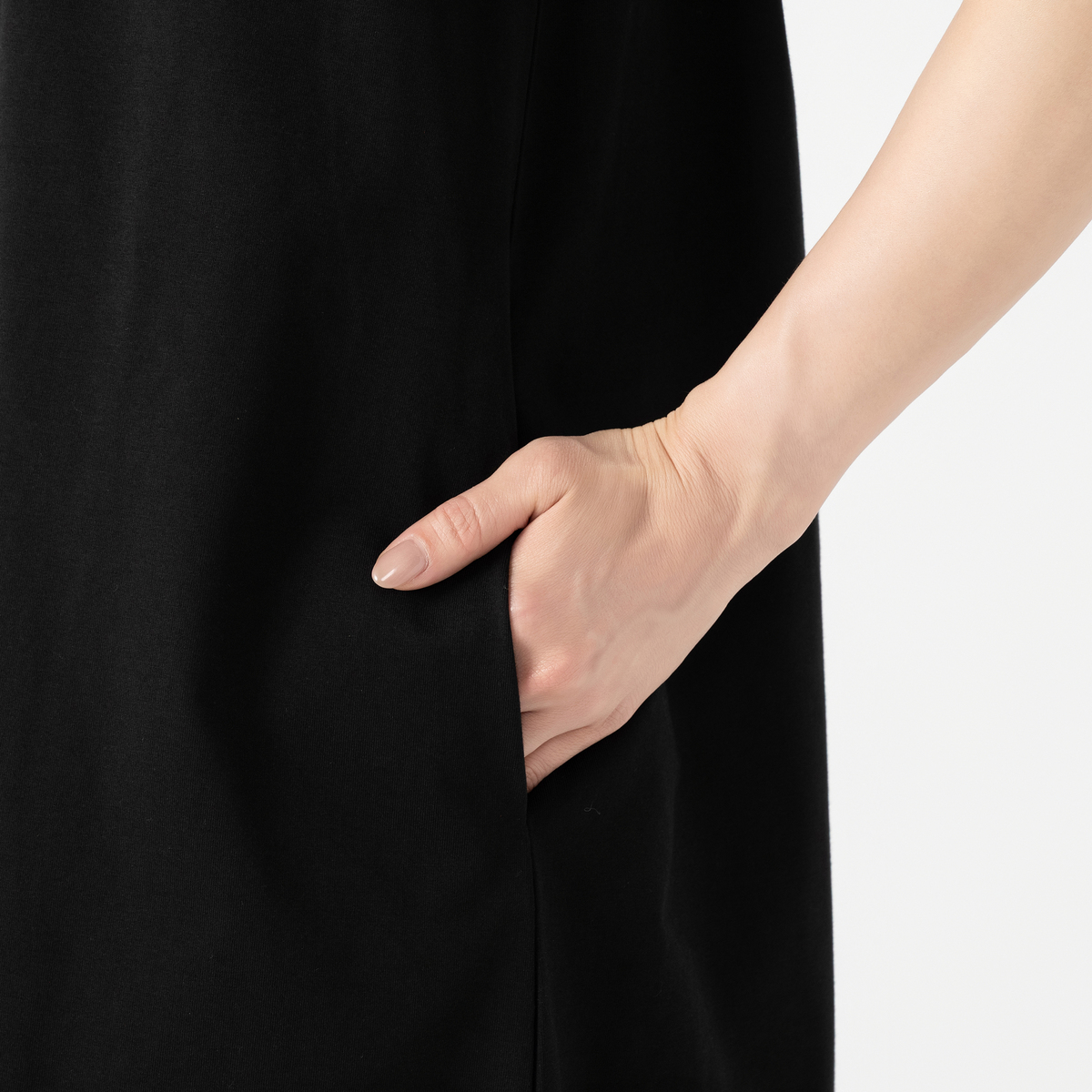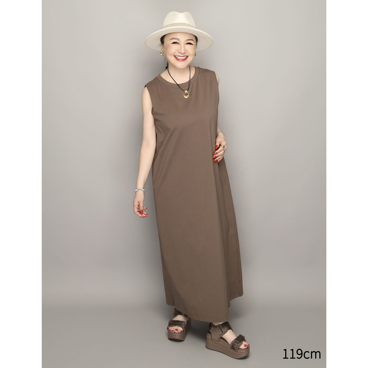 程良いボリューム感のフレアラインマキシワンピースで、ふんわりしたシルエットが体型をカバー。前後の肩部分には二の腕を隠すデザインタックを施し、両脇にはサイドポケットを付けたこなれ感のあるデザインです。ソロテックスの素材を活かしたシンプルなラウンドネックラインで、一枚でサマになり、抜け感のある装いを演出します
